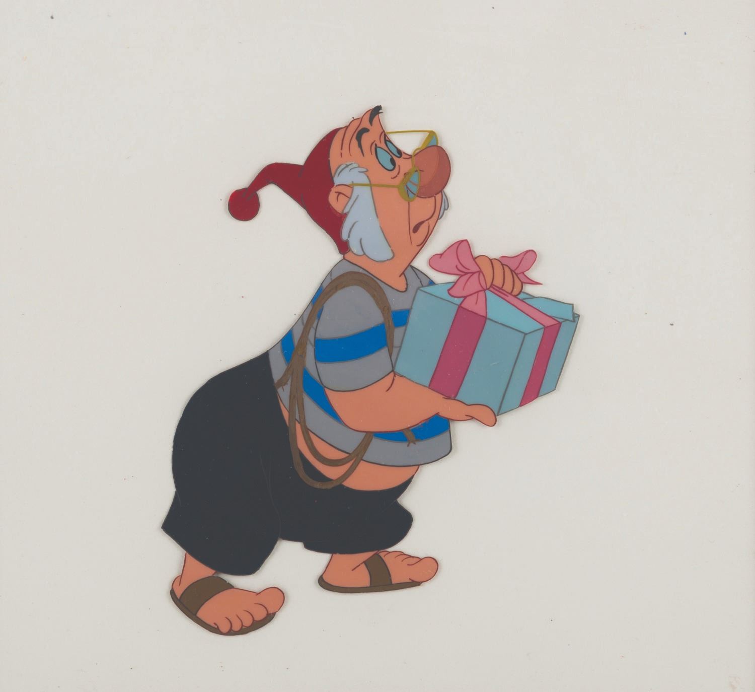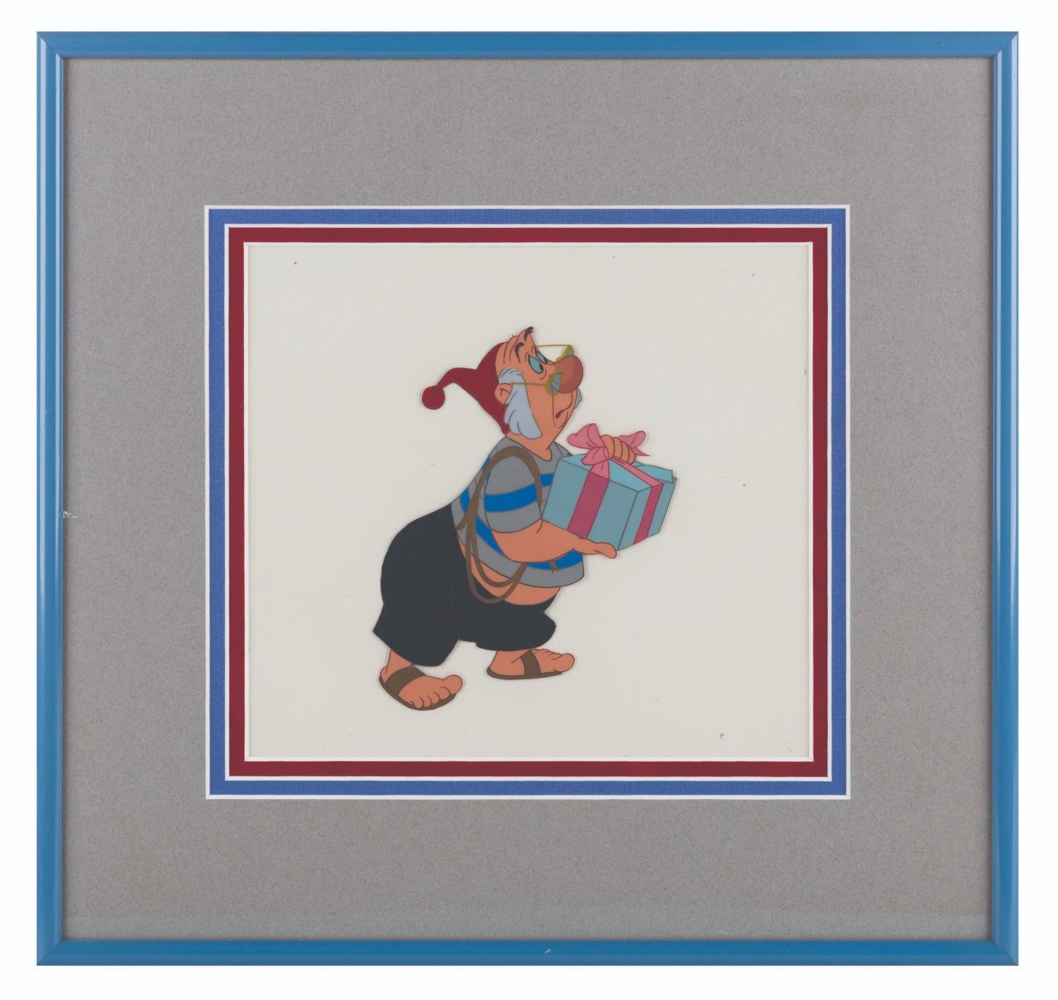 (Disney, 1953) An original production cel of Mr. Smee from "Peter Pan." This cel was sold at the Disneyland Art Corner, and comes with the original Art Corner gold label on the back of the matte. Mr. Smee has an image size of 4” x 5.25” on a 7” x 7.5” visible cel. The entire framed and matted piece measures 12.75” x 13.25”. The cel is in good condition with light scratches, spots of paint loss, and wear from production use. The framed matte is in very good condition with light wear.