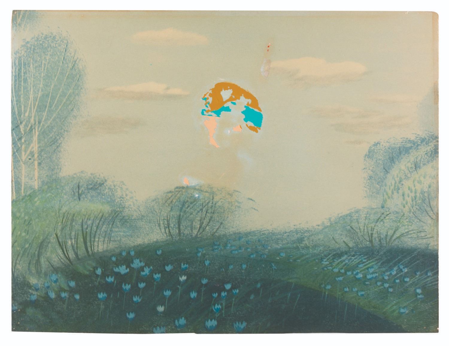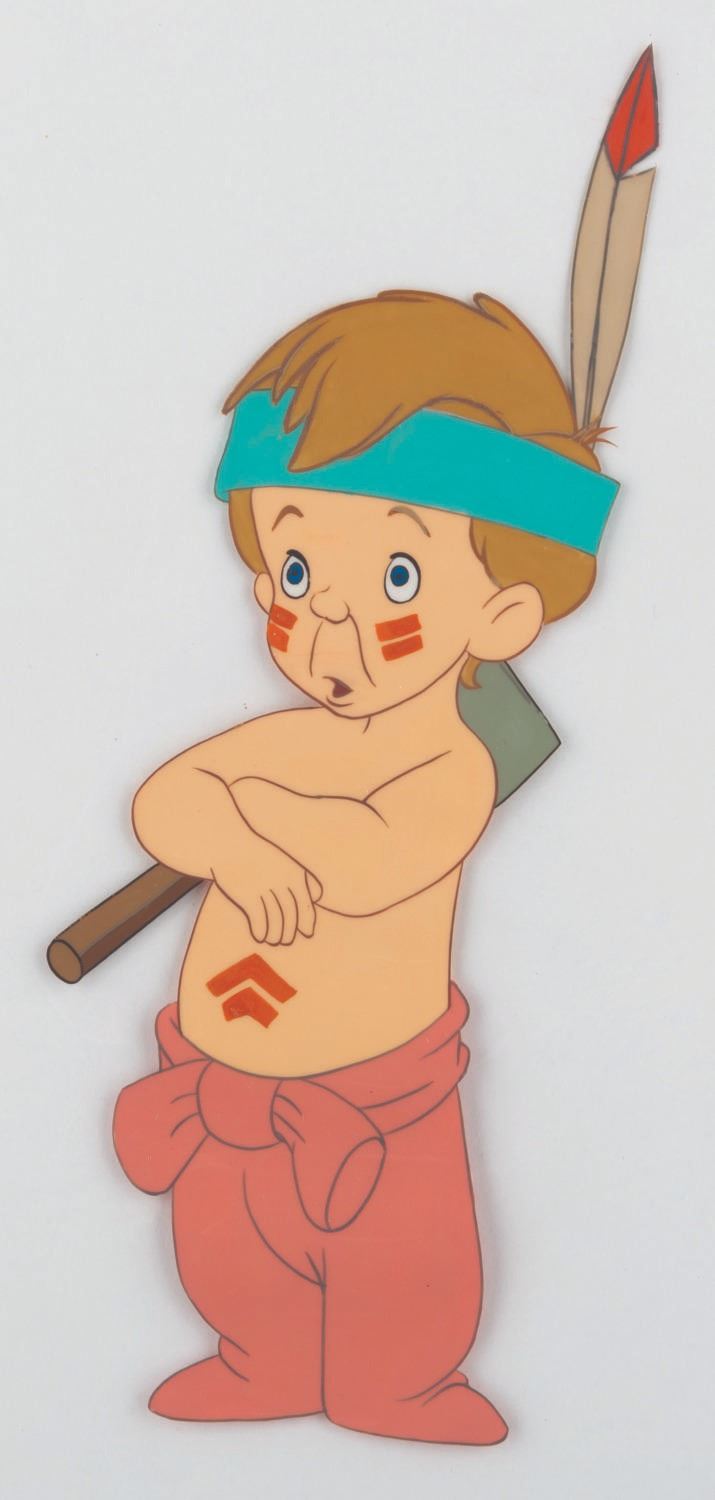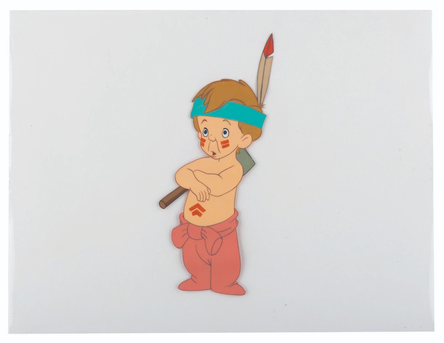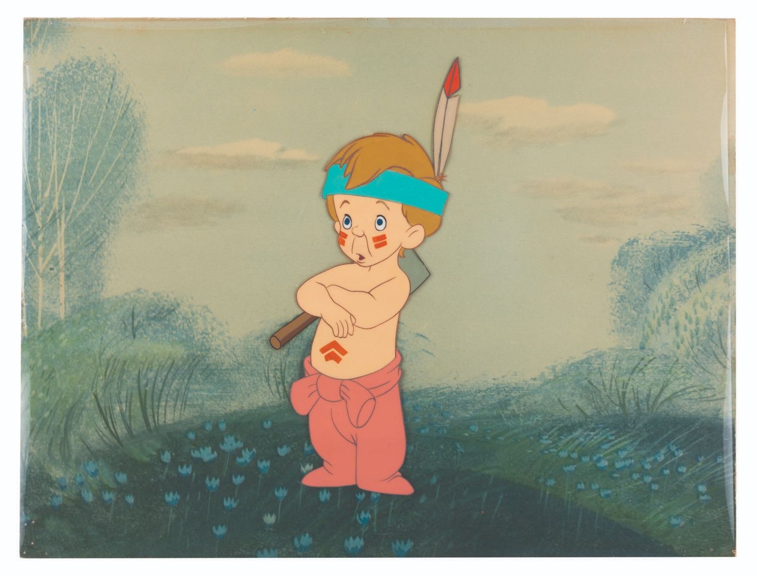 (Disney, 1953) An original production cel of Michael Darling as an Indian brave from the animated feature "Peter Pan." This hand-painted cel was originally sold at the Art Corner in Disneyland. Michael has an image size of 3.25" x 7.75" on a 9" x 12" trimmed cel, paired with a color copy background. The piece is in very good condition with light waviness, scratches, paint transfer on the background, and pinholes from production use.