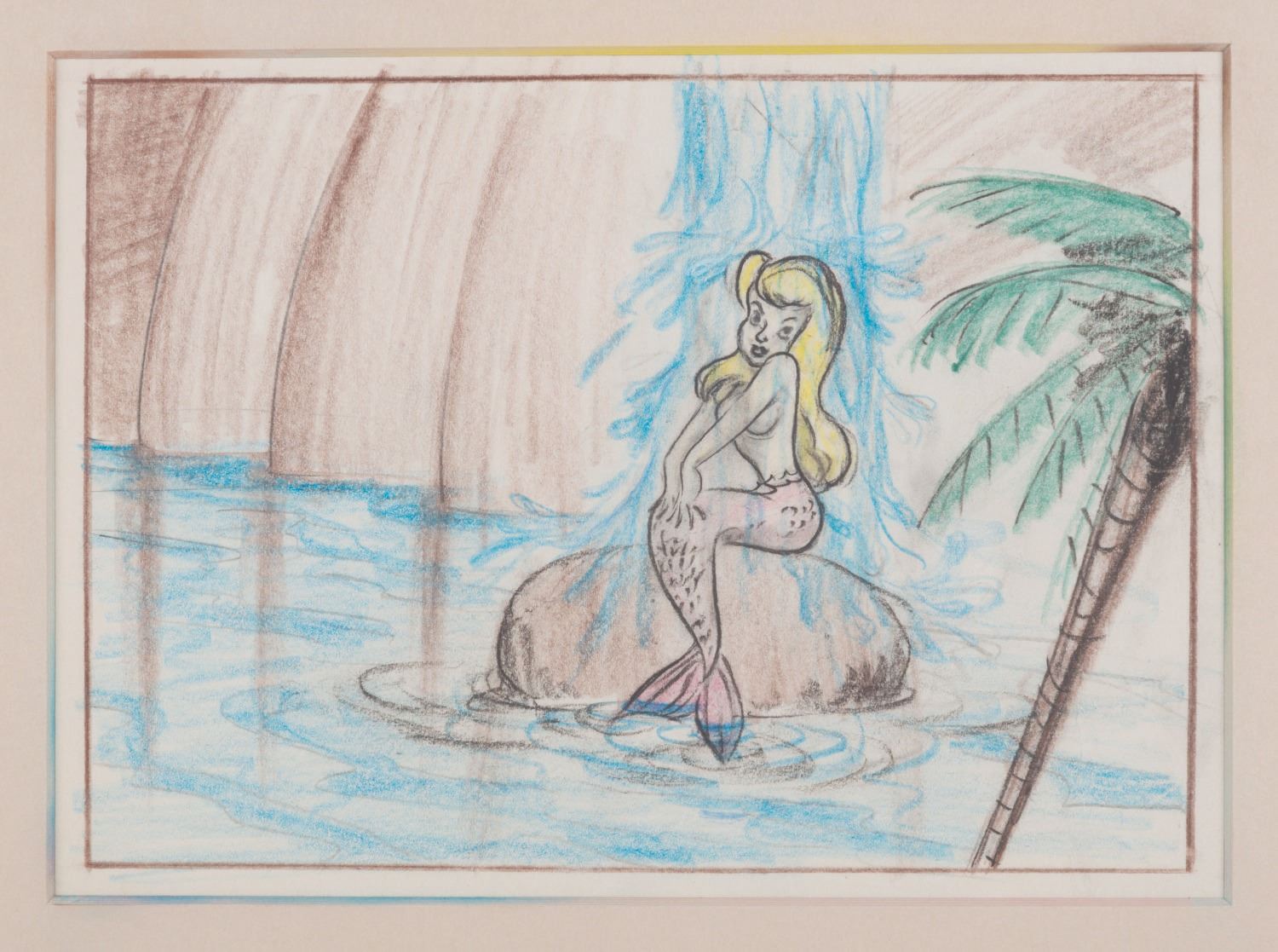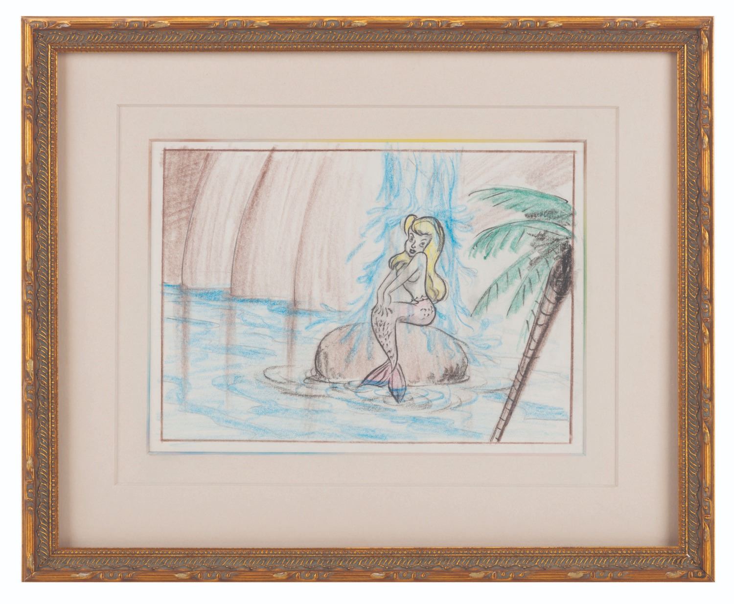 (Disney, 1953) An early "Peter Pan" storyboard panel of a beautiful Never Land mermaid sitting on a rock under a waterfall. The mermaid has an image size of 5.25" x 7.5" in a 5.75" x 7.75" visible window. The entire framed and matted piece measures 10.25" x 12.25". Accomplished in graphite and colored pencils, the drawing is in fine condition, while the frame is in good condition with light scratches, scuffs, and wear.