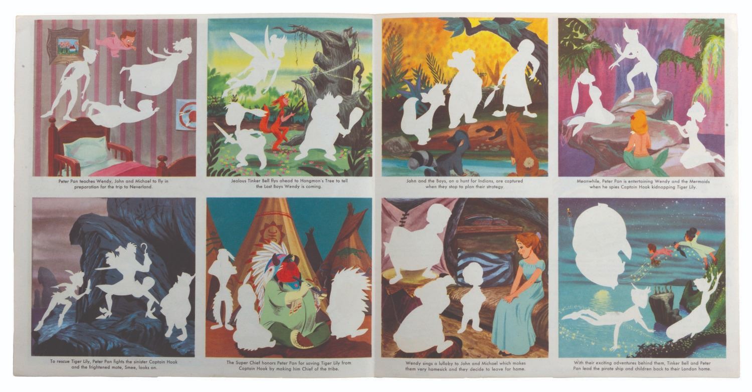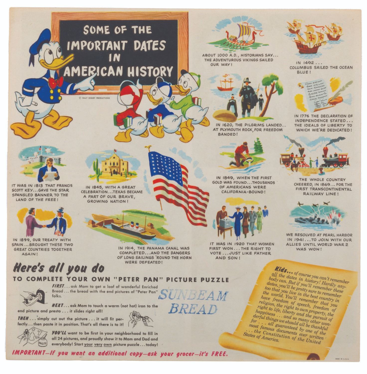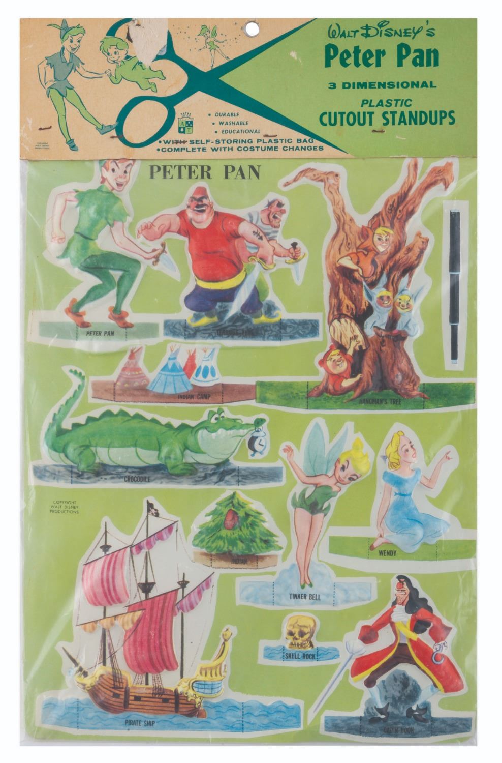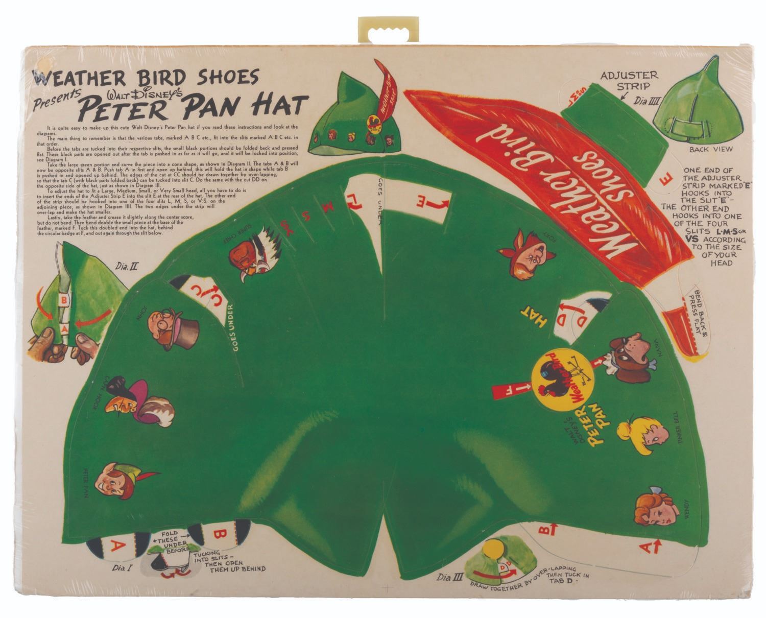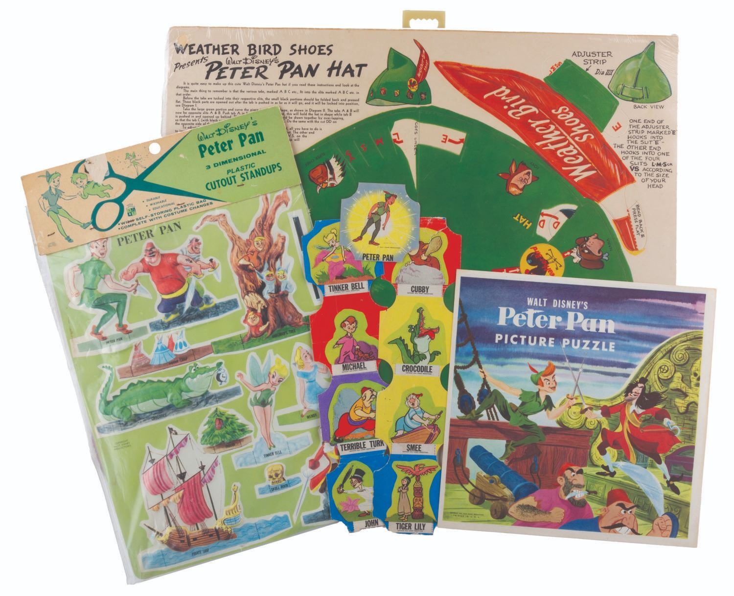 (Disney, 1950s-60s) A collection of “Peter Pan” toys and promotional items. Included is a set of plastic cutout standups sealed on the original card, a Weather Bird Shoes paper Peter Pan Hat, a Picture Puzzle album for labels from Sunbeam Bread, and a collection of nine character bread labels including one that matches the album, and eight from a later version. Measuring up to the 13.5” x 18” hat, the pieces are overall in very good condition, with light wear from age and handling, and a 1” spot of paper wear to the card of the stand ups.