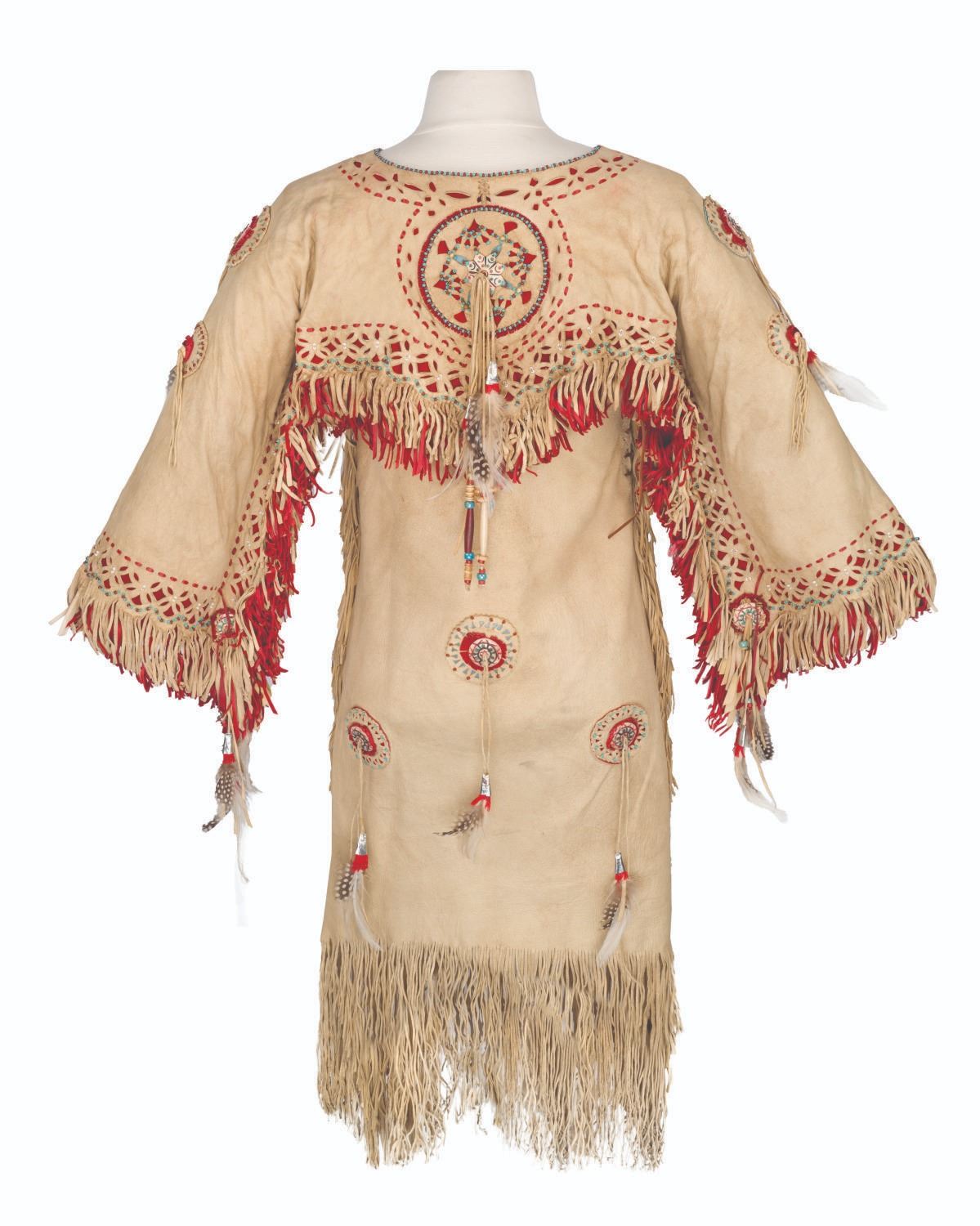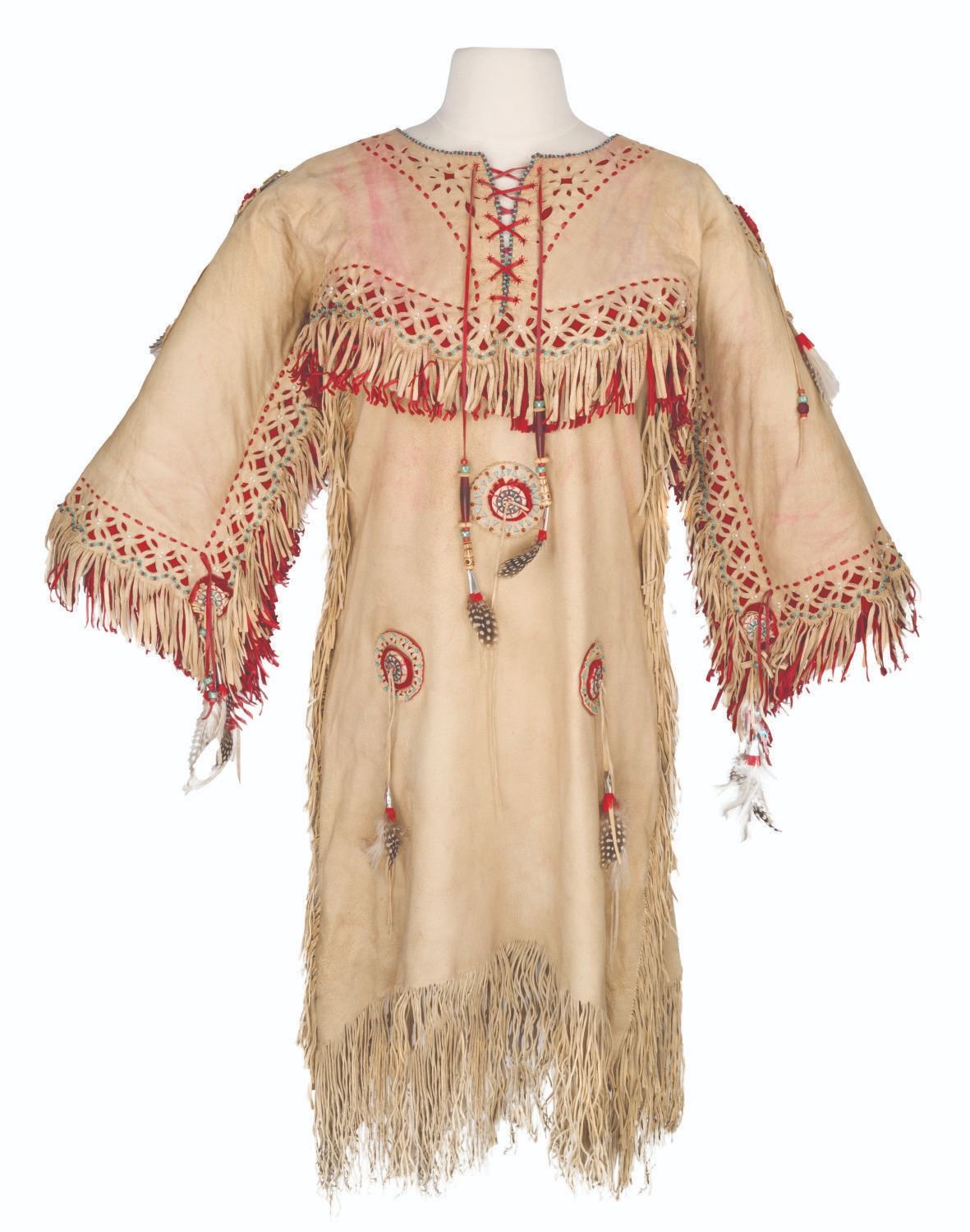 (Universal/Revolution, 2003) A Tiger Lily Costume from Revolution's Peter Pan motion picture. The costume was worn by Canadian Haida Tribe actress Carsen Leigh Gray during the 2003 production of P.J. Hogan's Peter Pan. The costume retains some hand-annotation regarding cleaning instructions; "harness dry only" and "water spray." The costume was released through Revolution Online Auctions and comes with its official Certificate of Authority. Measuring 35" long (not including the leather fringes), the wardrobe piece is in fine condition with some red stains from exposure and age, and few signs of wear from production.