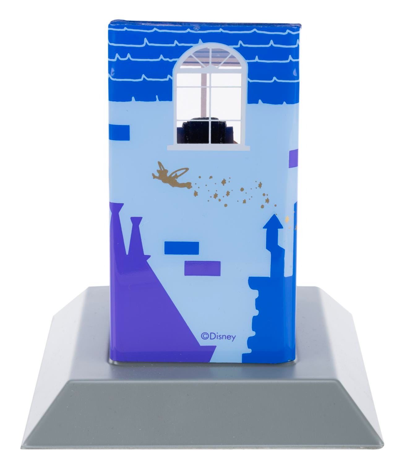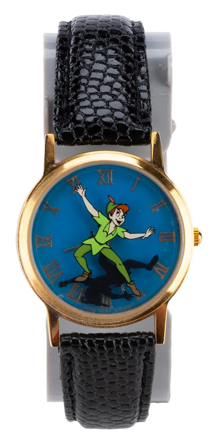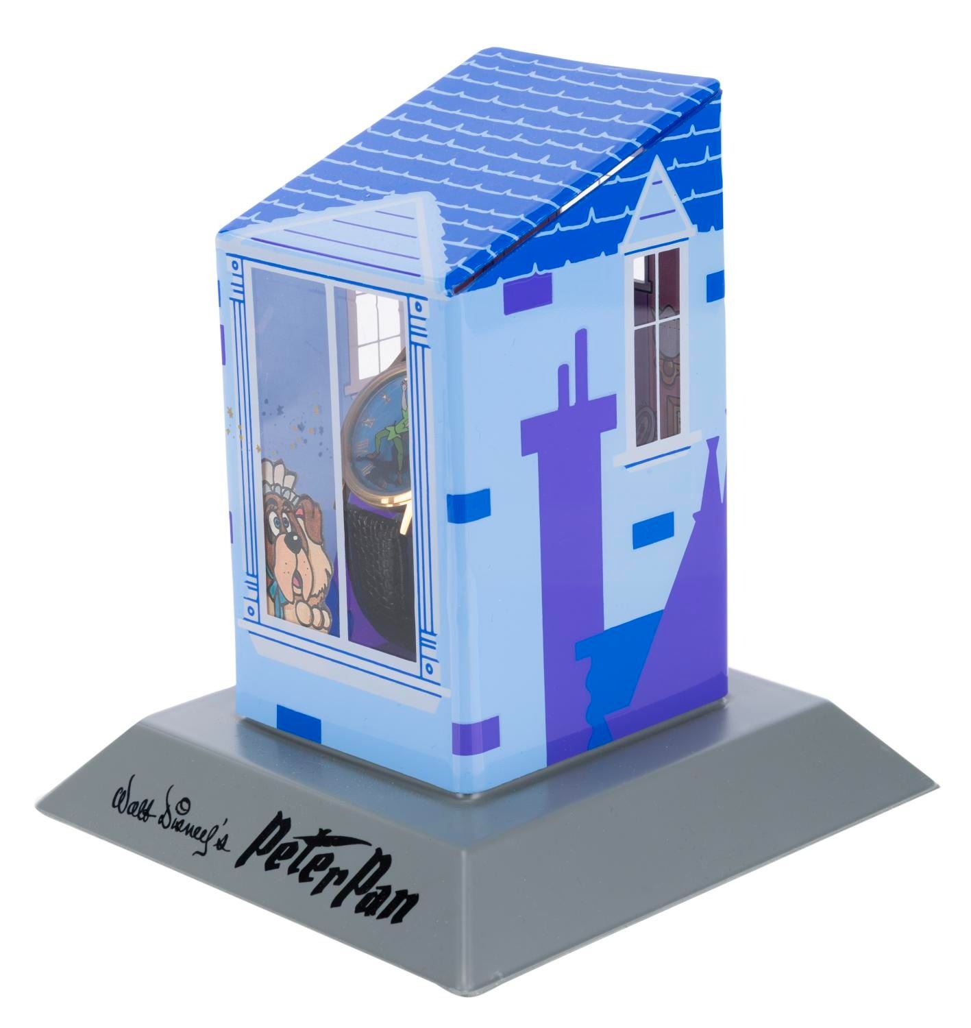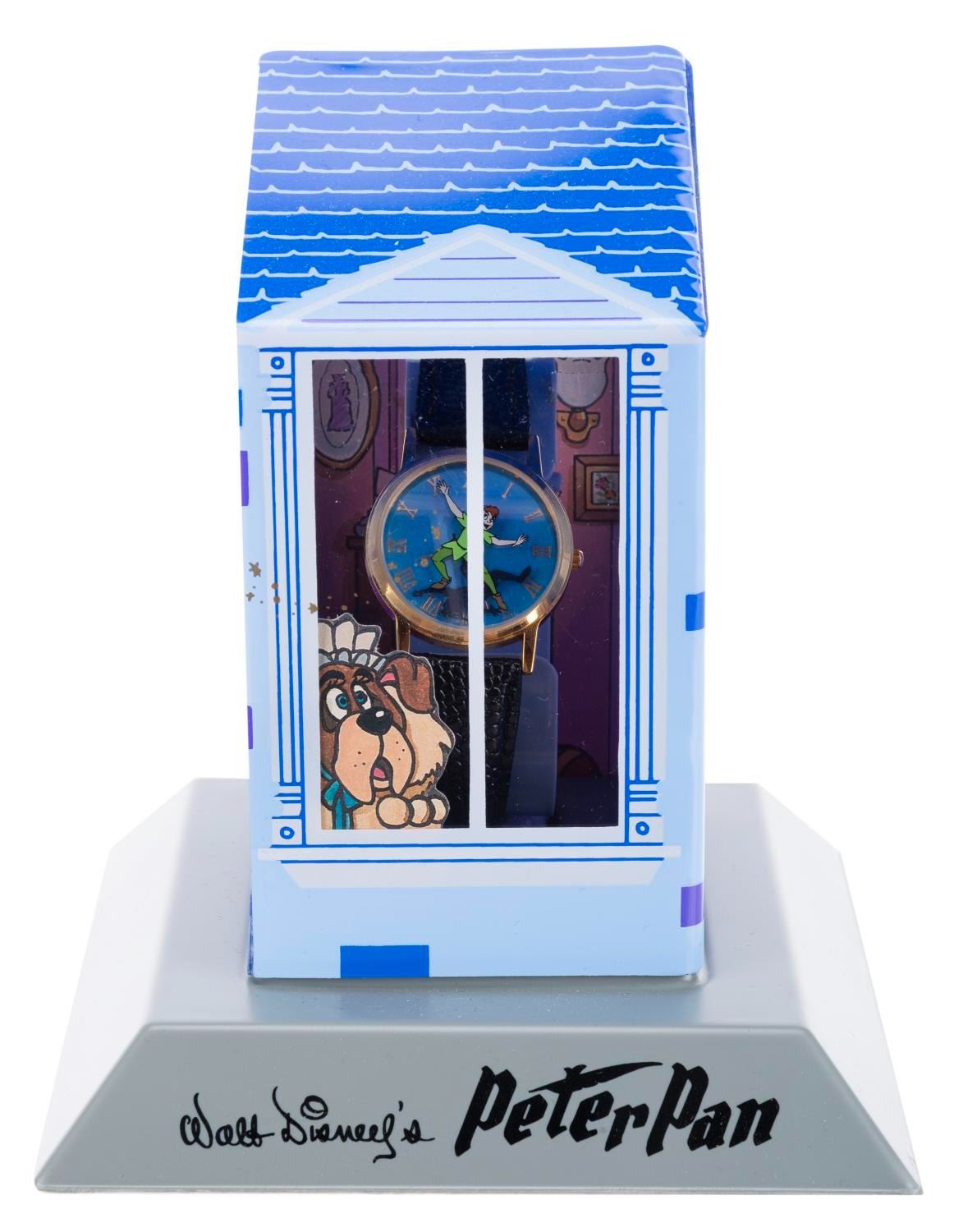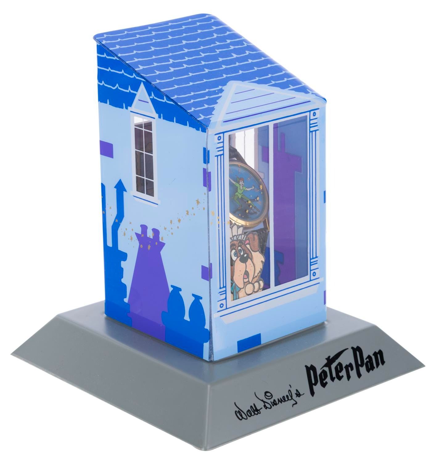 (Disney Store, 1990s) A "Peter Pan " wristwatch featuring a display case inspired by the Darling family's home and bedroom, numbered 1729 in an edition of 7500. Measuring 5.5 " x 5.75 " x 6.25 " tall in the display case, the watch is in very good, unused condition with age-related wear, including splits and deterioration of the strap, and will require a battery and possibly service to function. The display case is in very good condition, with a broken watch mounting bracket.