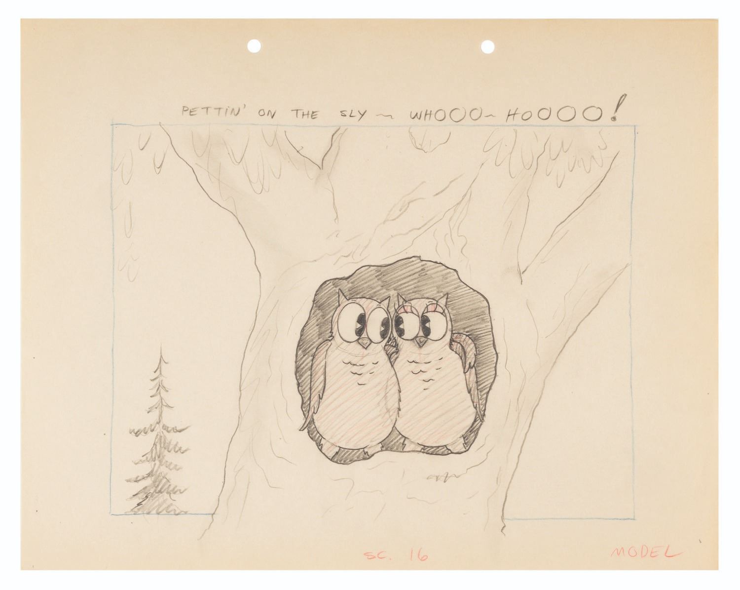 (Schlesinger 1934) An original story drawing for the Merrie Melodies “Pettin’ in the Park.” With an image size of 6.75” x 9” on 9.5” x 12” animation paper, the graphite and colored pencil drawing is in very good condition with light edge wear and discoloration from age.