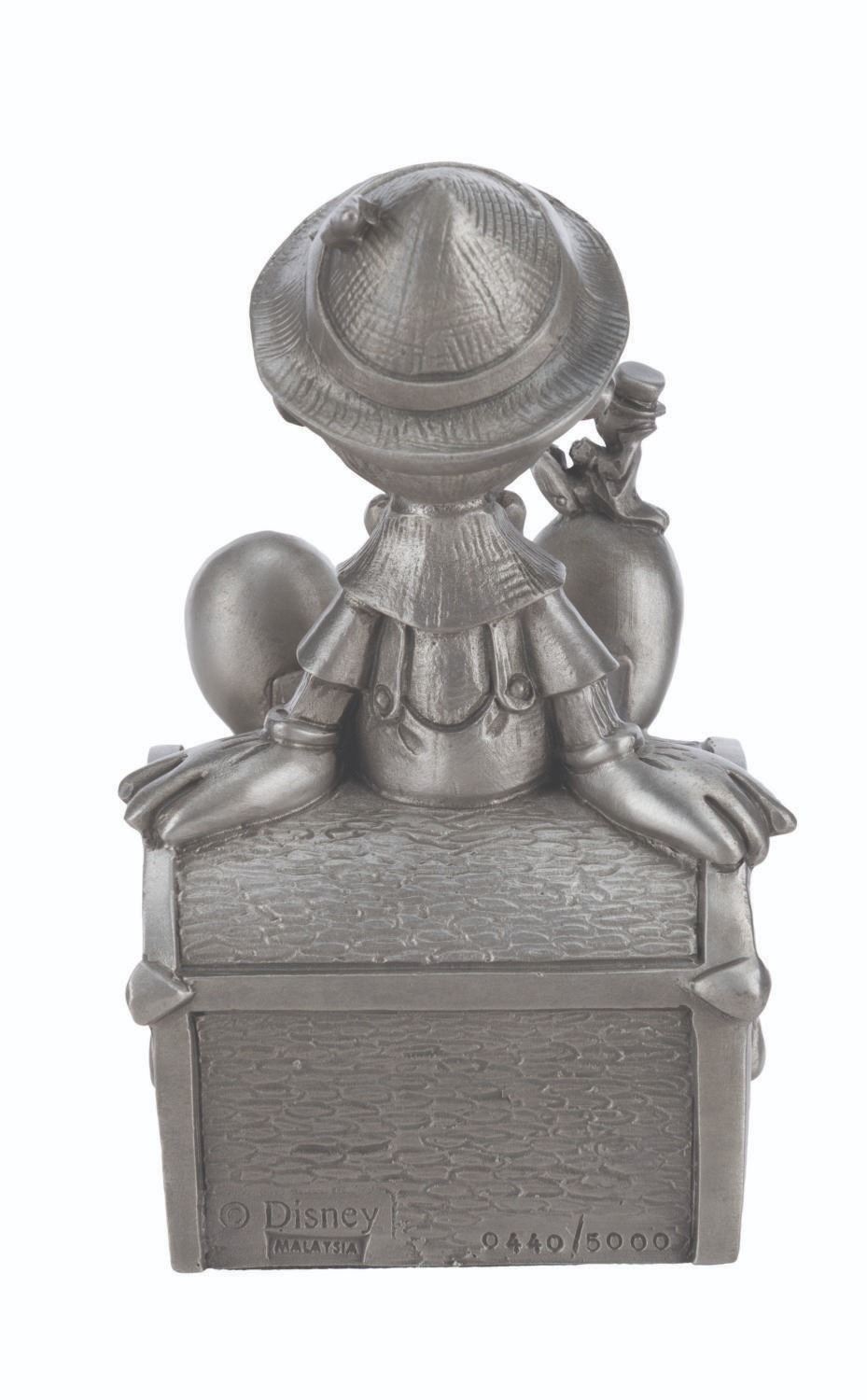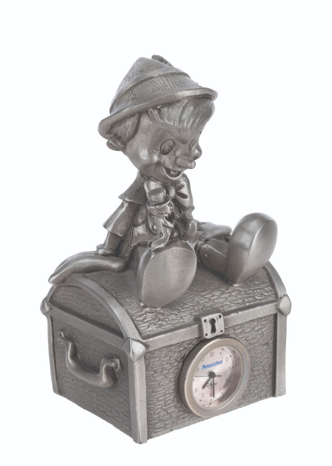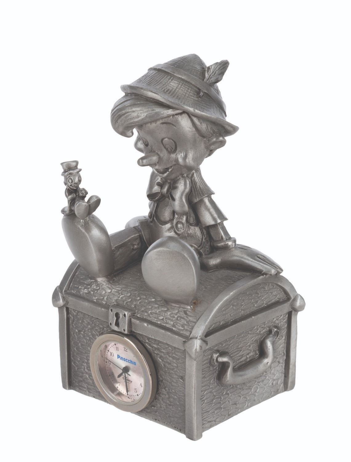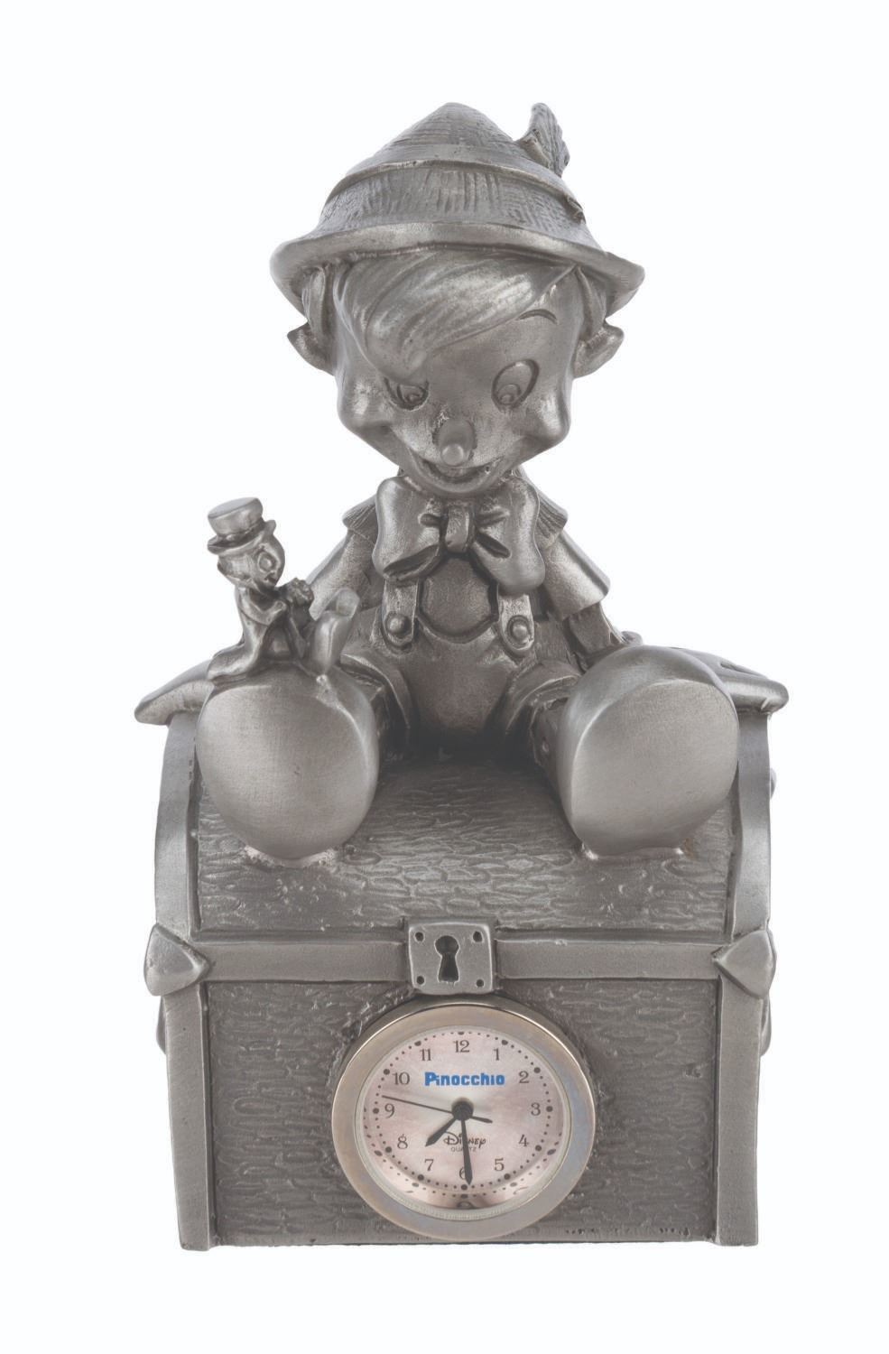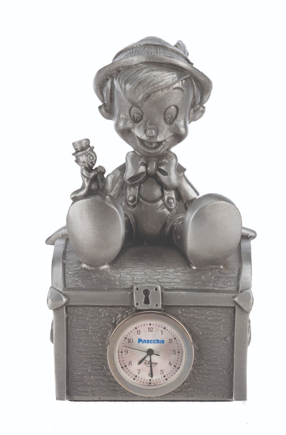 (Disney, 1990s) A pewter Pinocchio figurine with inset clock. Numbered 0440/5000, the clock stands 4 " tall and is in fine condition, requiring a battery and possibly service to function.