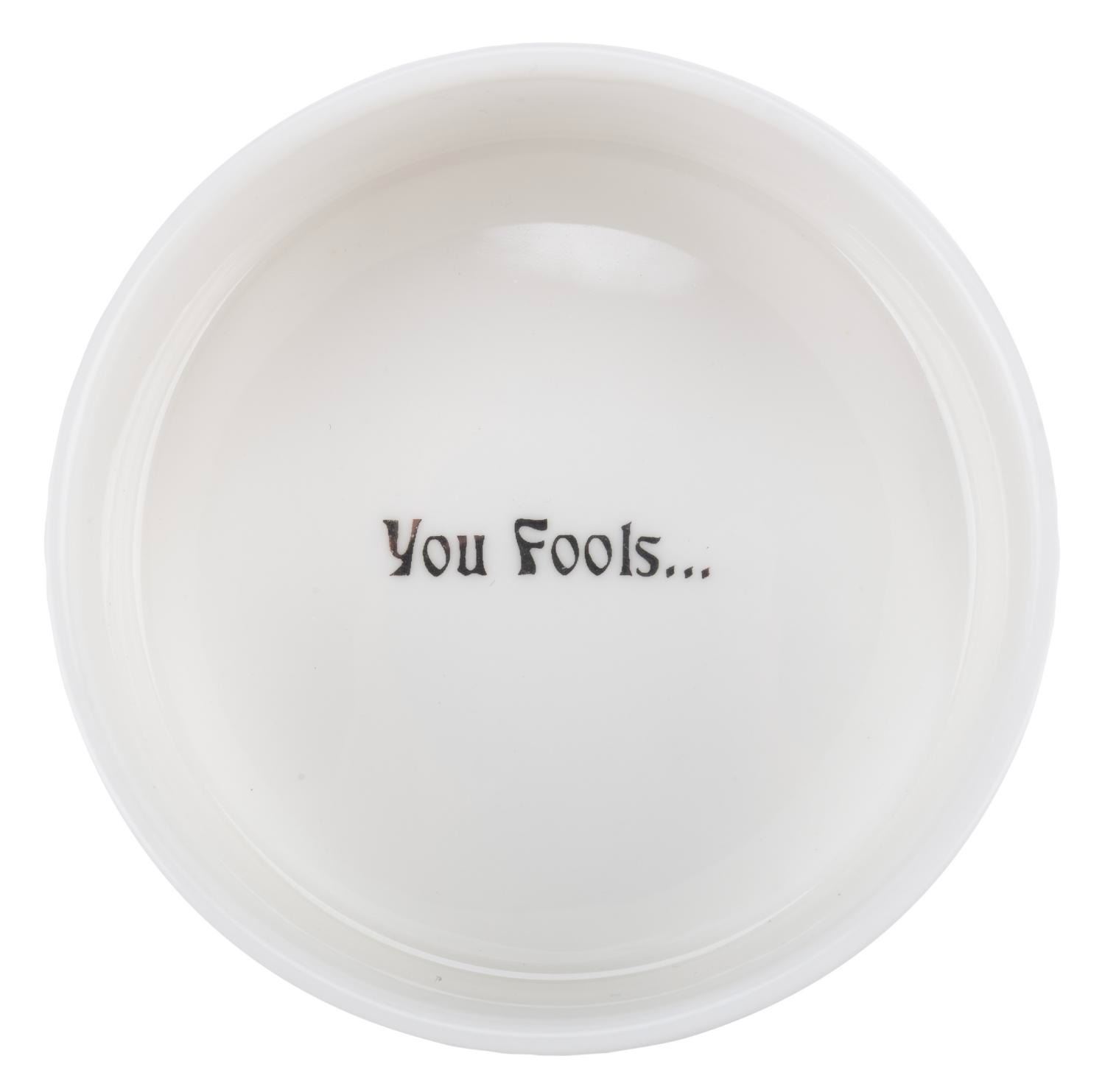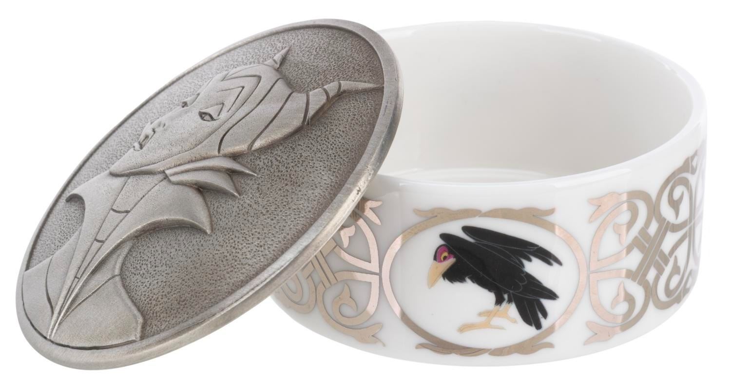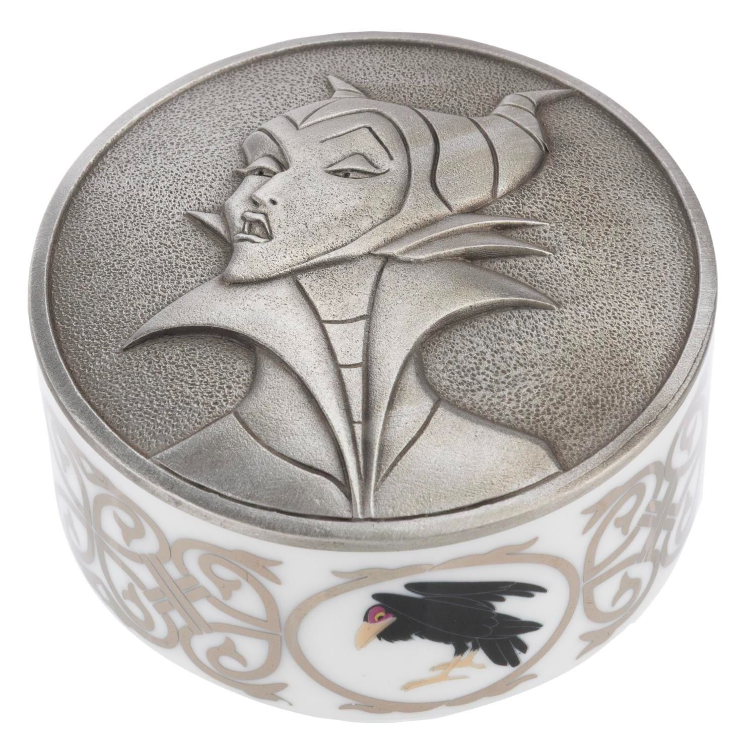 (Disney, 1999) A pewter and bone china trinket box featuring Maleficent and her Raven Diablo from "Sleeping Beauty." The interior of the box reads "You Fools." Measuring 3" around and 1.75" tall, the box is in fine condition.