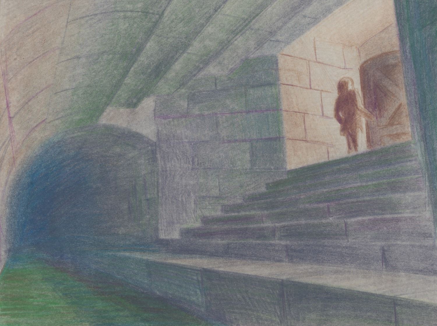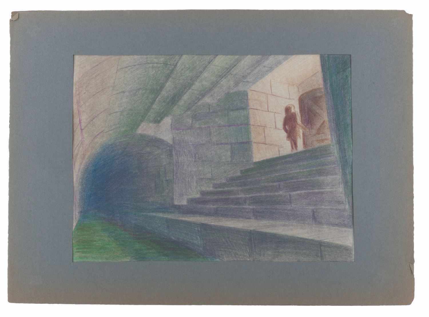 (Universal, 1925) An original production design concept for the Lon Chaney horror classic “The Phantom of the Opera,” by artist Ben Carre. During the development of the stage musical in the 1980s, this art was loaned to Andrew Lloyd Webber as a reference for set design. Measuring 8” x 11” in an 11.5” x 16” matte, the graphite and colored pencil art on vellum displays in very good condition with creases and wear from production use. The matte is in fair condition with edge tears, spotting, and discoloration from age.