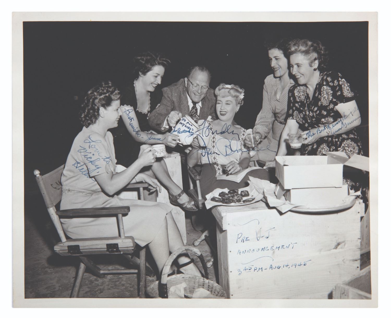 (MGM, 1945) A photo signed by actress Joan Blondell and (4) others, from behind the scenes on the film"Adventure." The photo is dated to August 14th 1945, during the production of the Clark Gable/Greer Garson film which Blondell also stars in. The other signatures include Joseph Ruttenberg, the Director of Photography, June Pickerell, who portrayed an uncredited"nurse," and (2) others. The autographs include dedications to Vicky Nichols, the MGM Costume and Wardrobe matron. Measuring 8"x10", the photo with signatures is in very good condition, with light wear from age including very slight warping.