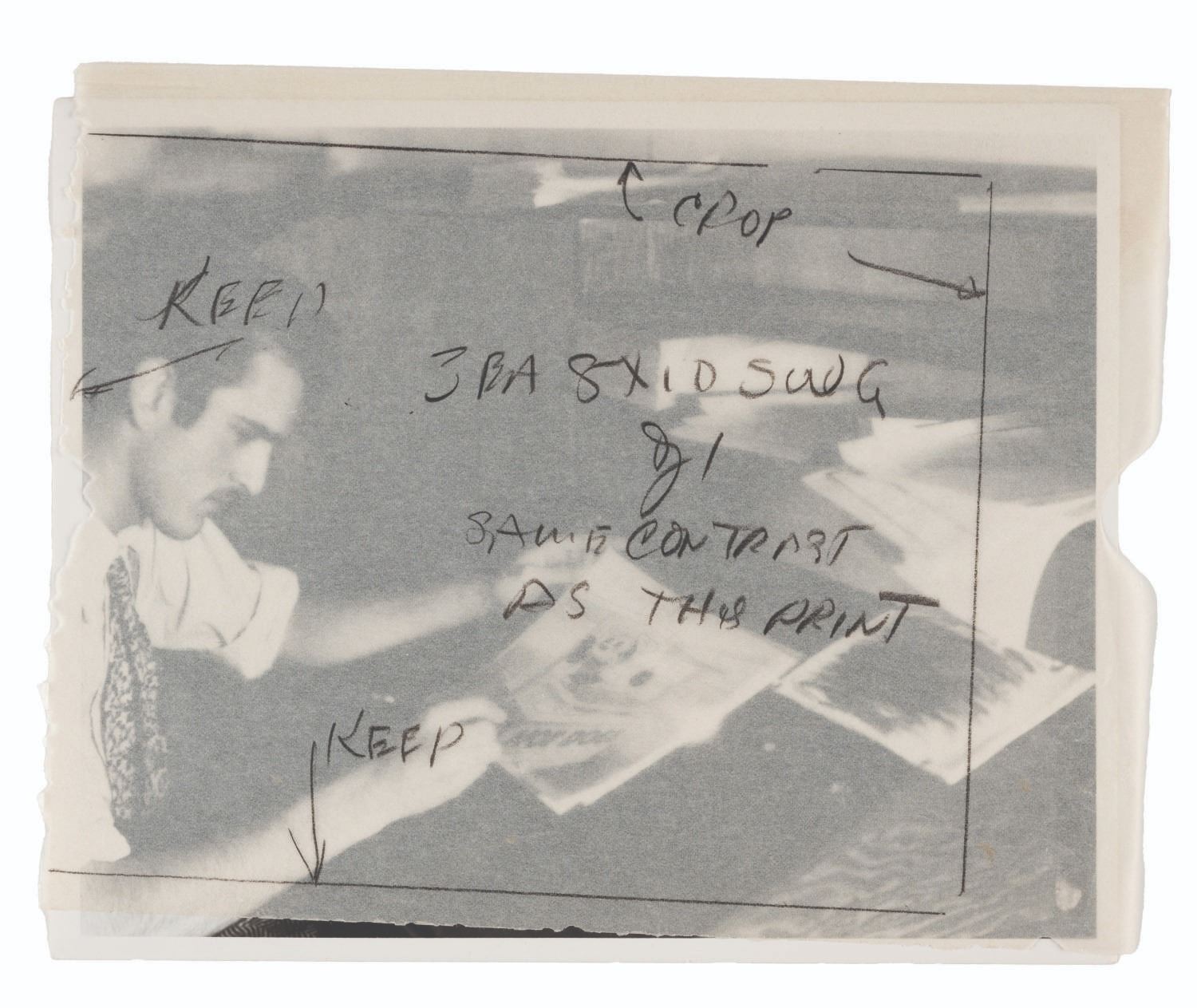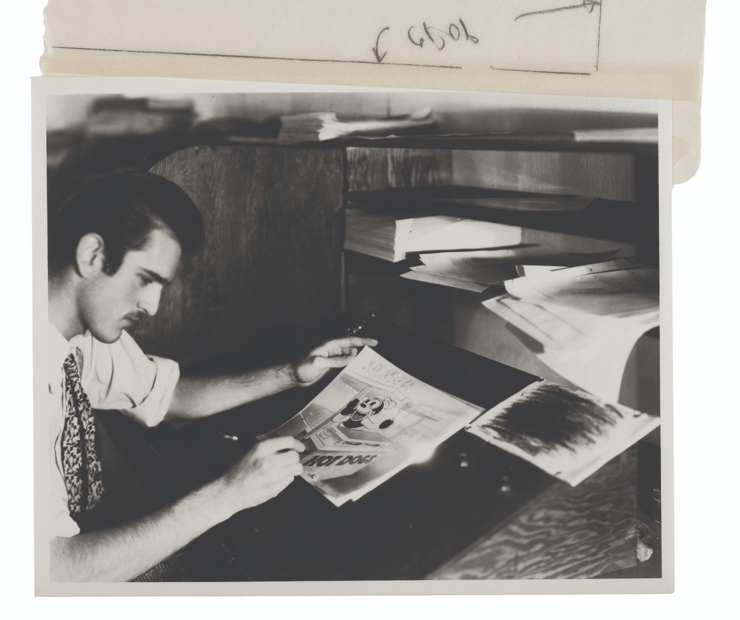 (Harman-Ising, 1930s) A photograph of animator Larry Martin with a cel and background from a Bosko cartoon. In a note on the back, Clampett identifies Martin as the model for the villain Dishonest John in “Time For Beany” (see lot 690). For a brief time Martin also worked as an animator on the Beany and Cecil cartoons. Clampett labeled the reverse, “Return to Bob Clampett,” effectively signing it. Measuring 8” x 10”, the photo is in good condition with light scratches and handling wear.