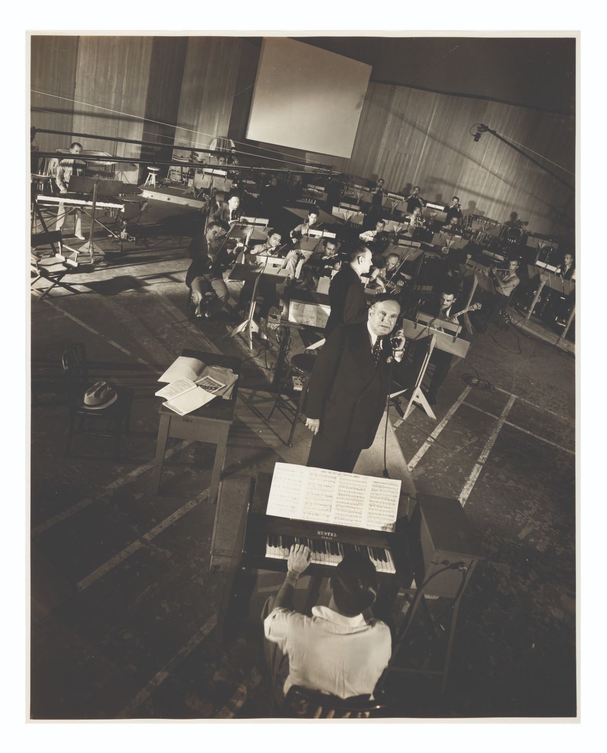 (Schlesinger, 1937) A photo of Producer Leon Schlesinger with Carl Stalling and the Warner Brothers orchestra. The pianist’s sheet music suggests they’re recording the soundtrack for the Merrie Melodies cartoon “Have You Got Any Castles,” directed by Frank Tashlin. Measuring 8 x 9.75”, the photo print is in very good condition with paper residue on the back from mounting in an album.