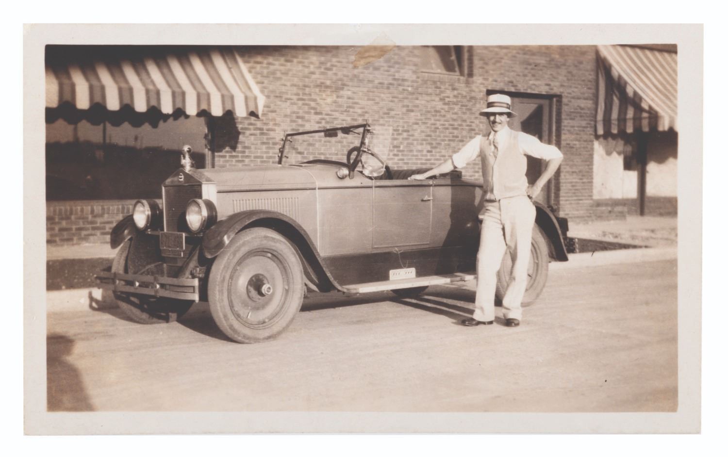 (Disney, 1920s) A rare original photo of Walt Disney with his 1926 Moon Roadster. Walt was very fond of this car, however, in 1928 when the studio faced financial troubles, he decided to sell it. The 4.25” x 2.5” photo was given to Stalling by Disney. It is inscribed in pencil on the reverse – “Walt & his Moon – Sold For Payroll.” The photo is in good condition with residue on the reverse from being mounted in a scrapbook.