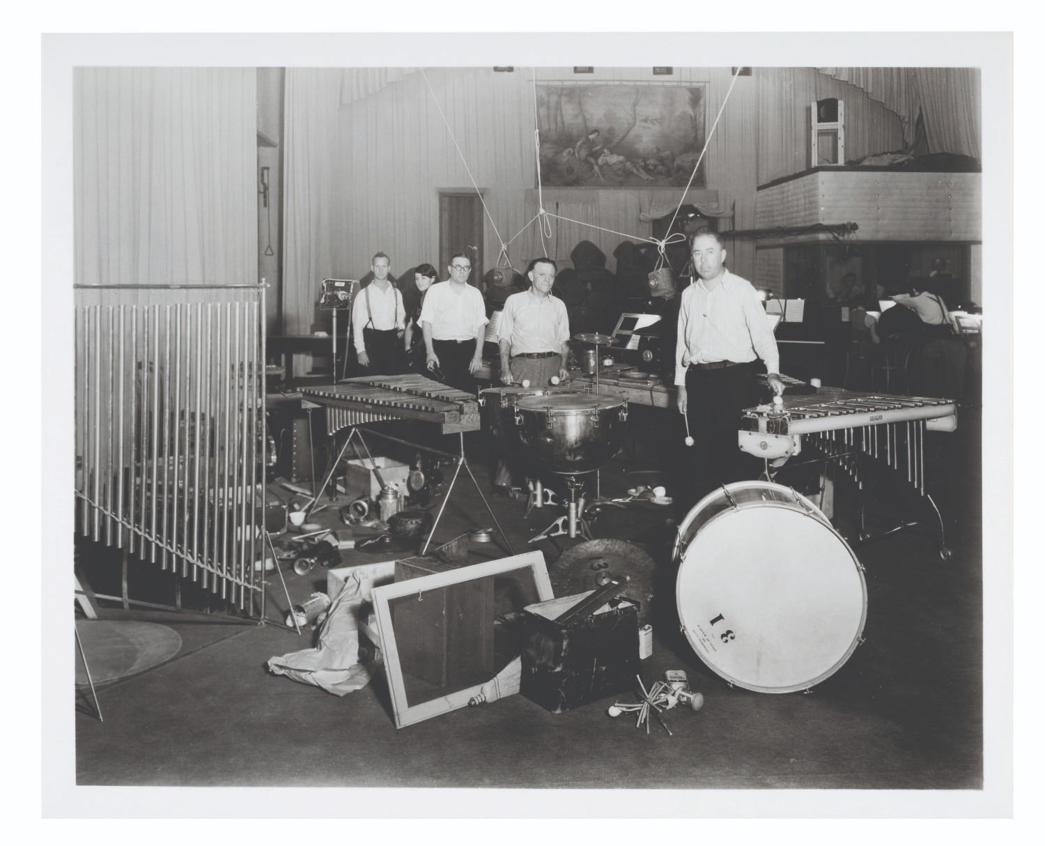 (Disney,1930s) A behind-the-scenes photo of a percussion recording session at the Disney Studios. This print was made at the Studio in the 1960s or 1970s and comes from the Bob Clampett Collection. Measuring 8” x 10”, the print is in fine condition.