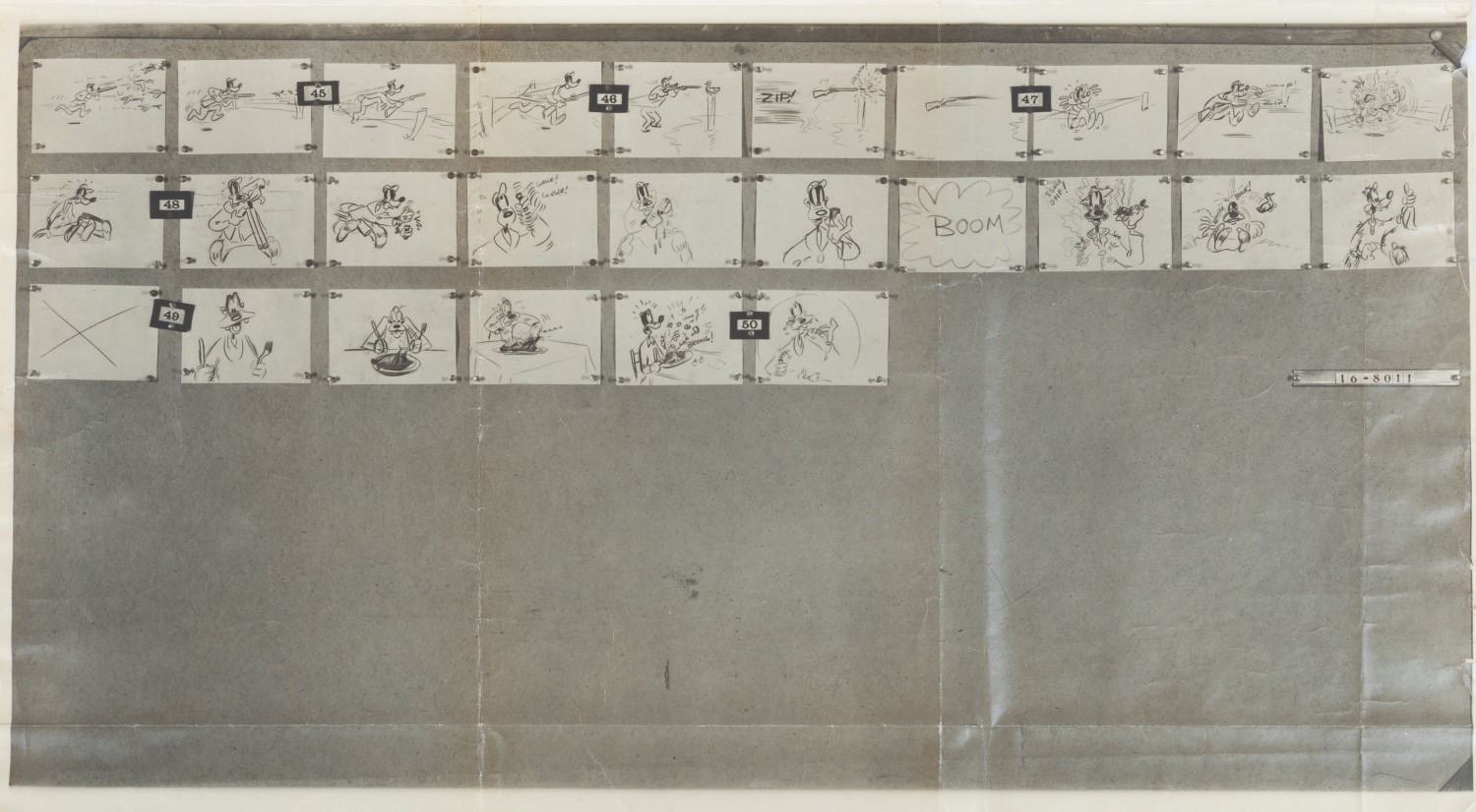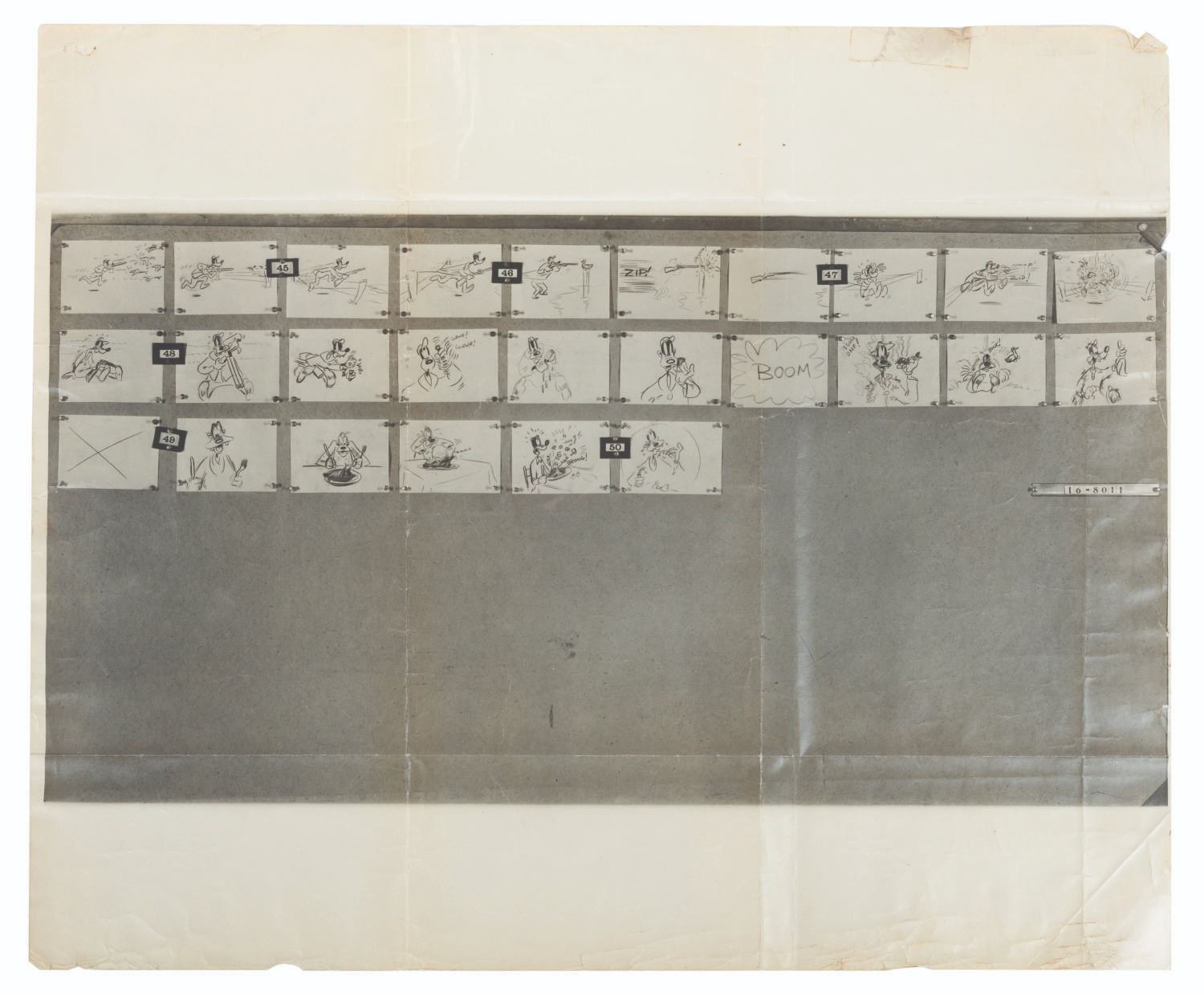 (Disney, 1947) A photostat storyboard sheet featuring Goofy from the 1947 short film “Foul Hunting,” directed by Disney Legend Jack Hannah. The back includes a stamp claiming that this material is the property of Walt Disney Productions and must not be taken from the studio. Measuring 8.25” x 16.75”, the sheet is in fair condition with creases, stains on the back, and discoloration from age.