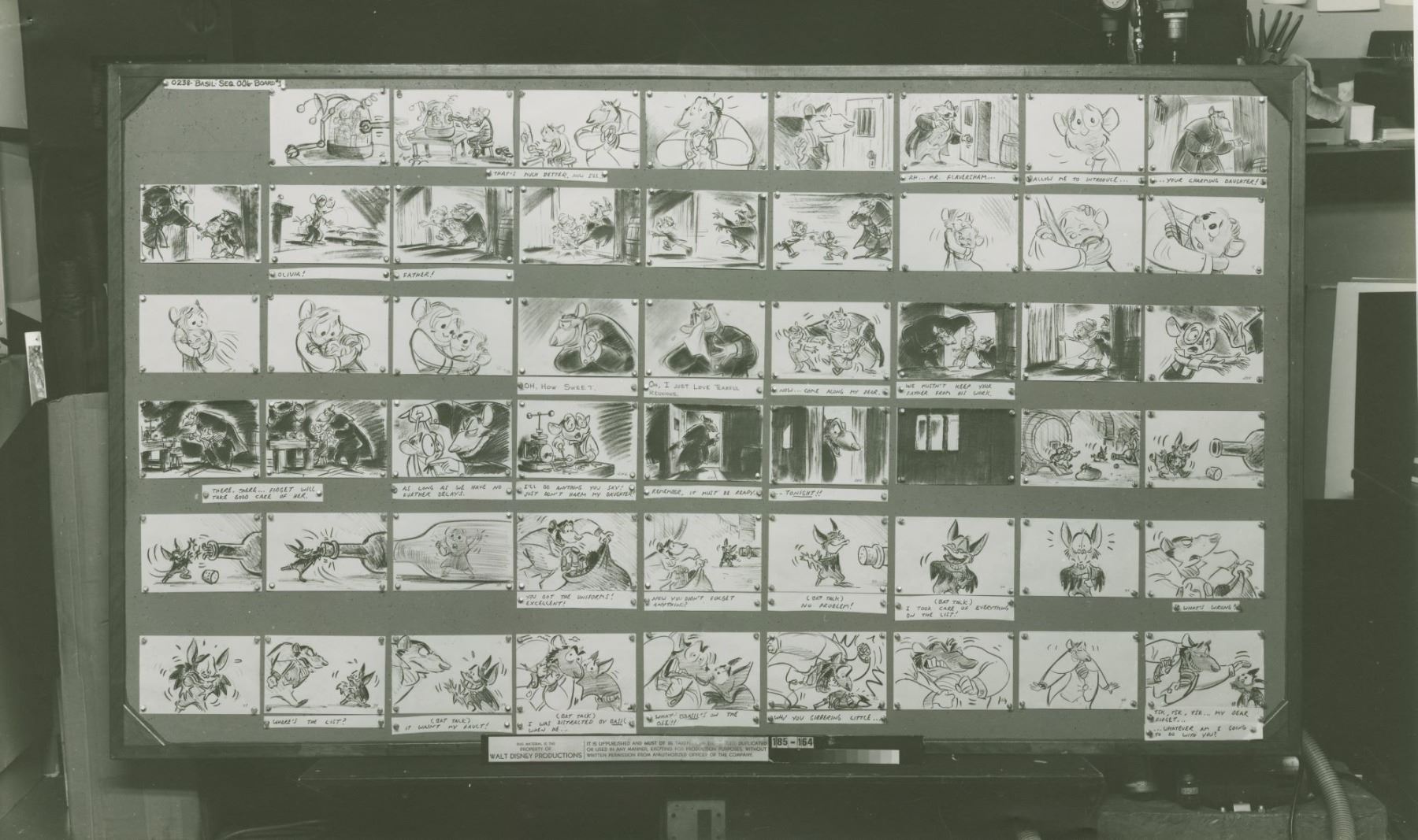 (Disney, 1986) A photostat storyboard reference from the production of “The Great Mouse Detective” featuring Mr. Flaversham, Olivia Flaversham, Ratigan, and Fidget. Photostat storyboards like these were distributed to animators to use as reference during production. Measuring 12” x 20’, the photostat is in very good condition with discoloration from age, minimal edge and corner wear, and staple holes to the top left corner.