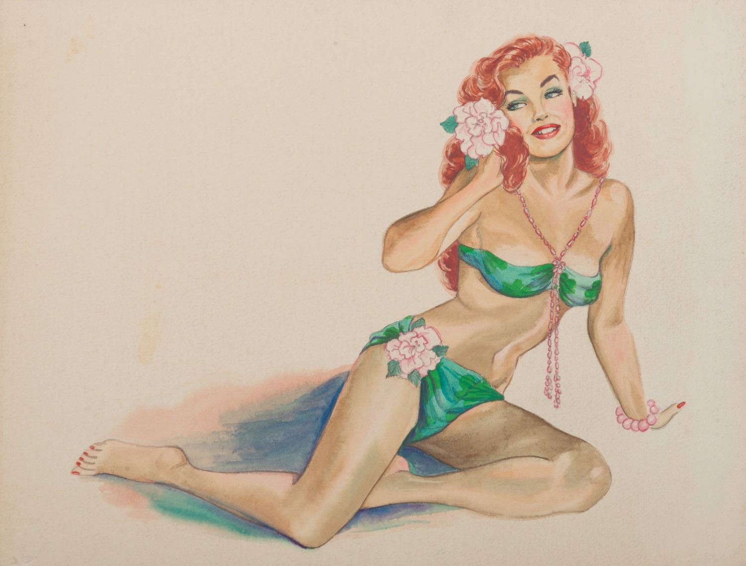 (1950s-1960s) A Pin-up style costume concept illustration. Executed in gouache, the piece measures 10"x13" and is in very good condition, with light wear from age.