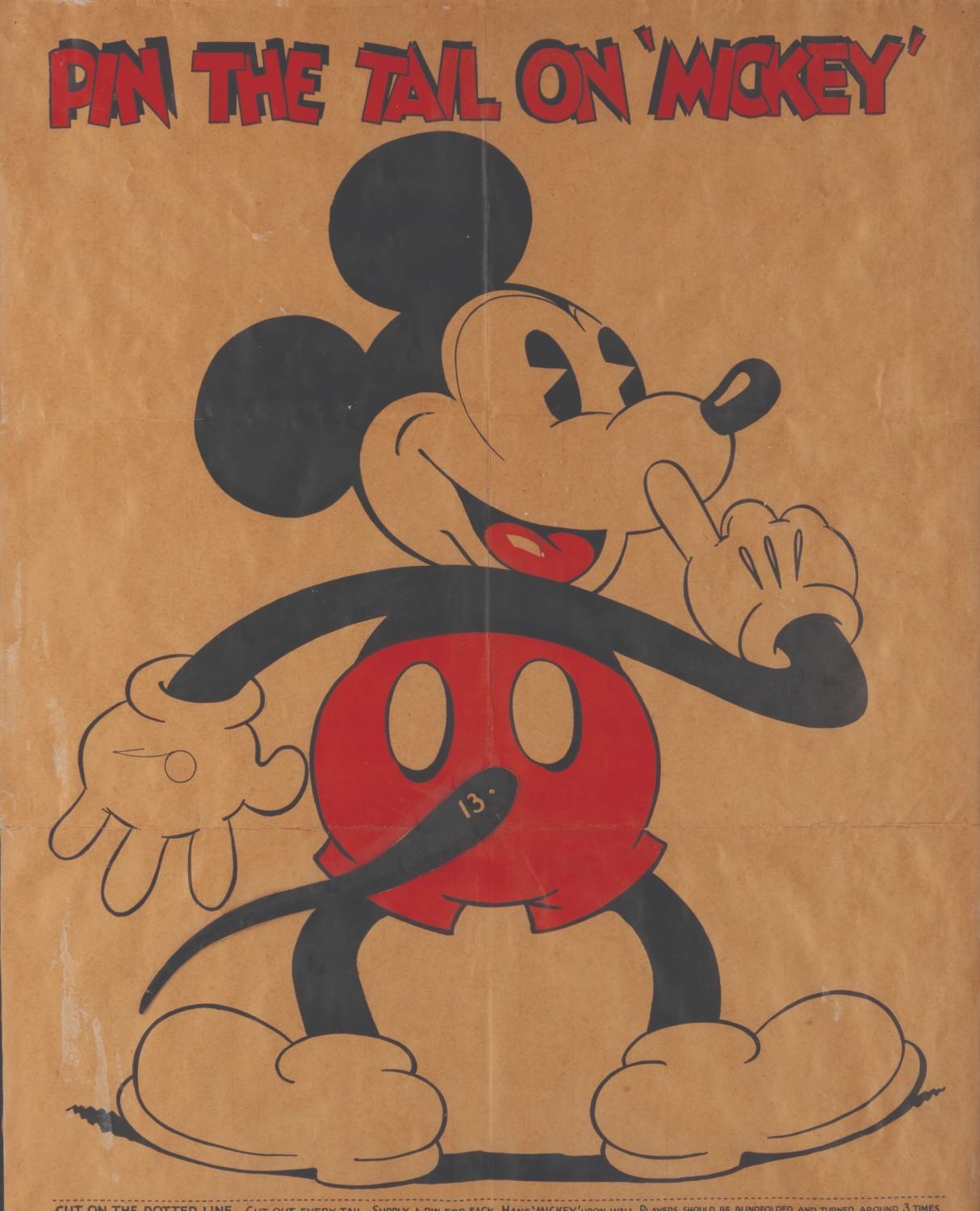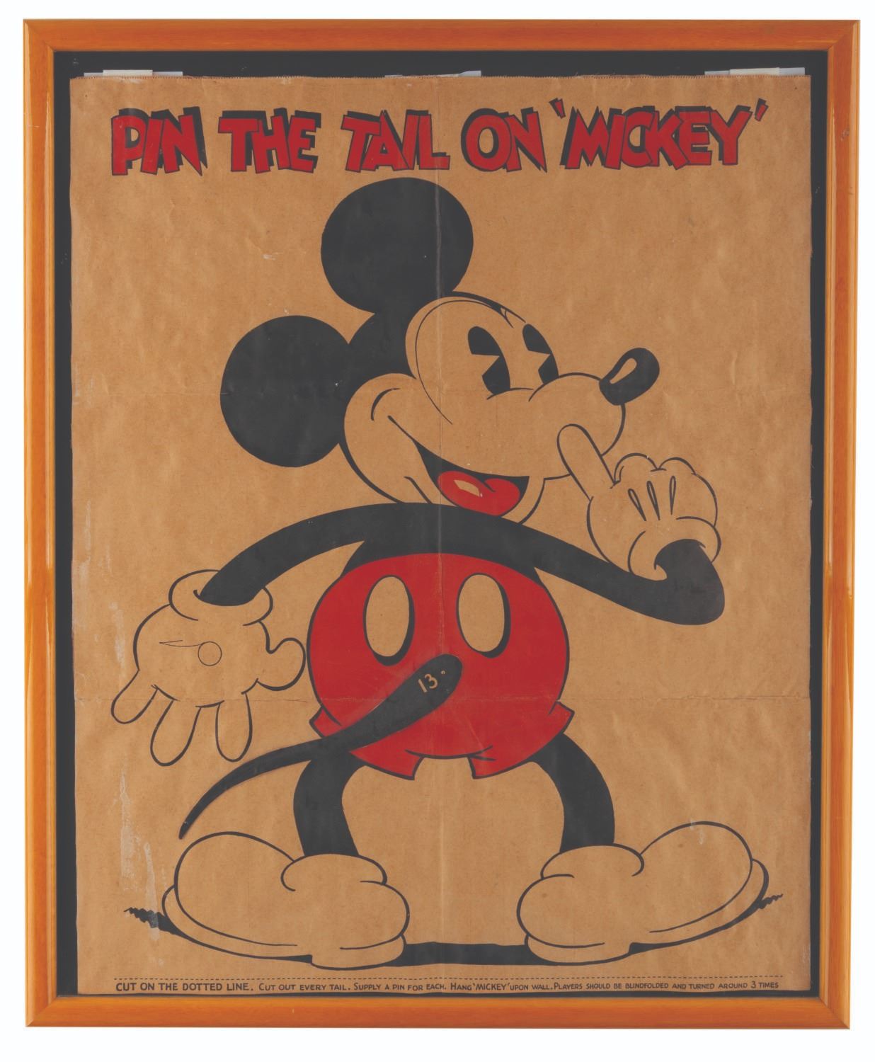 (Marks Bros, 1930s) An original Pin the Tail on Mickey party game by Marks Bros. Included are the framed original poster, envelope, and all 16 numbered tails. Measuring 17.75 " x 22 " in a 20 " x 24.25 " frame, the poster displays in very good condition with folds, creases, paper loss, scrapes, and discoloration from age, while the envelope features heavy wear, tears, and paper loss.