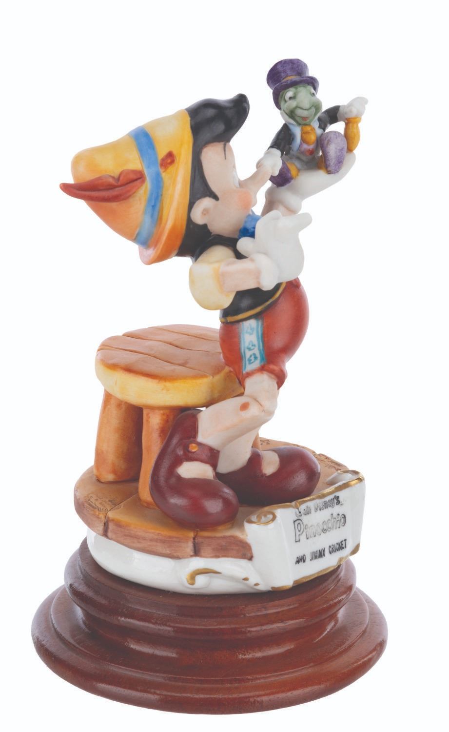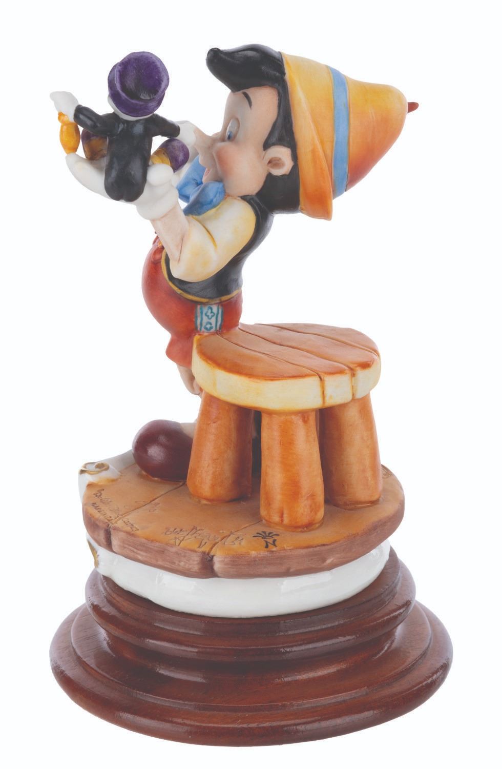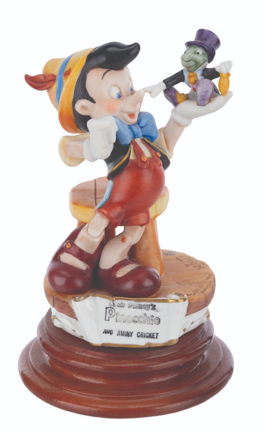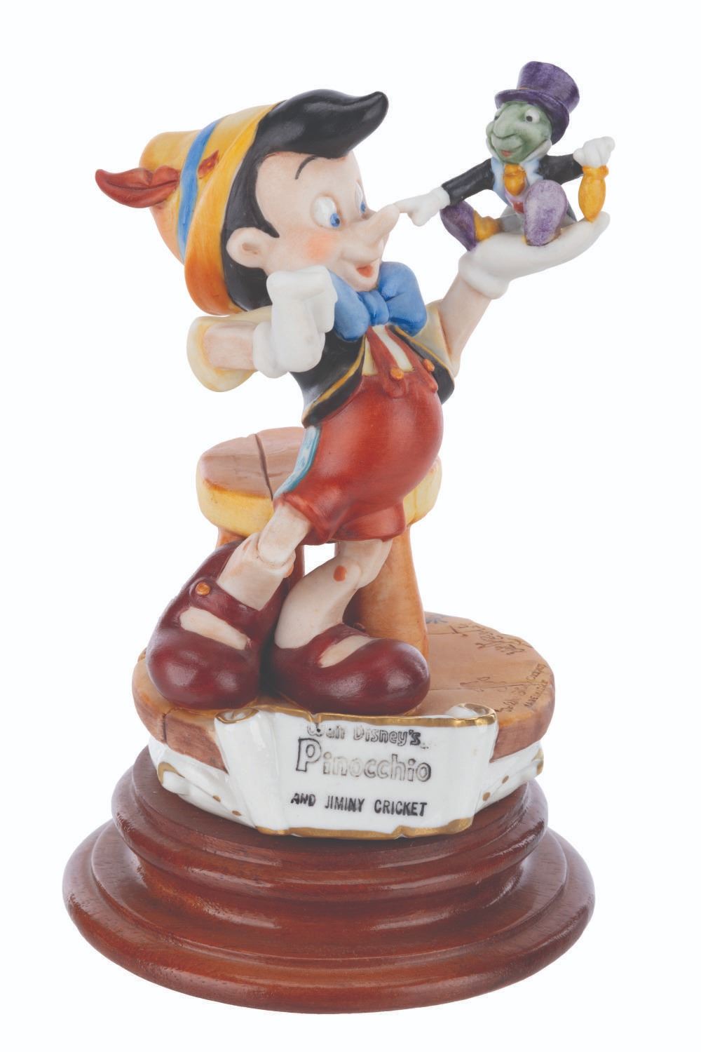 (Disney, 1985) A Capodimonte porcelain Pinocchio and Jiminy Cricket figure sculpted by Enzo Arzenton for the Laurenz Disney Character Collection. Released in an edition of 10255, the porcelain figure is numbered 291 on the bottom. Measuring 7.5” tall and 4.5” in diameter, the figure is in very good condition with light paint fading, scuffs, and glue residue on the bottom of the base.