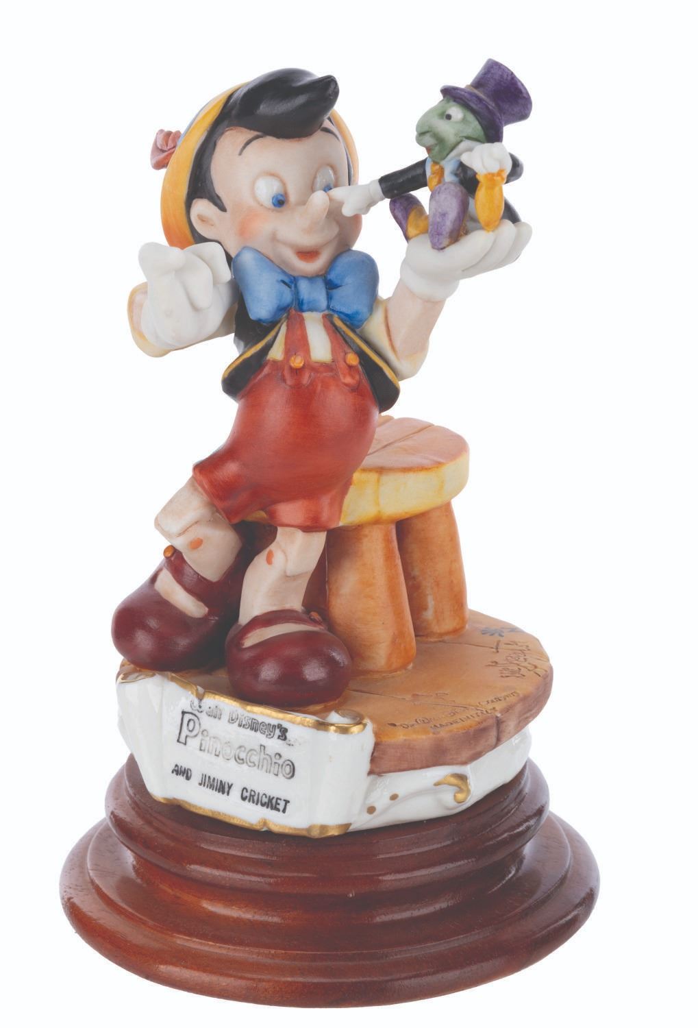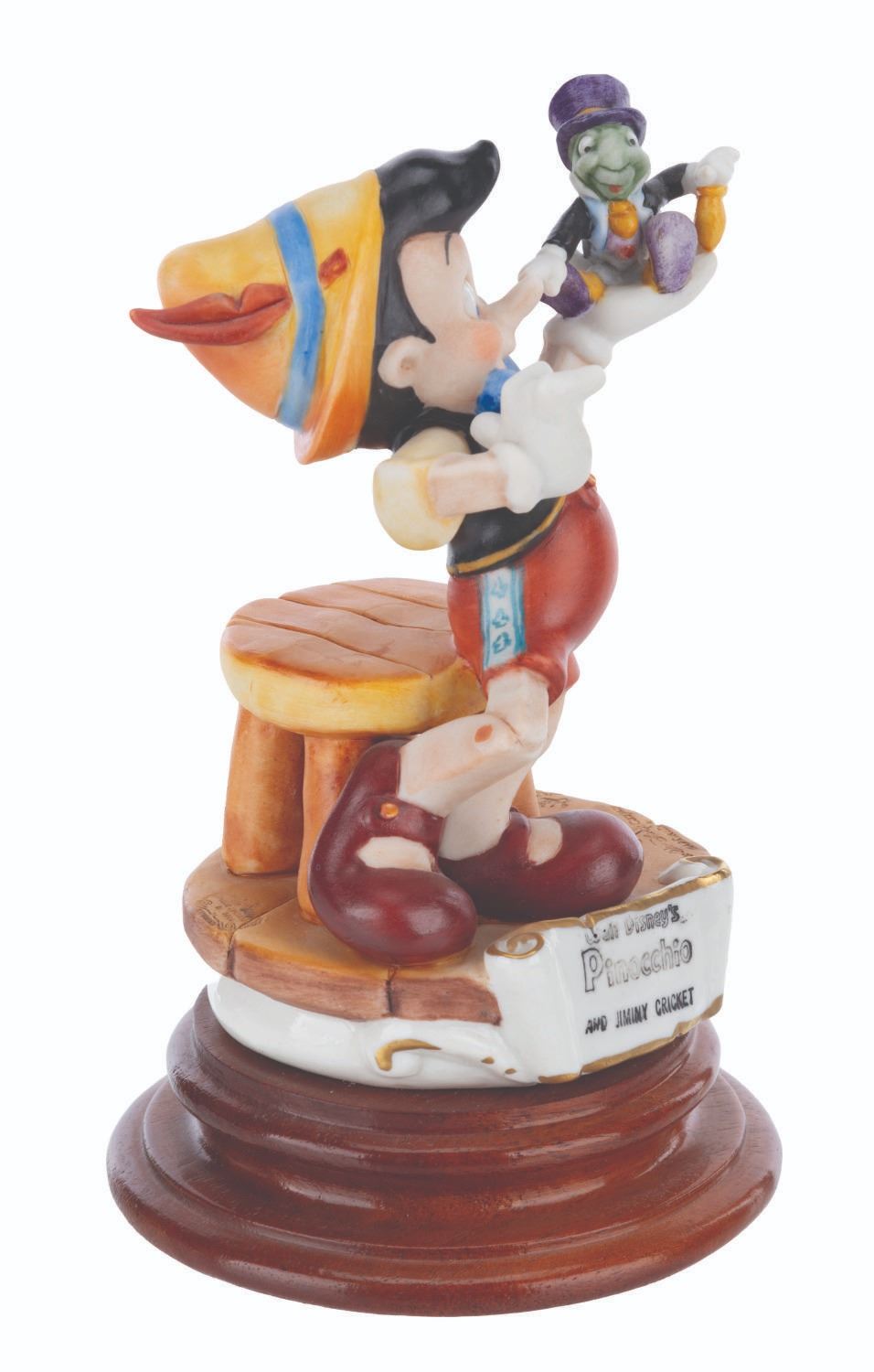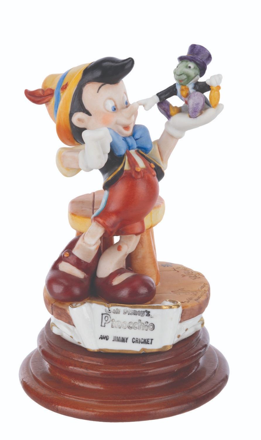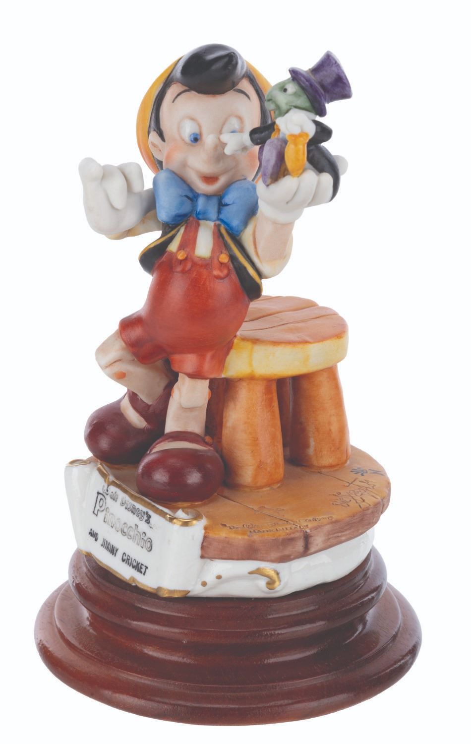 (Disney, 1985) A Capodimonte porcelain Pinocchio and Jiminy Cricket figure sculpted by Enzo Arzenton for the Laurenz Disney Character Collection. Released in an edition of 10255, the porcelain figure is numbered 291 on the bottom. Measuring 7.5” tall and 4.5” in diameter, the figure is in very good condition with light paint fading, scuffs, and glue residue on the bottom of the base.