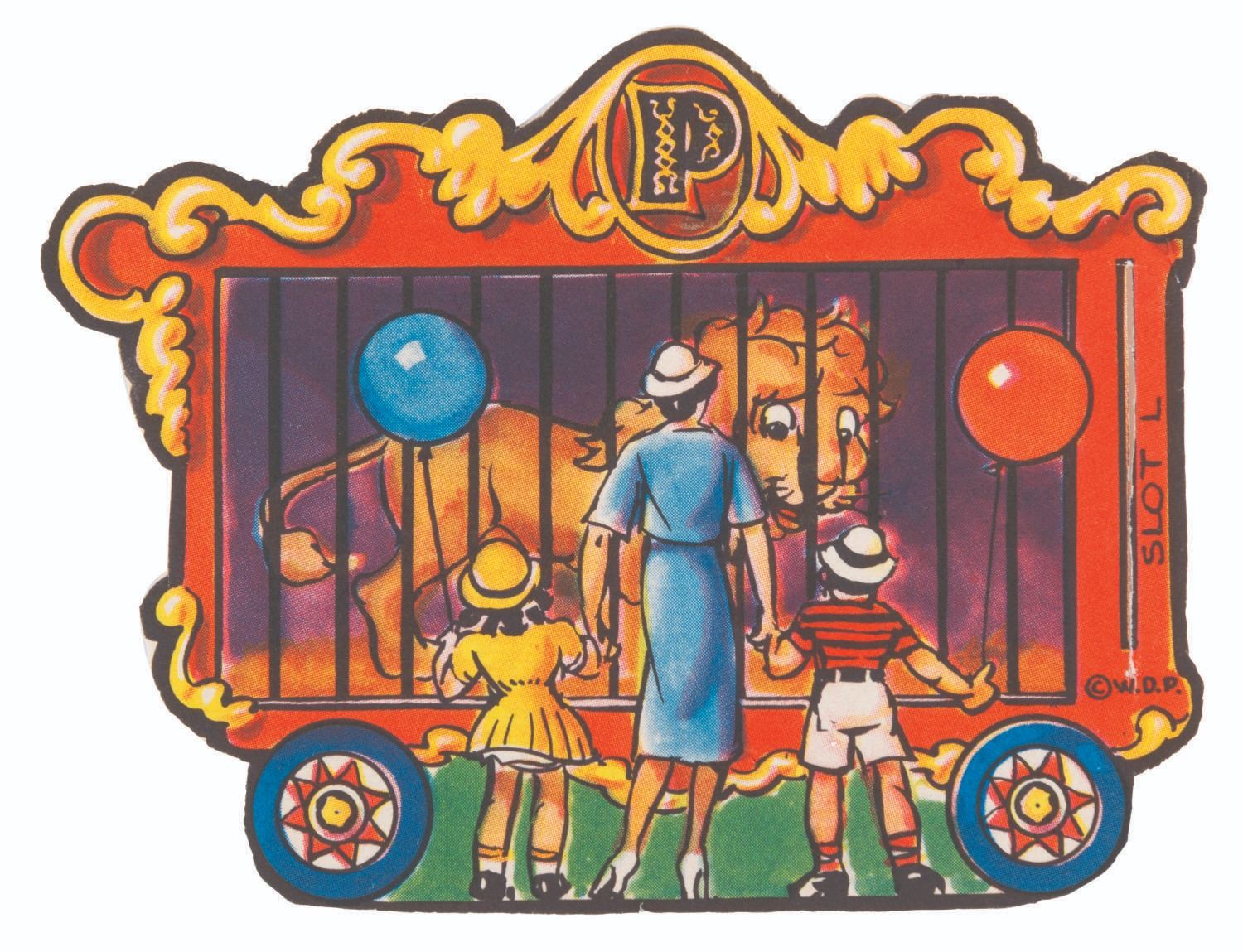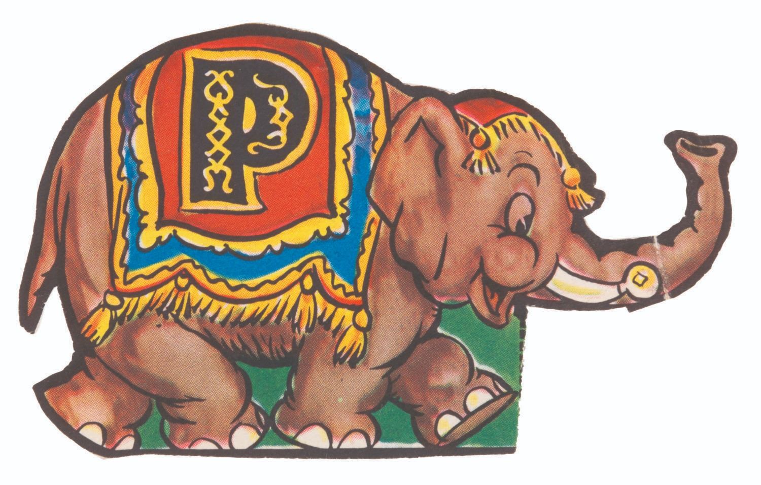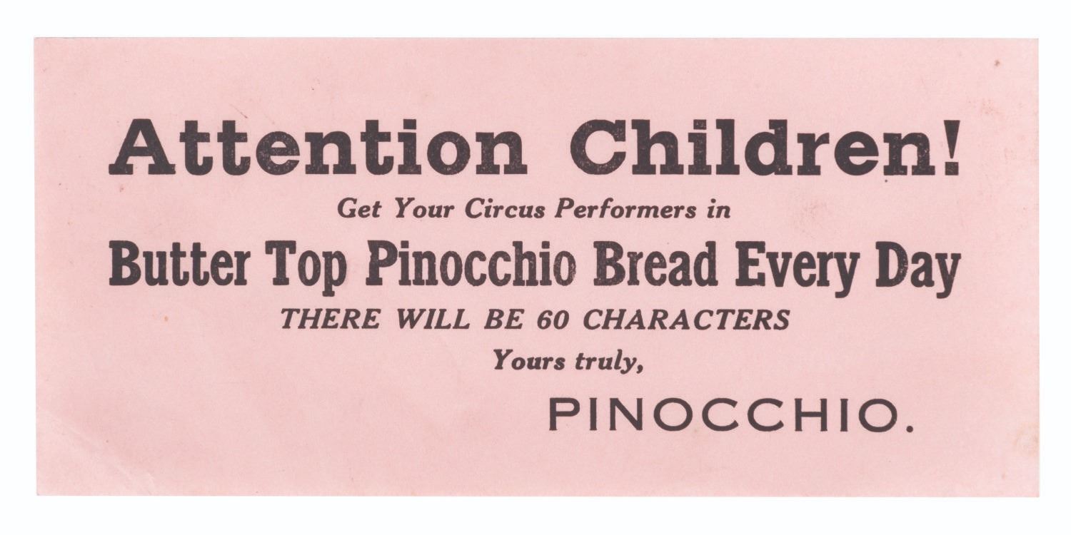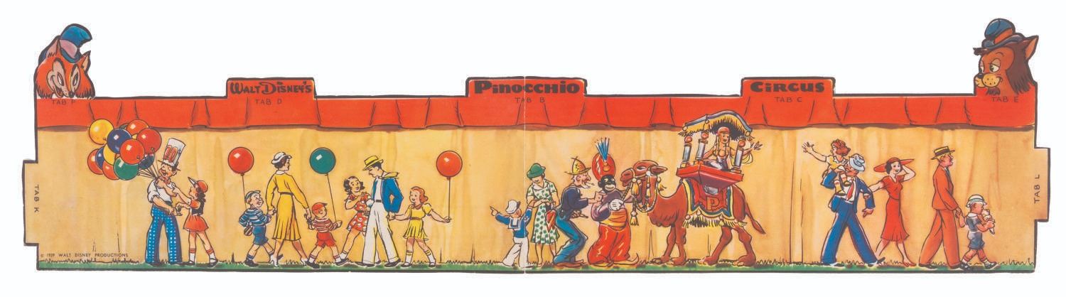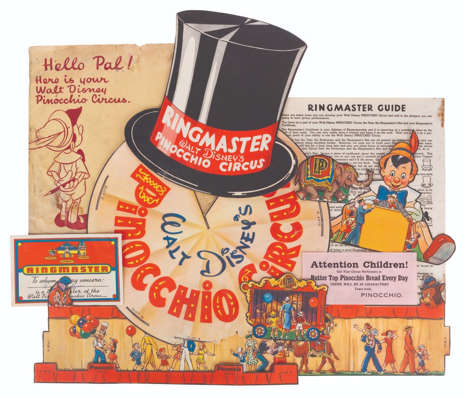 (Disney, 1939) A colorful group of paper premiums distributed by bakeries as part of a “Pinocchio” promotion. The set includes the original mailing envelope, Ringmaster hat, instruction sheet, and cutouts of a circus tent and characters. Measuring from 2.25” x 3.75” up to 9.5” x 10.5”, the pieces are in very good used condition with light wear from age and use. The circus tent top piece is in good condition with wear and chipping to 3” of the edge, and the rarely retained envelope is in fair condition with much wear, staining, and tears throughout.