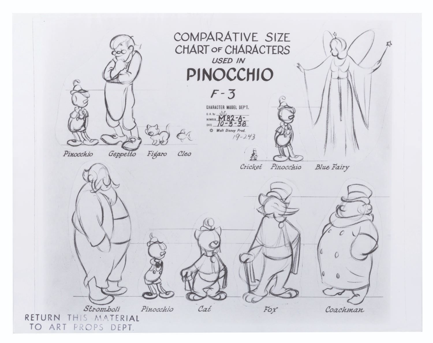 (Disney, 1940) A Studio-produced photostat model sheet of character comparative sizes for"Pinocchio." Model sheets like this were distributed to animators on a film to ensure everyone drew the character consistently. Measuring 11" x 14", the model sheet is in very good condition, with rippling, minor discoloration from age, and creases and edge wear from production use.