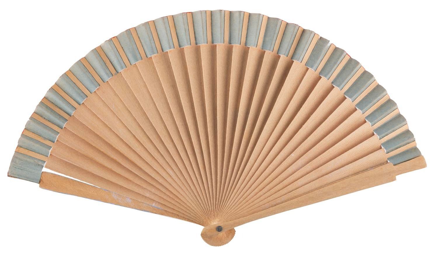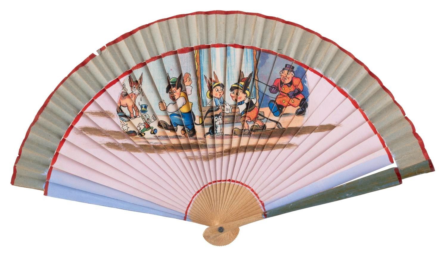 (Japan, 1950s-60s) A "Pinocchio" Donkey Scene Japanese fan, with a litho print image applied to wood with hand-painted elements. Measuring 7.5" x 13.5" open, the fan is in very good condition with light wear from age and handling.