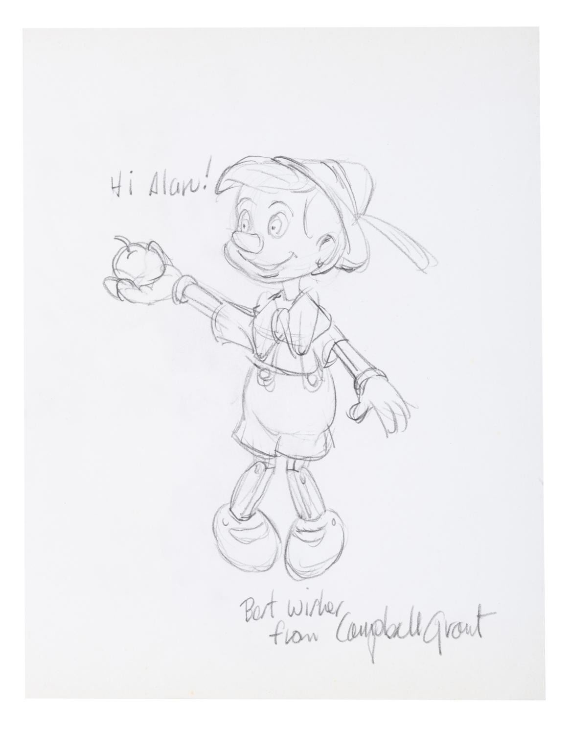 (Grant, 1970s-80s) A Pinocchio drawing signed by animator Campbell Grant with a personal dedication. Measuring 8.5" x 11" and accomplished in graphite, the drawing is in very good condition with creases and light discoloration from age.