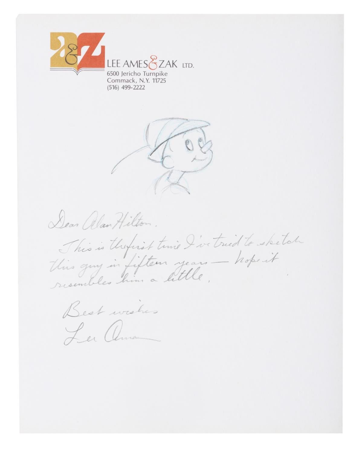 (Ames, 1980s-1990s) A signed personalized letter and Pinocchio drawing by artist Lee Ames. Measuring 8.5" x 11" and accomplished in graphite, the letter and drawing are in very good condition with light edge wear and folds from mailing.