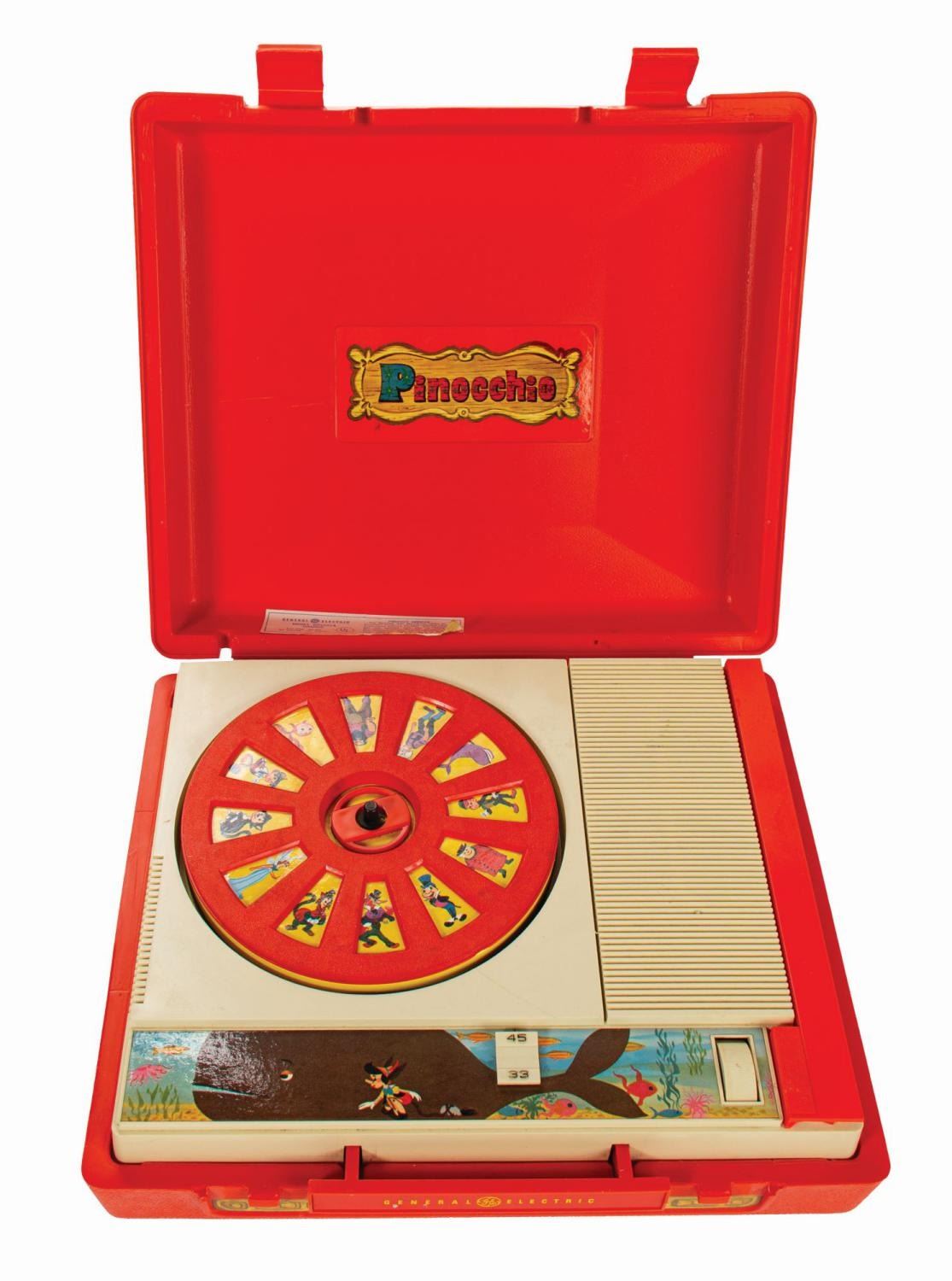(General Electric, 1970s) A Pinocchio record player manufactured by General Electric. The device plays 33rpm and 45rpm records and features a manual tone arm, a textured rubber platter with cutout image windows, a pop-up 45 adapter, and a built-in speaker. The turntable and speaker work but require service and likely a new needle to function. Measuring 11.5” x 13.25” and 3.75” deep, the player is in very good condition with some splitting to the plastic lid hinge, minor soiling, and staining to the plug.