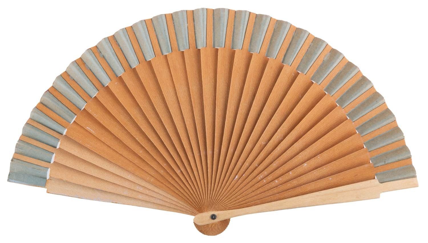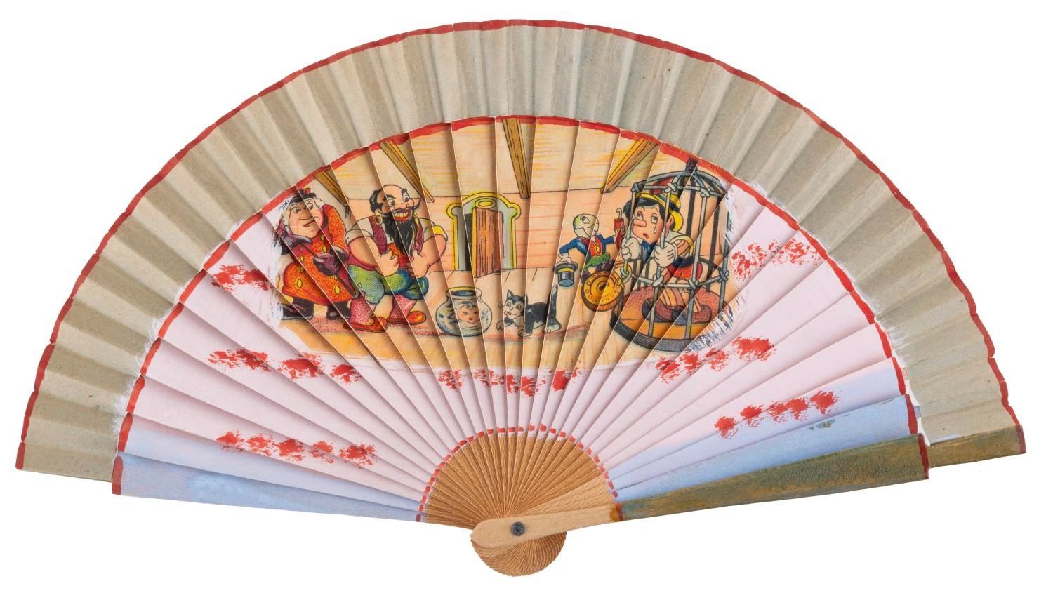 (Japan, 1950s-60s) A "Pinocchio" Japanese fan, with a litho print image applied to wood and hand-painted elements. Measuring 7.5" x 13.5" open, the fan is in very good condition with light wear from age and handling.