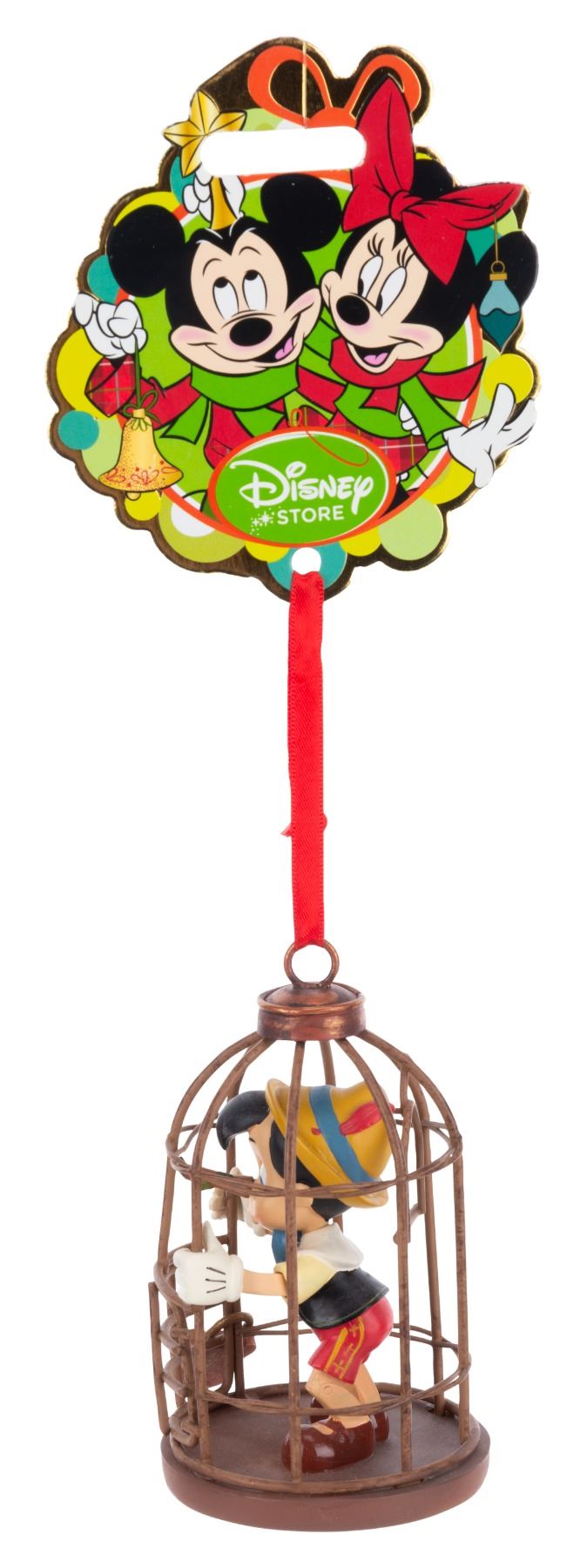 (Disney, 2012) A Disney Sketchbook Ornament of Pinocchio in a cage, with a red ribbon hanger and the original Disney Store tag. Measuring 2.5” in diameter and 5.75” tall, the ornament is in very good condition with a light mark on Pinochhio’s left hand.