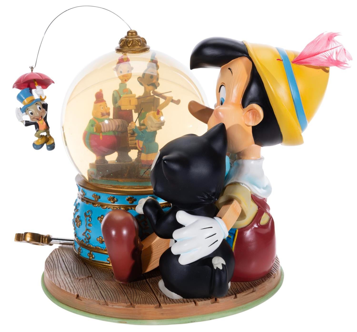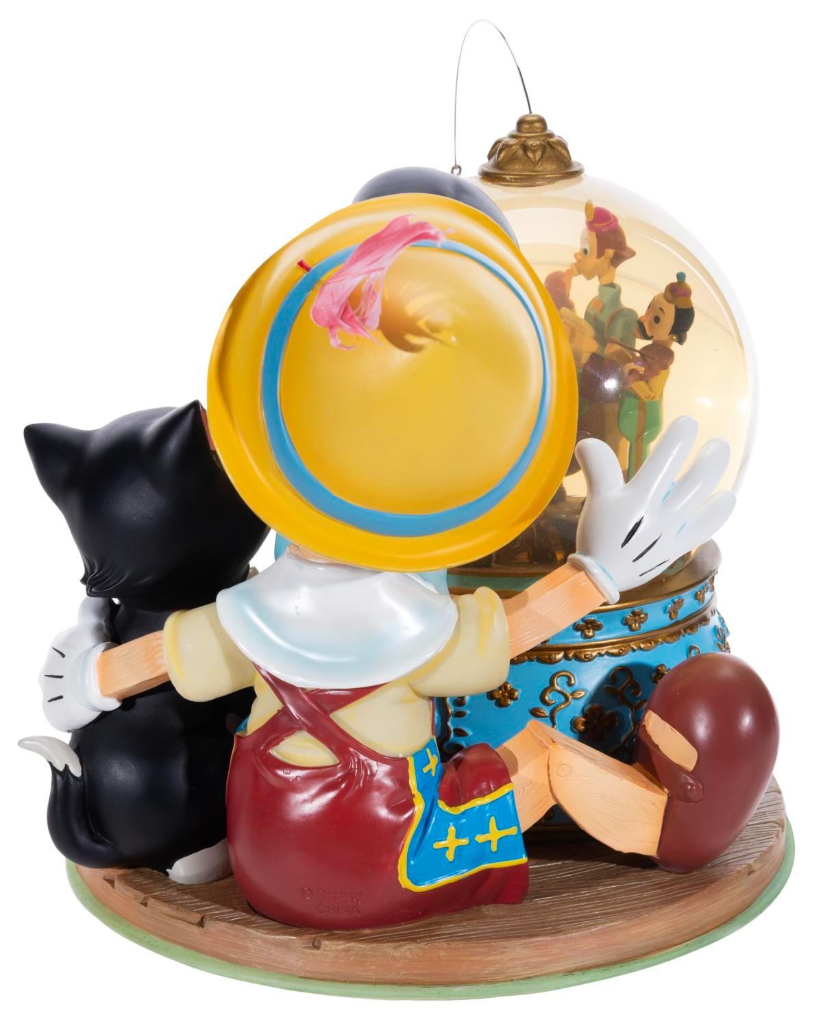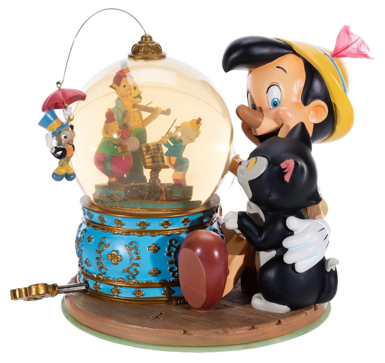 (Disney Store, 1990s-2000s) A musical "Pinocchio " snow globe. When wound, the globe plays "Brahms’ Waltz " while the conductor and middle figures inside move. Measuring 7.5 " in diameter x 8.5 " tall, the globe is in very good working condition with the tip missing from Pinocchio’s real feather, and slight cloudiness to the liquid inside from age.