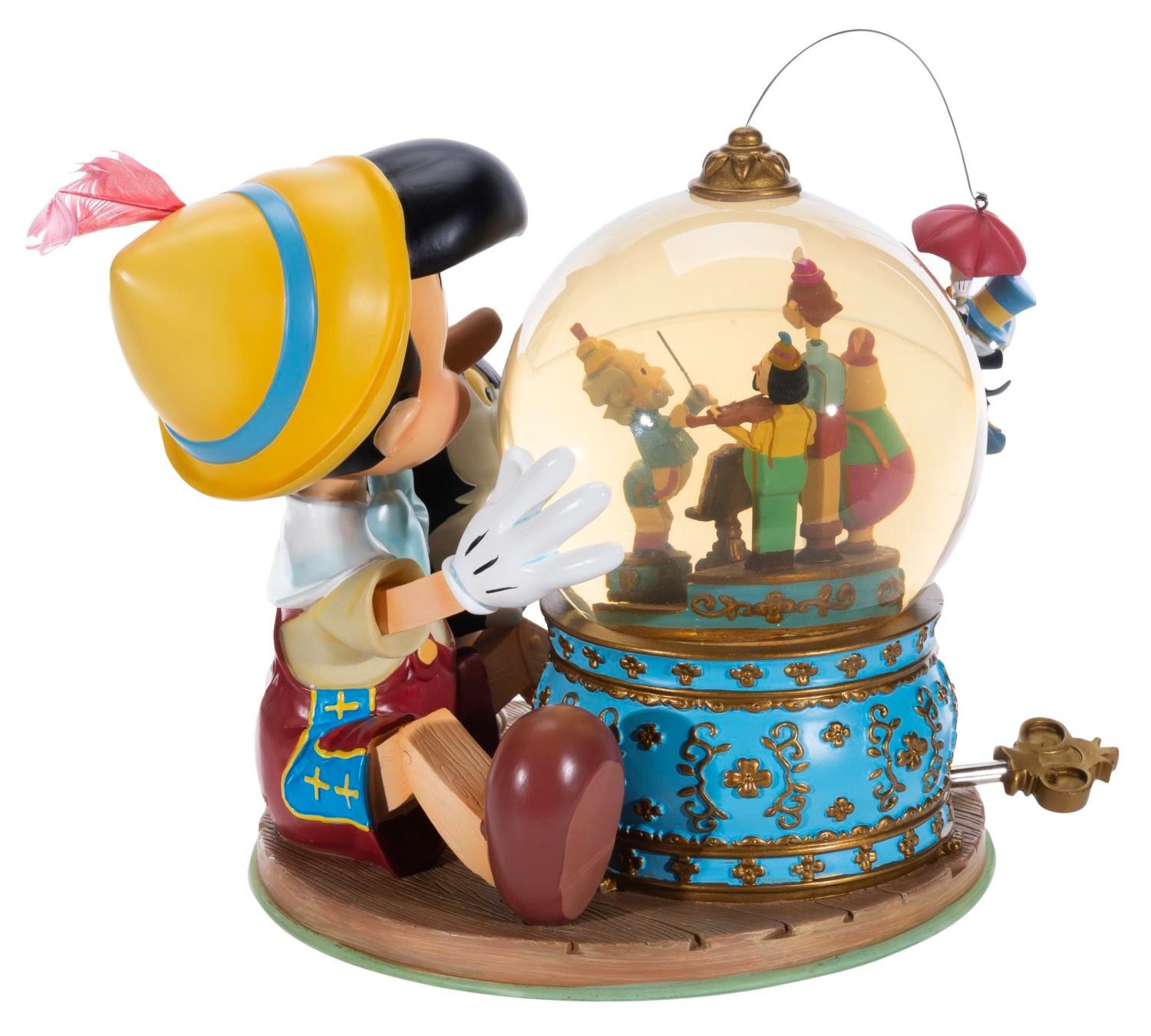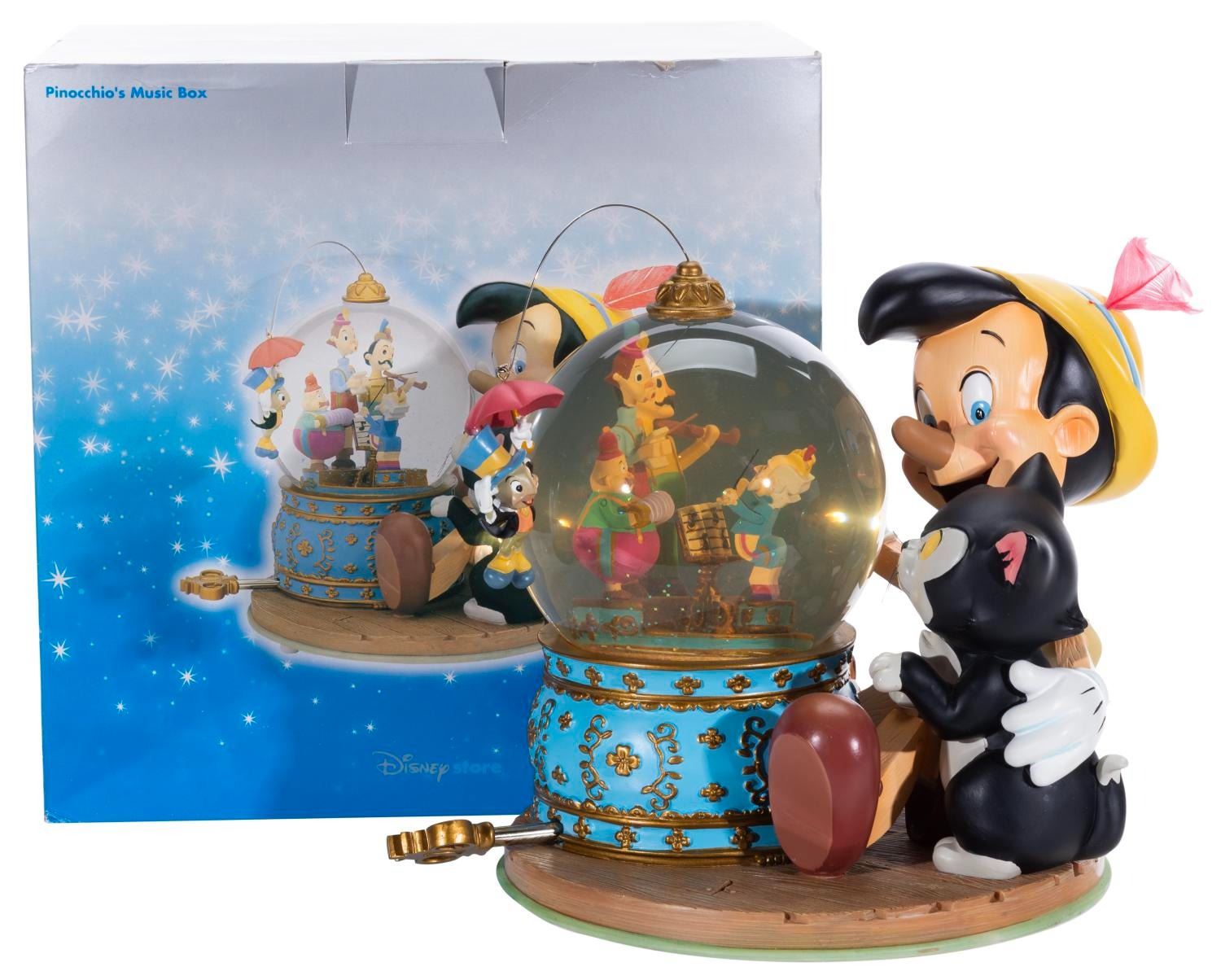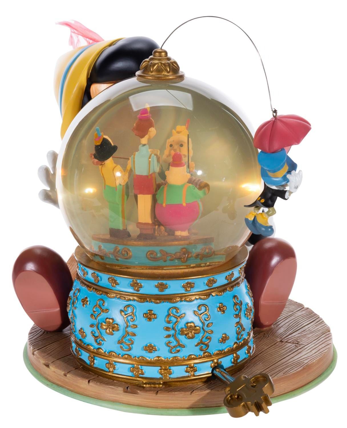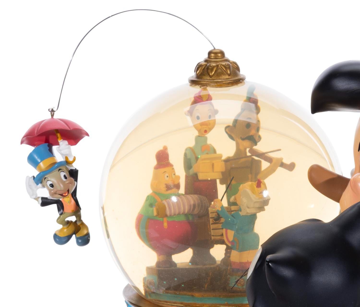 (Disney Store, 1990s-2000s) A musical "Pinocchio " snow globe. When wound, the globe plays "Brahms’ Waltz " while the conductor and middle figures inside move. Measuring 7.5 " in diameter x 8.5 " tall, the globe is in very good working condition with the tip missing from Pinocchio’s real feather, and slight cloudiness to the liquid inside from age.