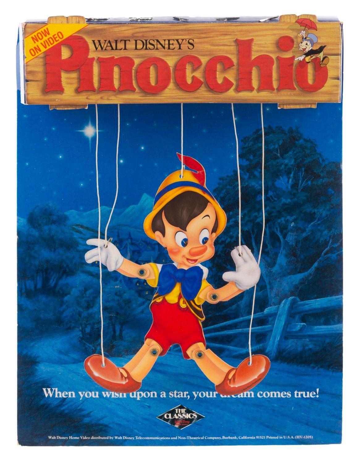 (Disney, 1985) A countertop display for the original videotape release of “Pinocchio” in July of 1985. In the Black Diamond “The Classics” line, the display features a jointed Pinocchio cutout on strings. Measuring 8.5” x 11” x 2.5” deep, the cardboard display is in very good condition with light edge and handling wear, a crease in one small side panel, and discoloration to the plain back from age.