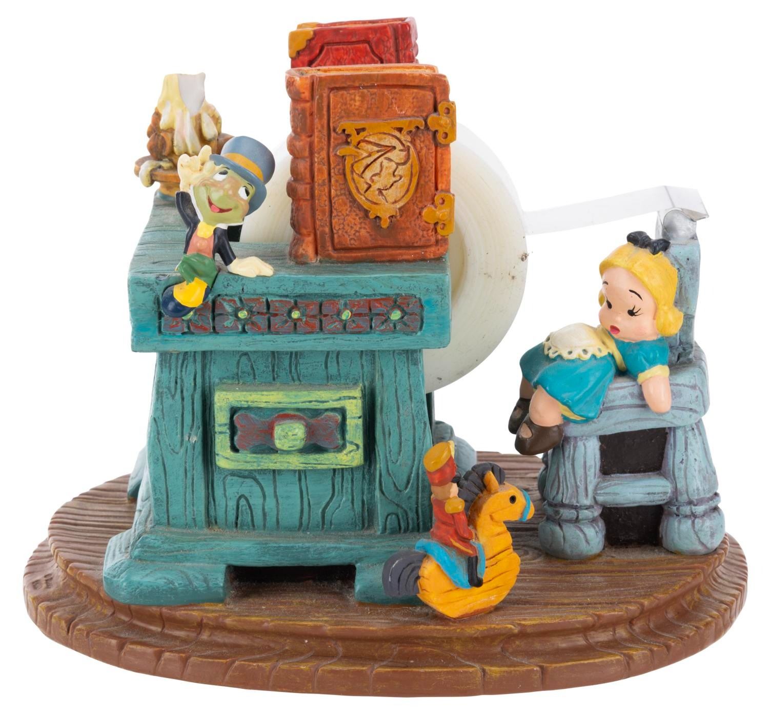 (Disney, 1990s-2000s) A tape dispenser in the shape of Gepetto's work table from "Pinocchio" featuring Jiminy Cricket. Measuring 5" x 6.5" x 4.75", the dispenser is in very good condition with light soiling and dust.
