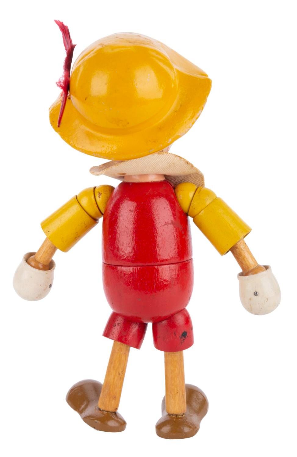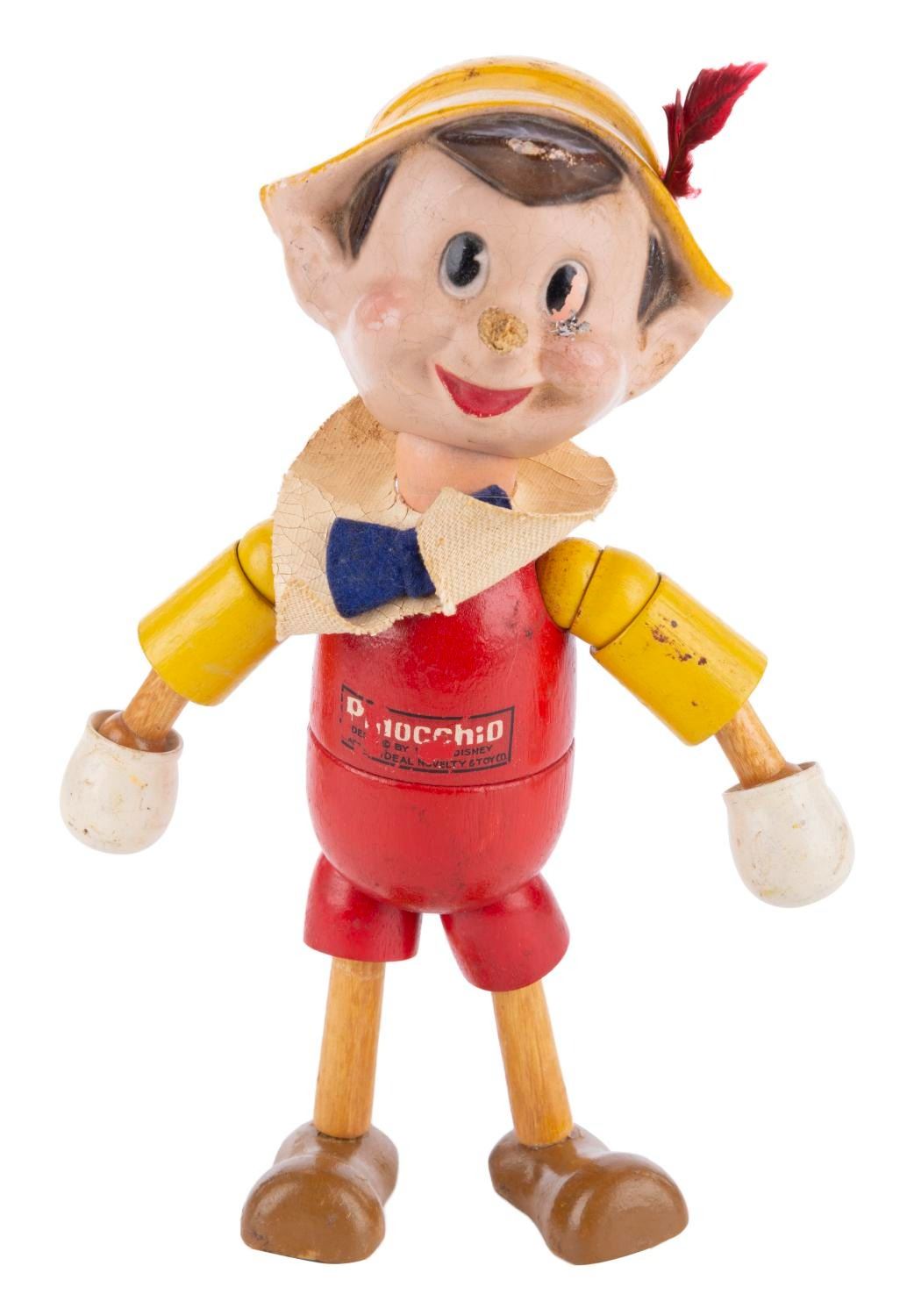 (Ideal, 1940s) A wooden jointed doll of Walt Disney’s Pinocchio, manufactured by the Ideal Novelty and Toy Company. Measuring 9” tall (including the feather), the doll is in very good condition with a broken nose, soiling and wear to textile elements, loose joints, scuffs, scratches and chips to painted areas.