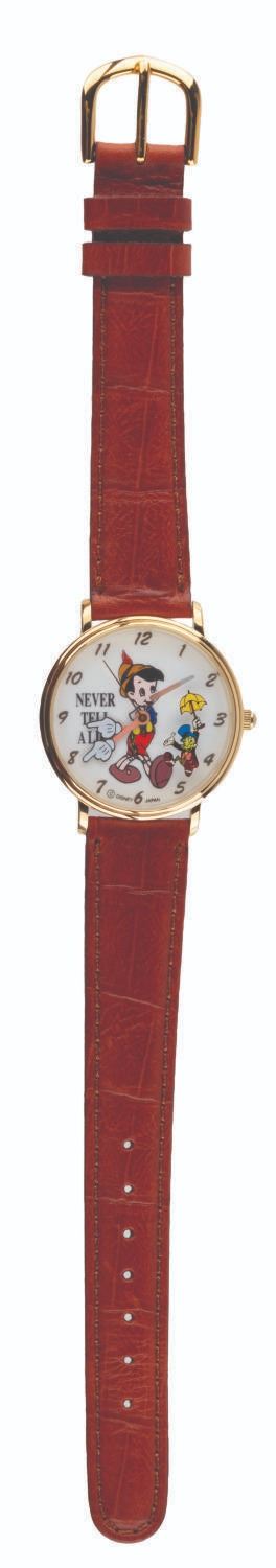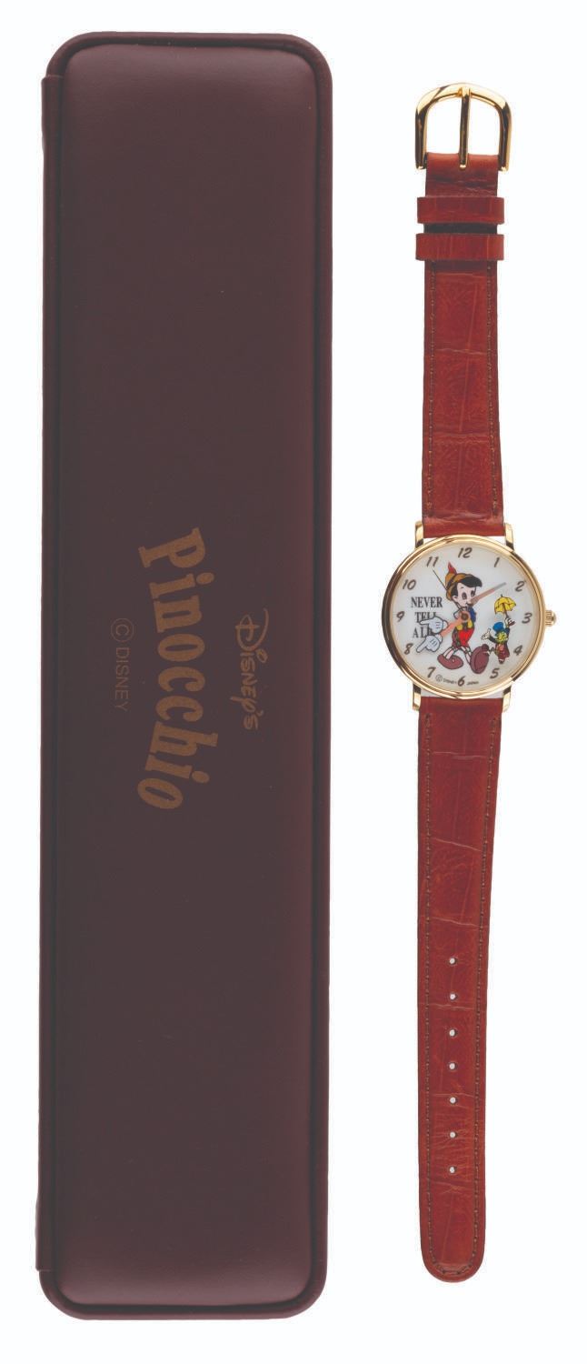 (Disney Store, 1990s) A "Pinocchio " wristwatch featuring Pinocchio and Jiminy Cricket. Measuring 1.25 " in diameter with a 9 " band, the watch is in fine, as-new condition in the original packaging, requiring a battery and possibly service to function. The original packaging exhibits light wear from handling and age.