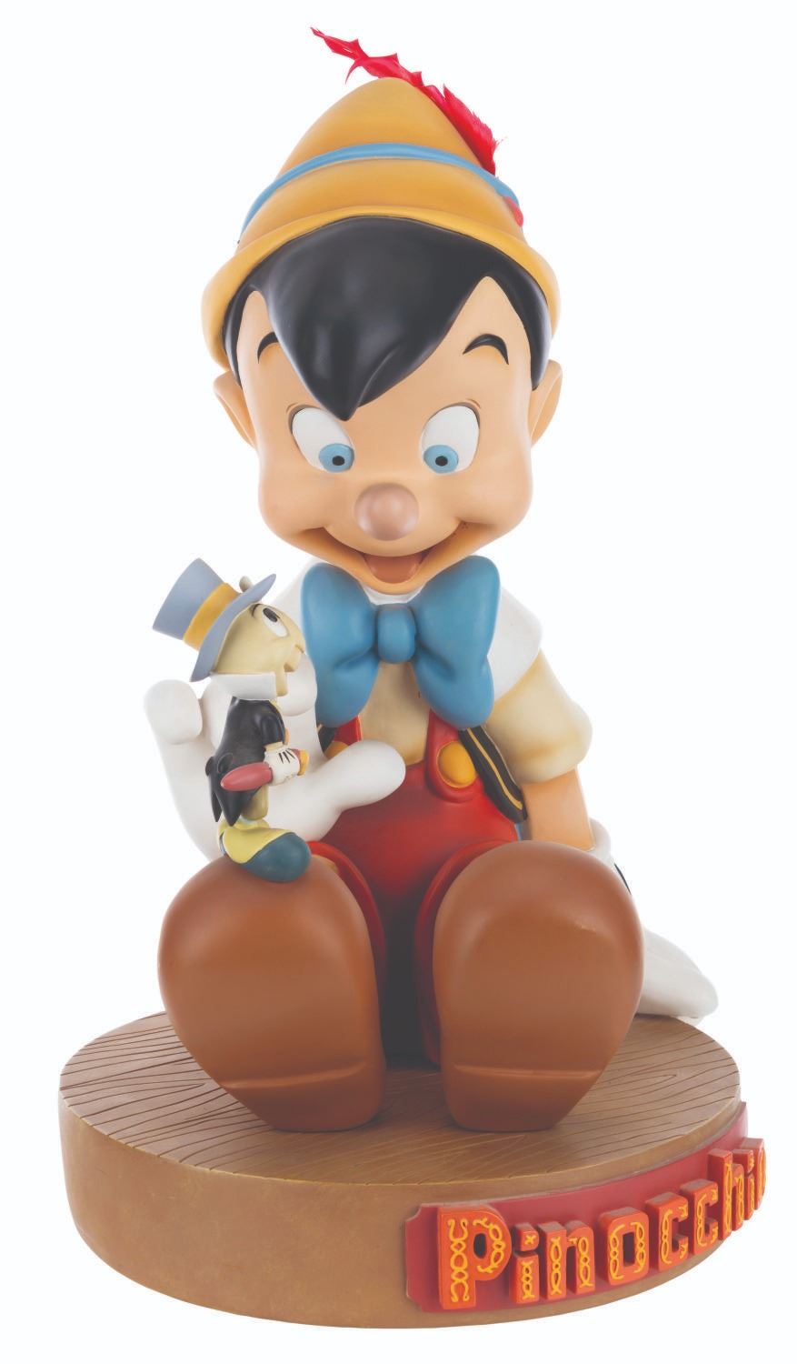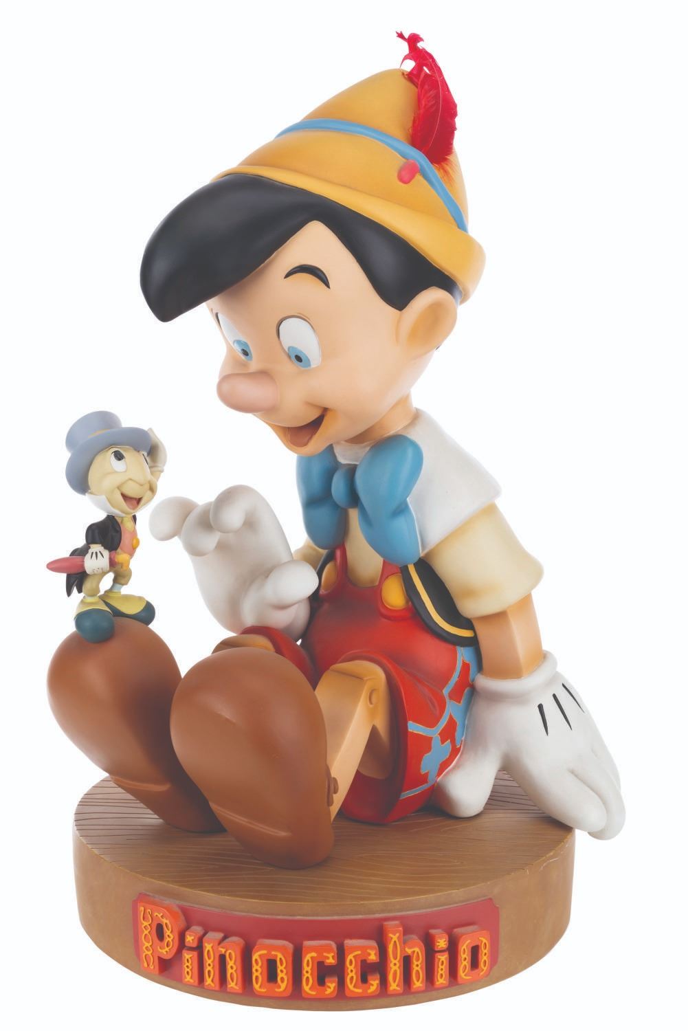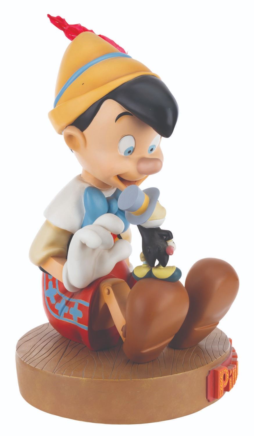 (Disney, 2003) A limited edition Pinocchio and Jiminy Cricket Big Fig statue designed by artists Kevin Kidney and Jody Daily. The intricately detailed cast resin figure is painted in screen-accurate detail with a feather accent on hat. The film's original title treatment is molded into the side of the circular cast resin base. Measuring 10.5” x 10.75” x 16” tall with a 11” in diameter base, the figure displays in very good condition with wear, scratches, and scuffs, including a black mark underneath Pinocchio’s bowtie. Due to size and weight, this item requires special shipping arrangements. Please inquire before bidding.