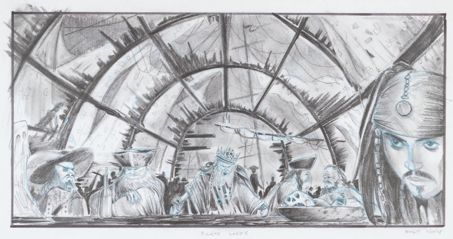 (Disney, 2004) A “Pirates of the Caribbean: At World’s End” concept drawing of Captain Jack Sparrow and his fellow Pirate Lords of the Fourth Brethren Court. Accomplished in graphite and colored pencil by conceptual artist James Byrkit, the drawing with an image size of 7.25” x 14.5” on 11” x 17” vellum is in fine condition.