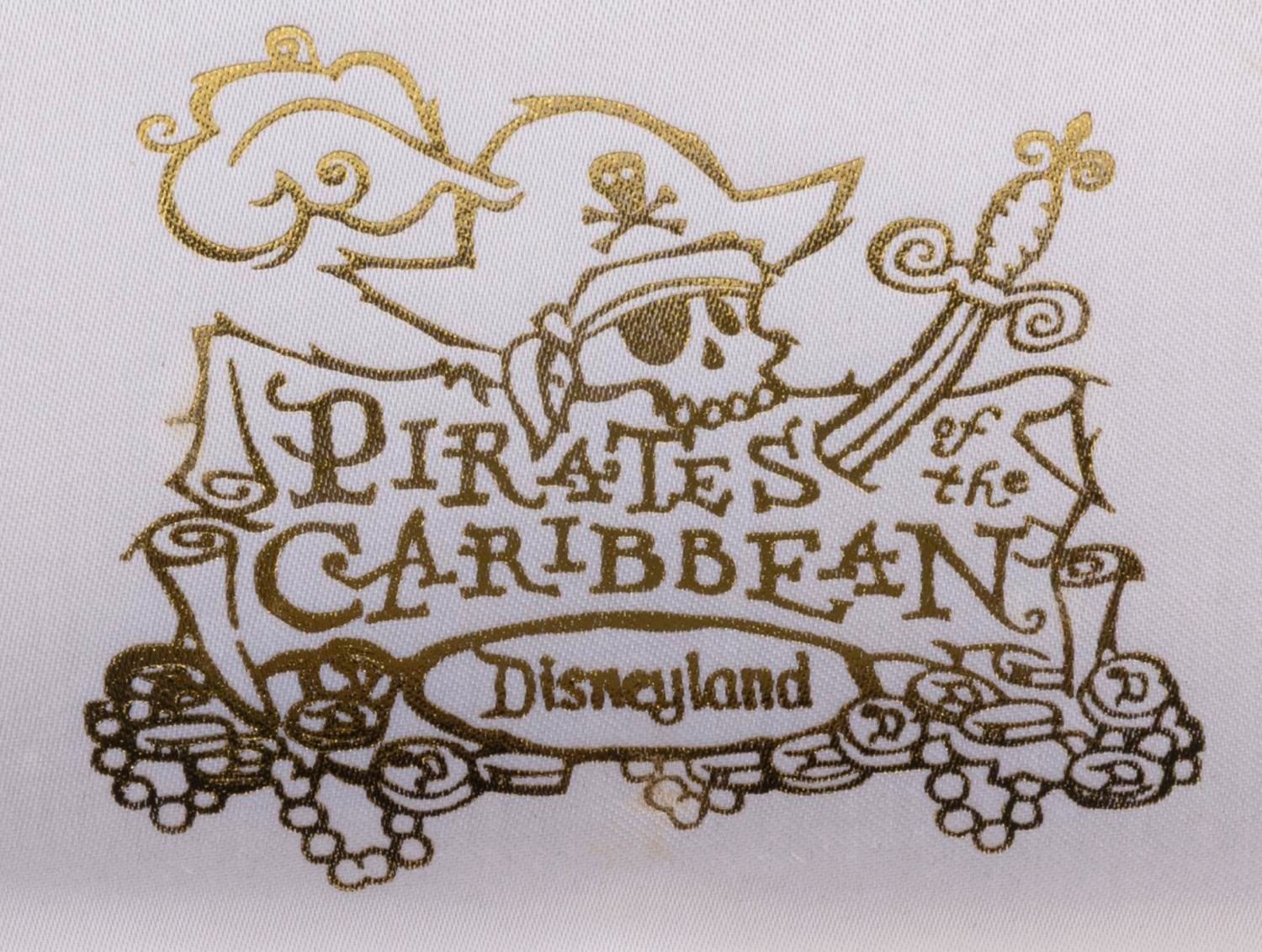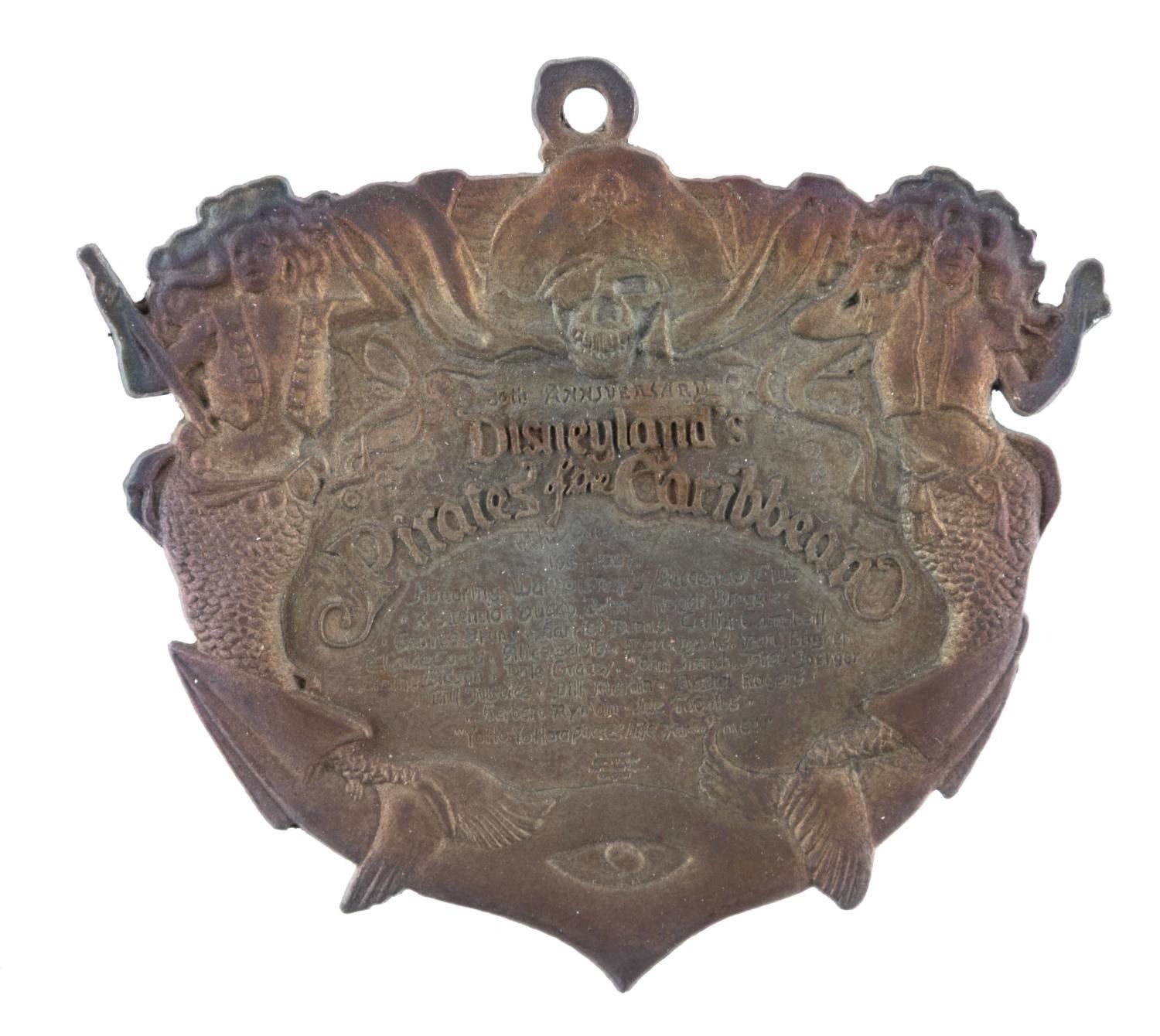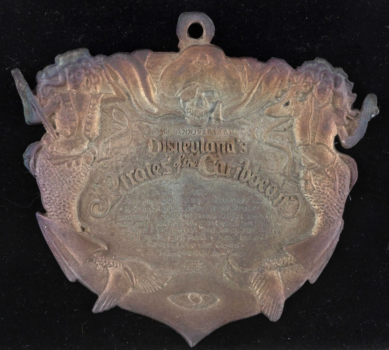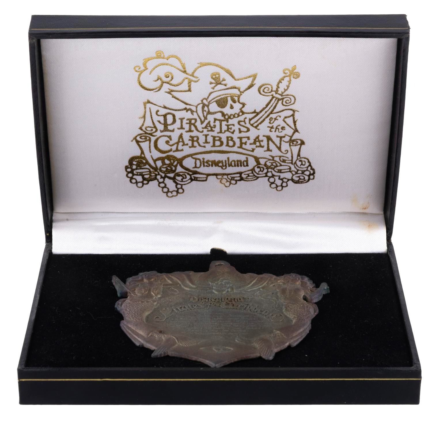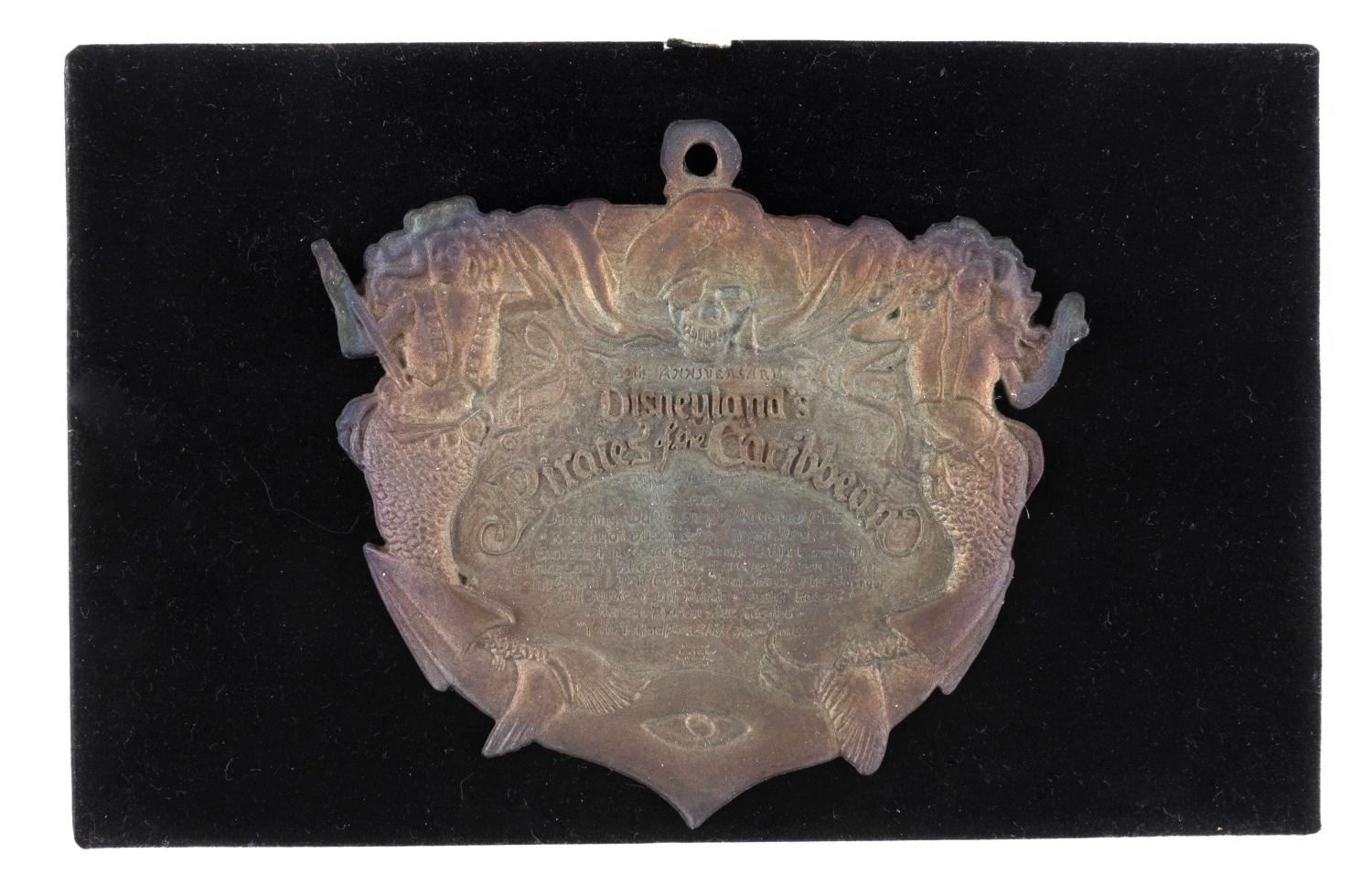 (Disneyland, 1997) A 30th Anniversary Pirates of the Caribbean plaque pin. Accomplished in brass with an intentionally aged finish, the text includes a list of the individuals, referred to as Walt Disney's Buccaneer Club, responsible for the creation of the attraction, including Marc Davis and Herbert Ryman. Excessive handling will turn touched areas black due to the finish, and can not be removed. Measuring 3.5” x 3.5”, the pin displays in very good condition with signs of handling along the top edge. The pin is presented in a 6.25” x 4.5” x 1.25” velvet-lined box in very good condition with light scuffs and stains.