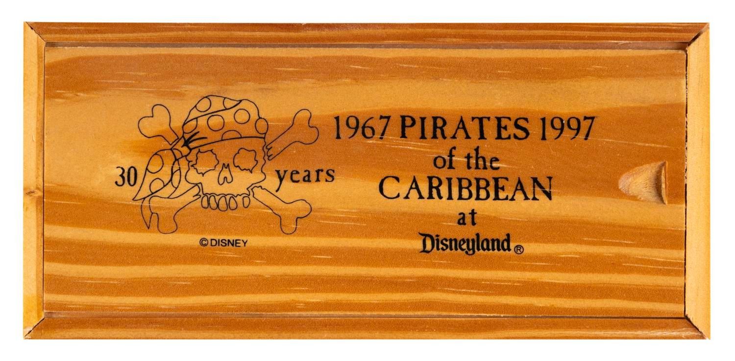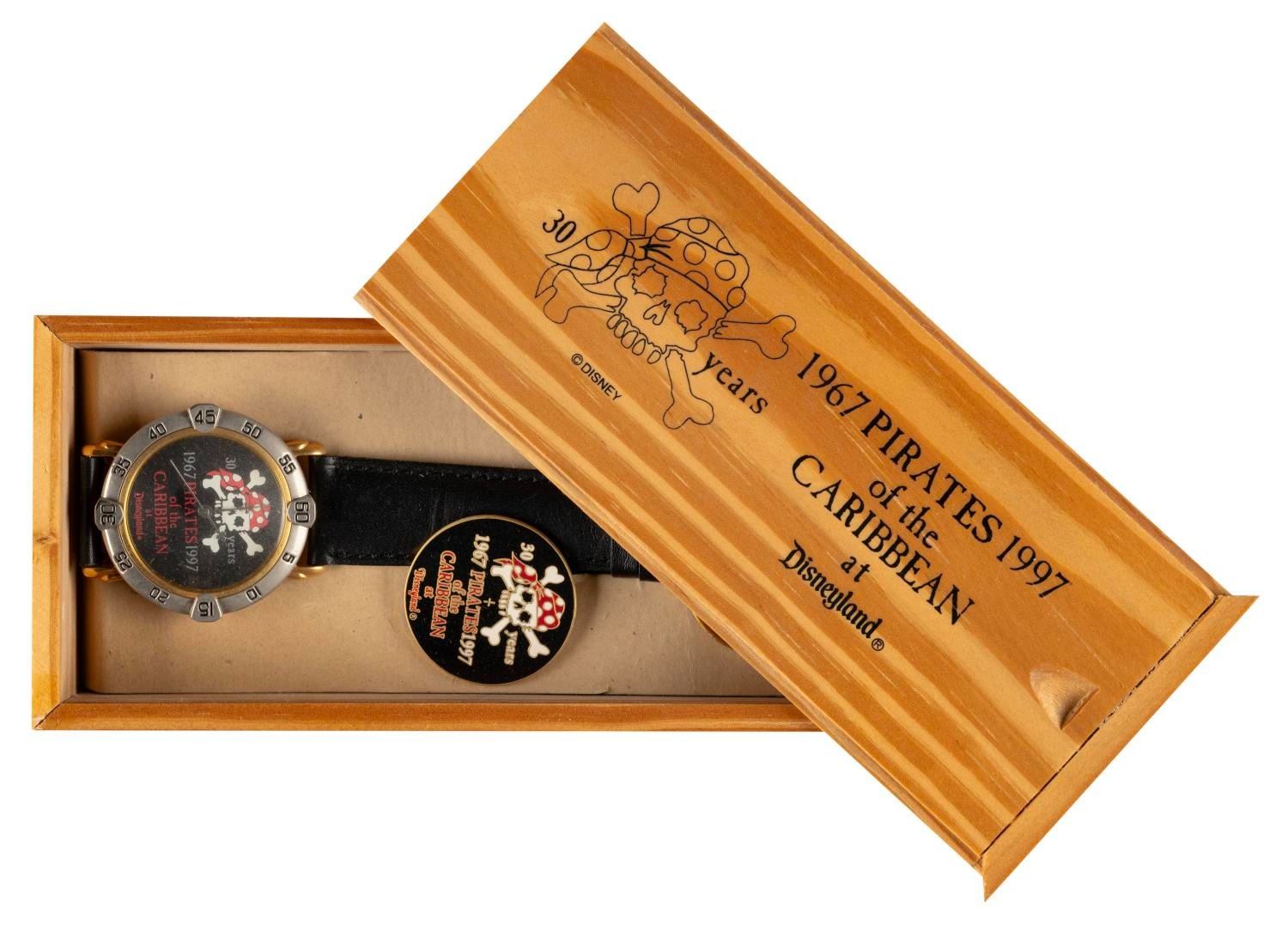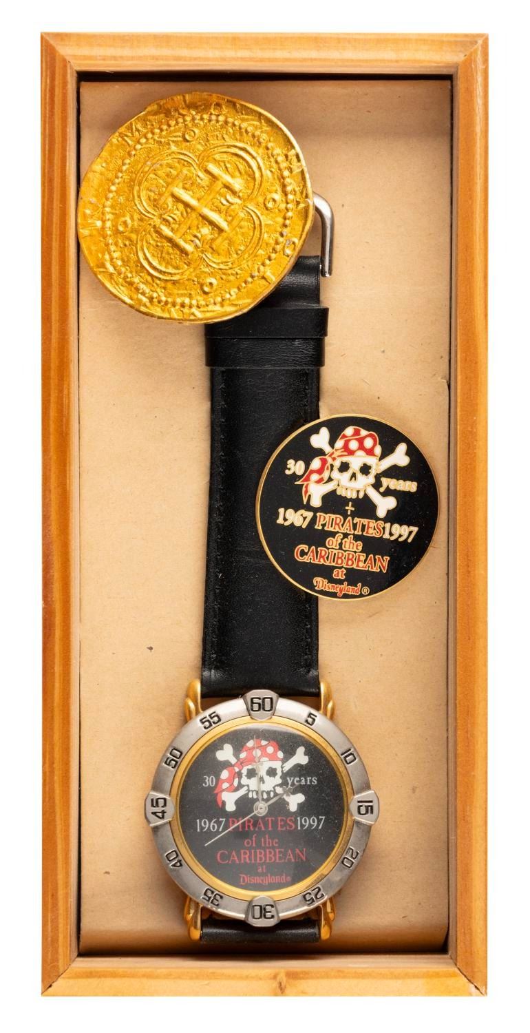 (Disneyland, 1997) A Cast Member exclusive wristwatch and pin released for the 30th Anniversary of Pirates of the Caribbean at Disneyland. The watch is etched on the reverse with the edition number 170 of only 200. Included with the lot is a fake gold pirate's coin. Measuring 9.25", and 1.25" in diameter, in their 3" x 6.5" x 1.25" wooden collector's box, the watch and pin respectively are in good condition with wear from age and a 0.5" light scratch on the watch strap.