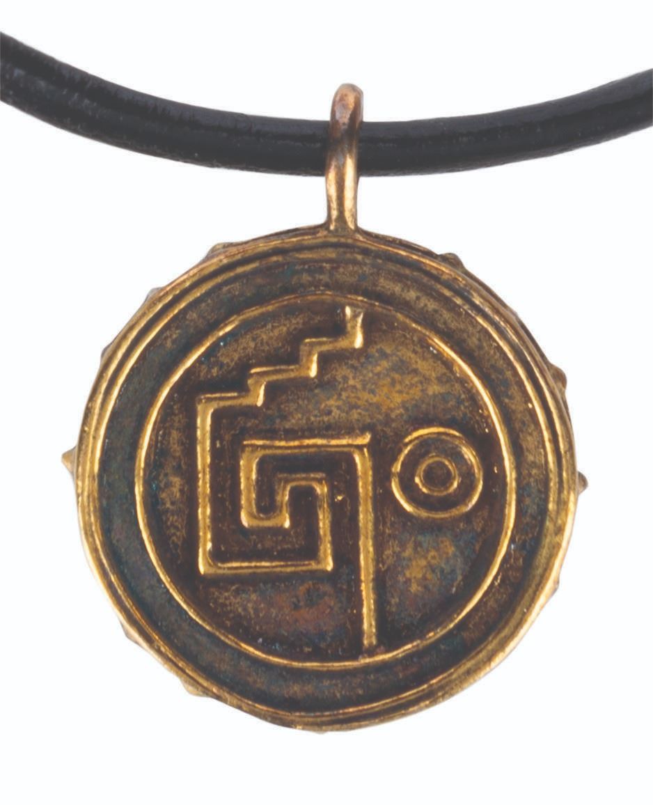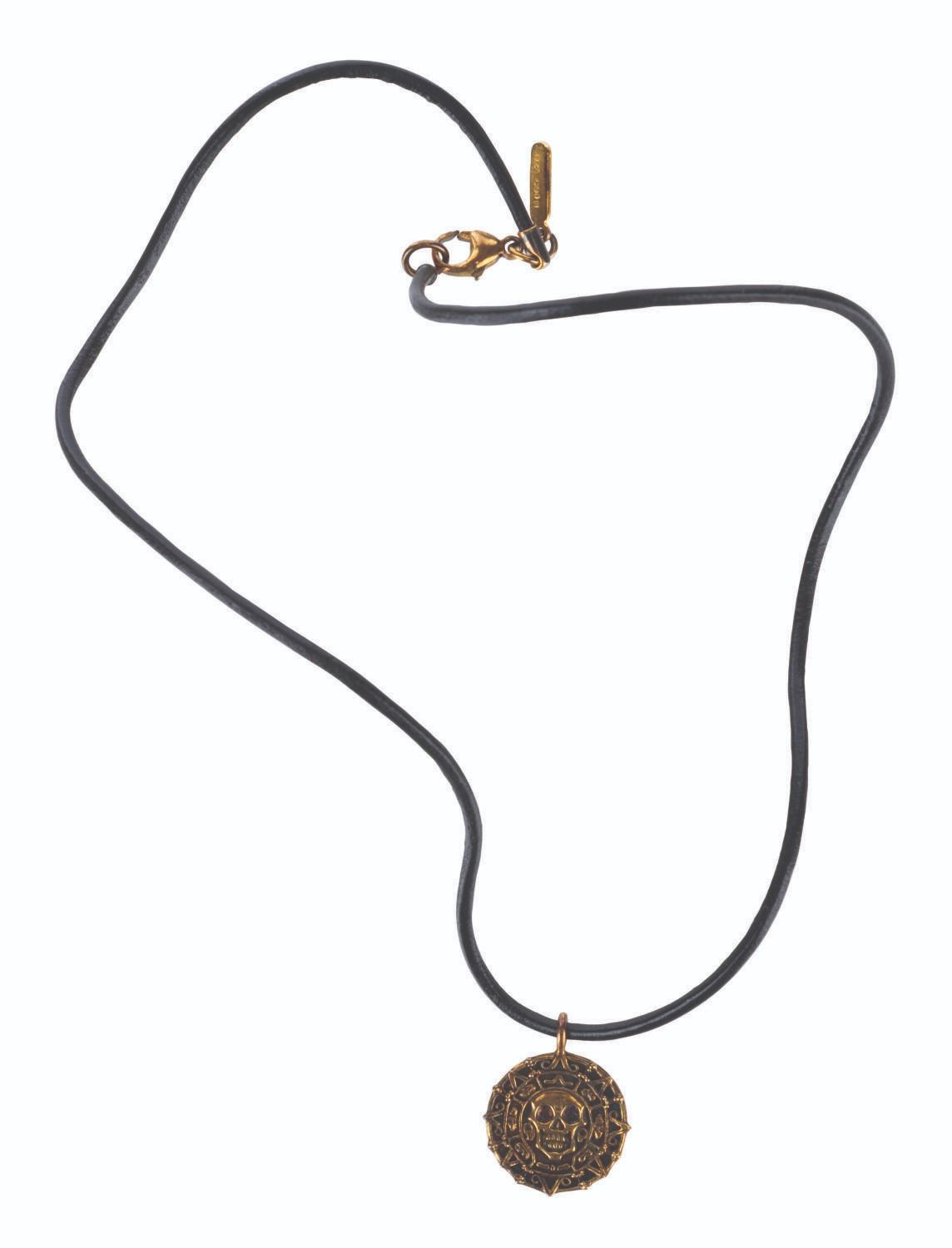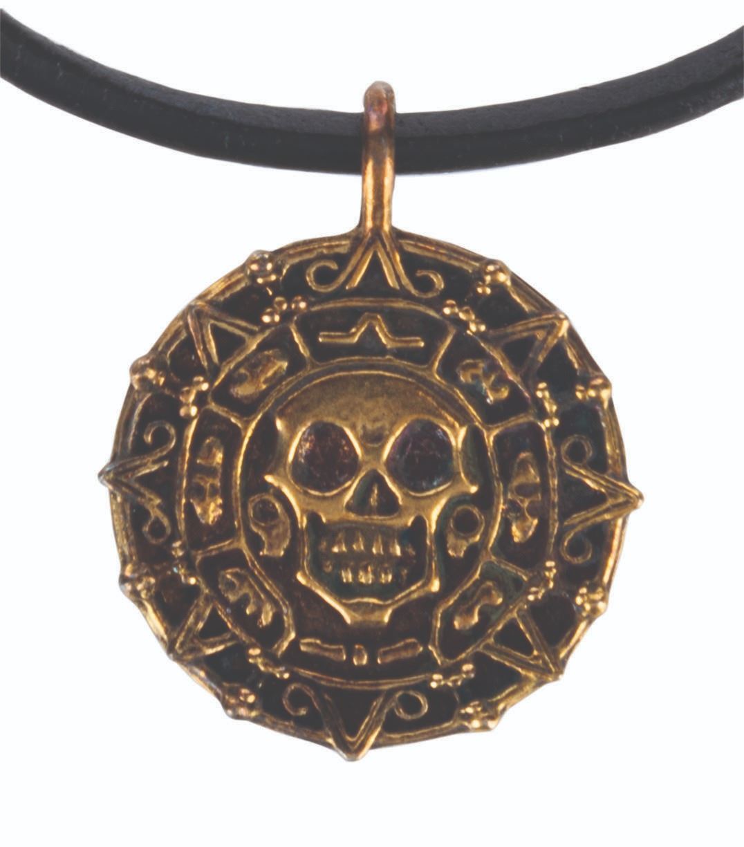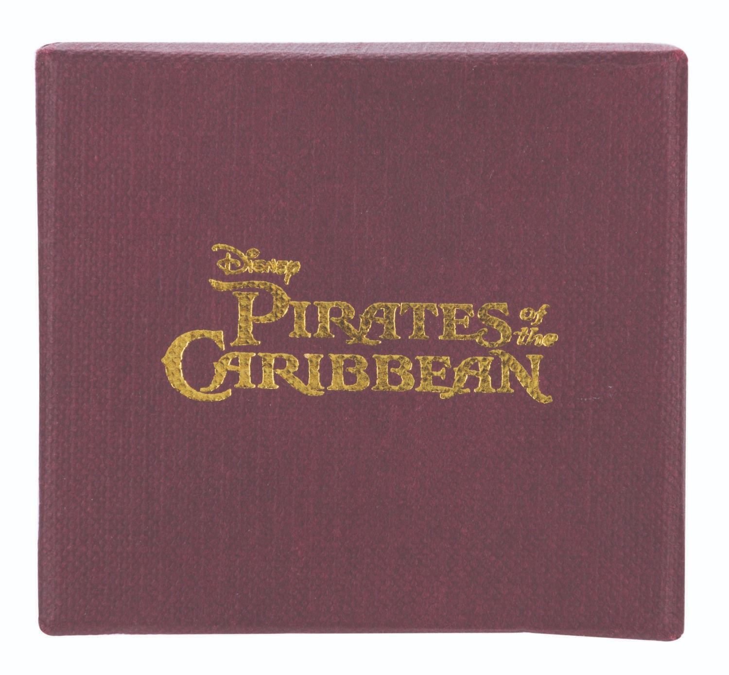 (Disney, 2000s) A pendant of a cursed Aztec gold coin from "Pirates of the Caribbean” on a black cord. Measuring 0.75” in diameter and 9” long in its original 2.25” x 2.75” x 1.25” box, the piece is in very good condition with light wear and a sticker to the bottom of the box.