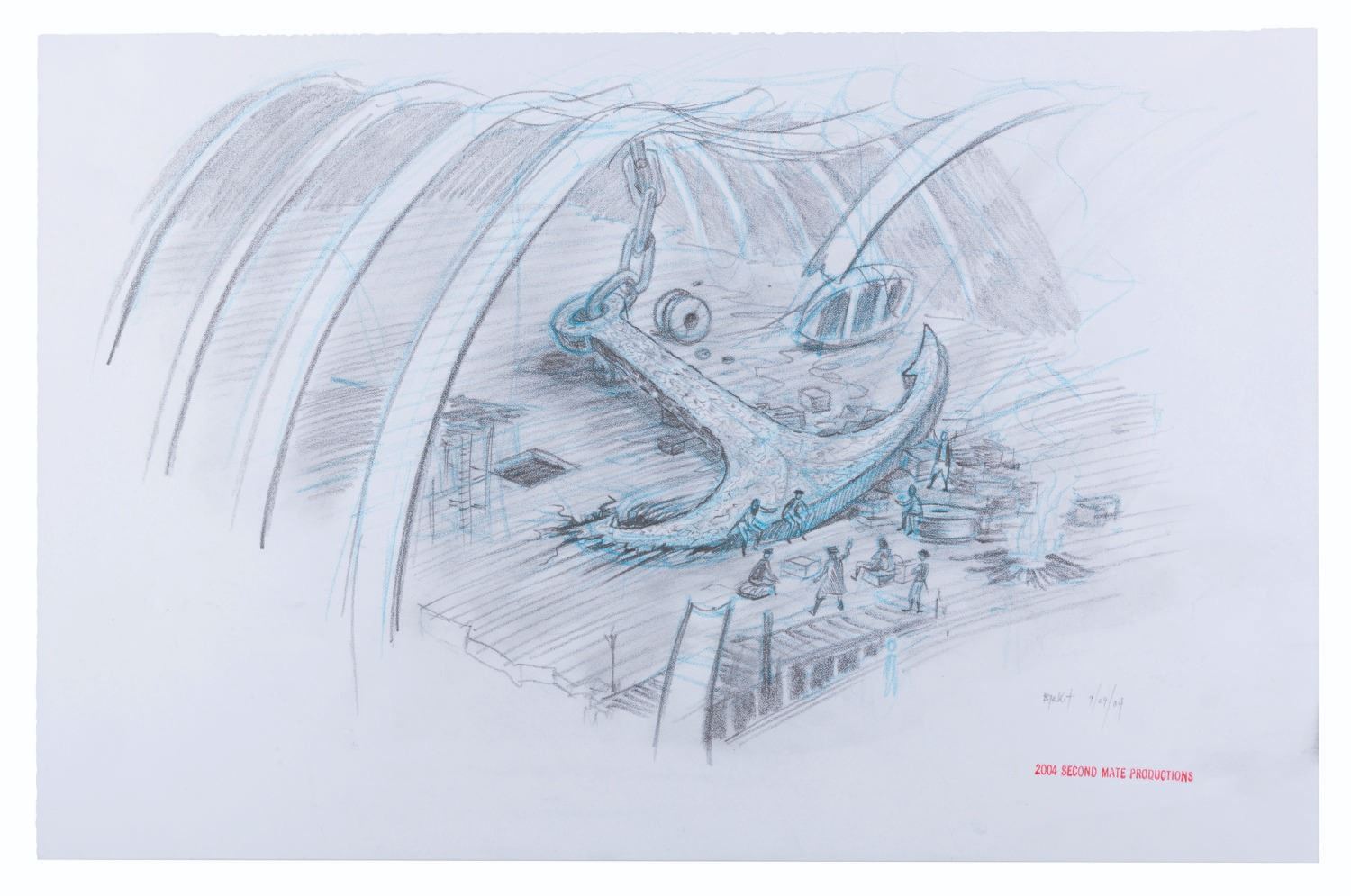 (Disney, 2004) A concept drawing of a shipwreck set from "Dead Man’s Chest” by the film’s creative consultant and storyboard artist, James Byrkit. Measuring 11” x 17”, the graphite and blue pencil drawing on vellum displays in fine condition.