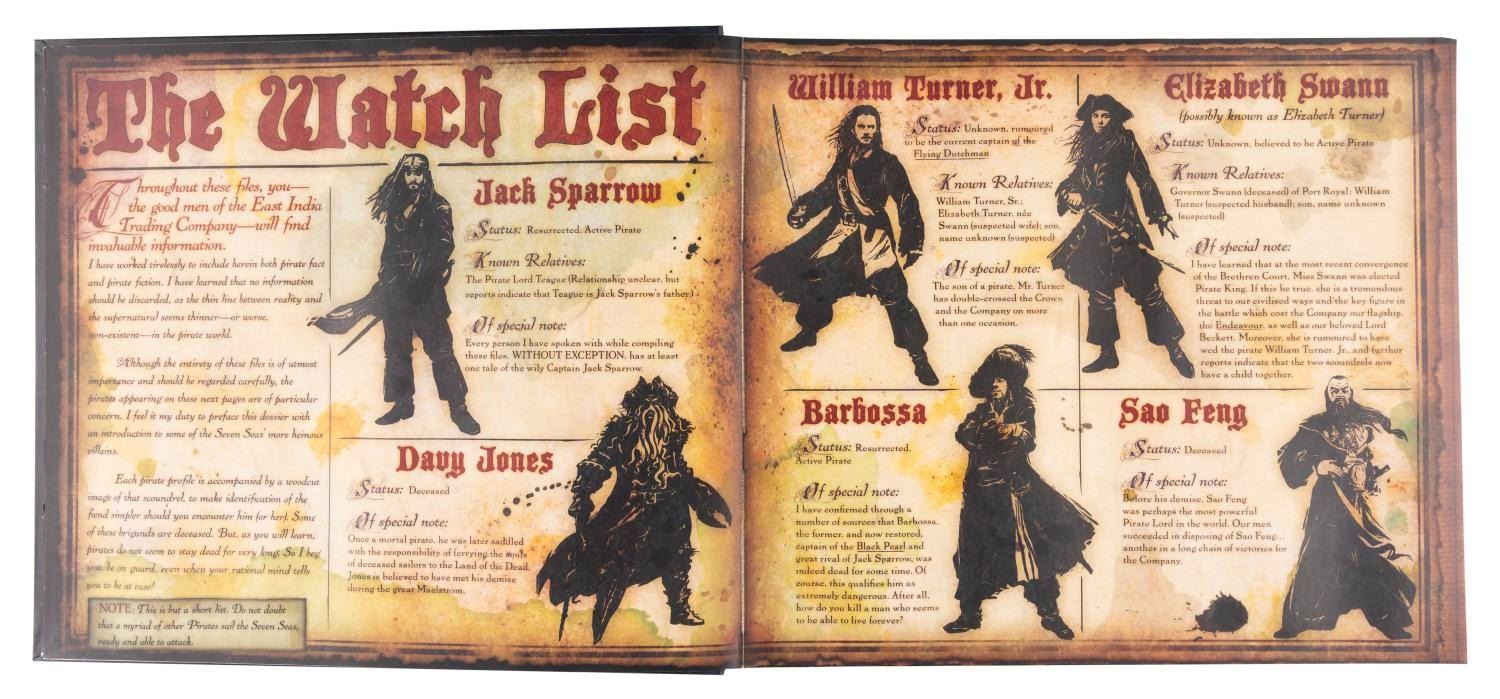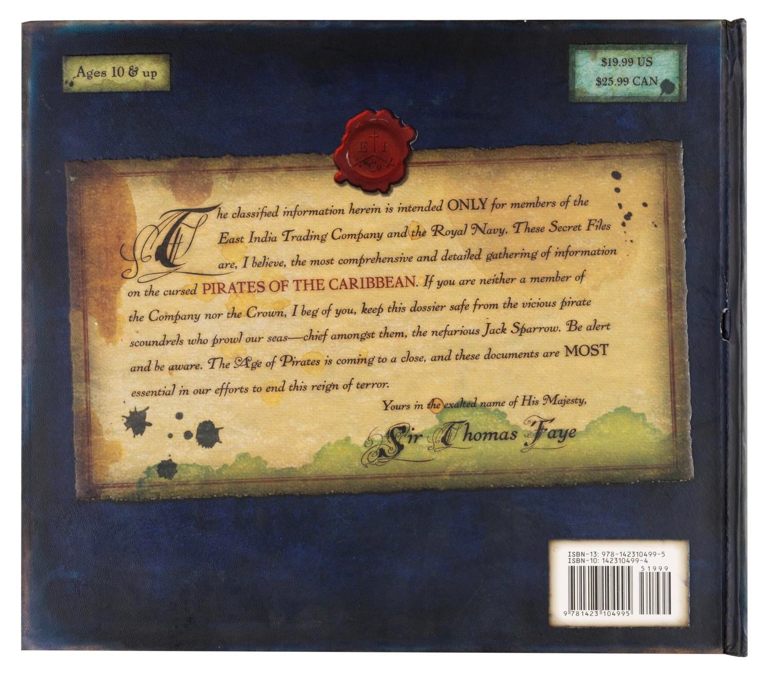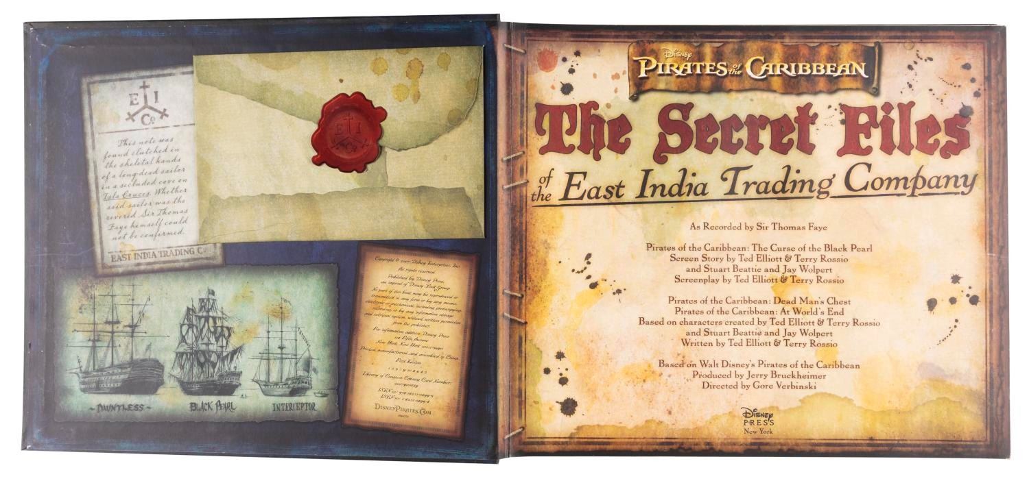 (Disney Press, 2007) A Disney Pirates of the Caribbean: The Secret Files of the East India Trading Company hardcover book written by "Sir Thomas Kaye." The 28-page book written through the perspective of the East India Trading Company, compiles information on the fearsome pirates of the Pirates of the Caribbean Franchise, including ships, legends, and facts about key characters. Measuring 10.5” x 12”, the book displays in very good condition with light scratches and wear.