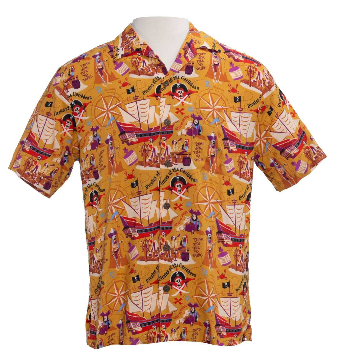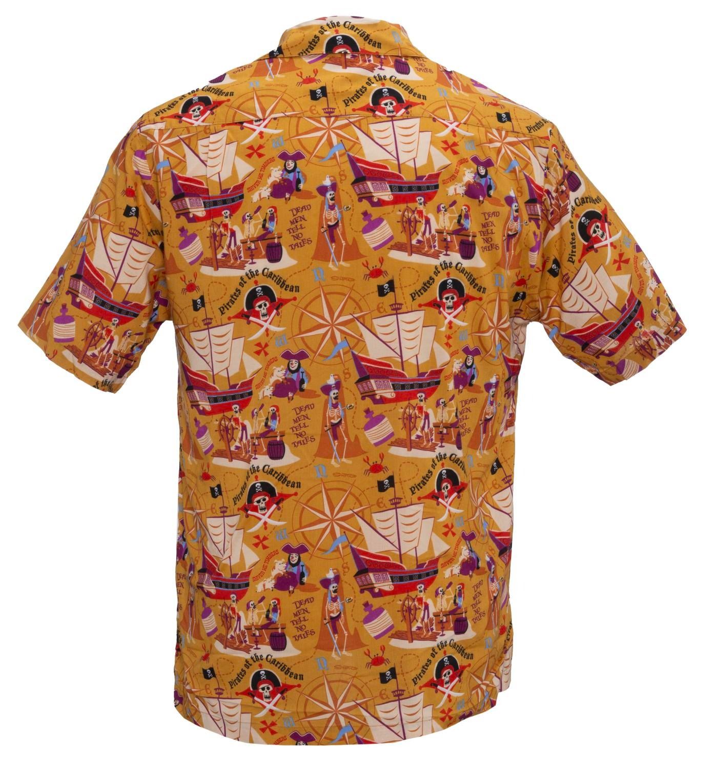 (Disneyland, 2017) A Pirates of the Caribbean Hawaiian-style shirt designed by SHAG, released through the Wonderground Gallery and the D23 Expo for the attraction's 50th anniversary. Labeled a size large, the 100% rayon woven shirt is in very good condition with light wear.