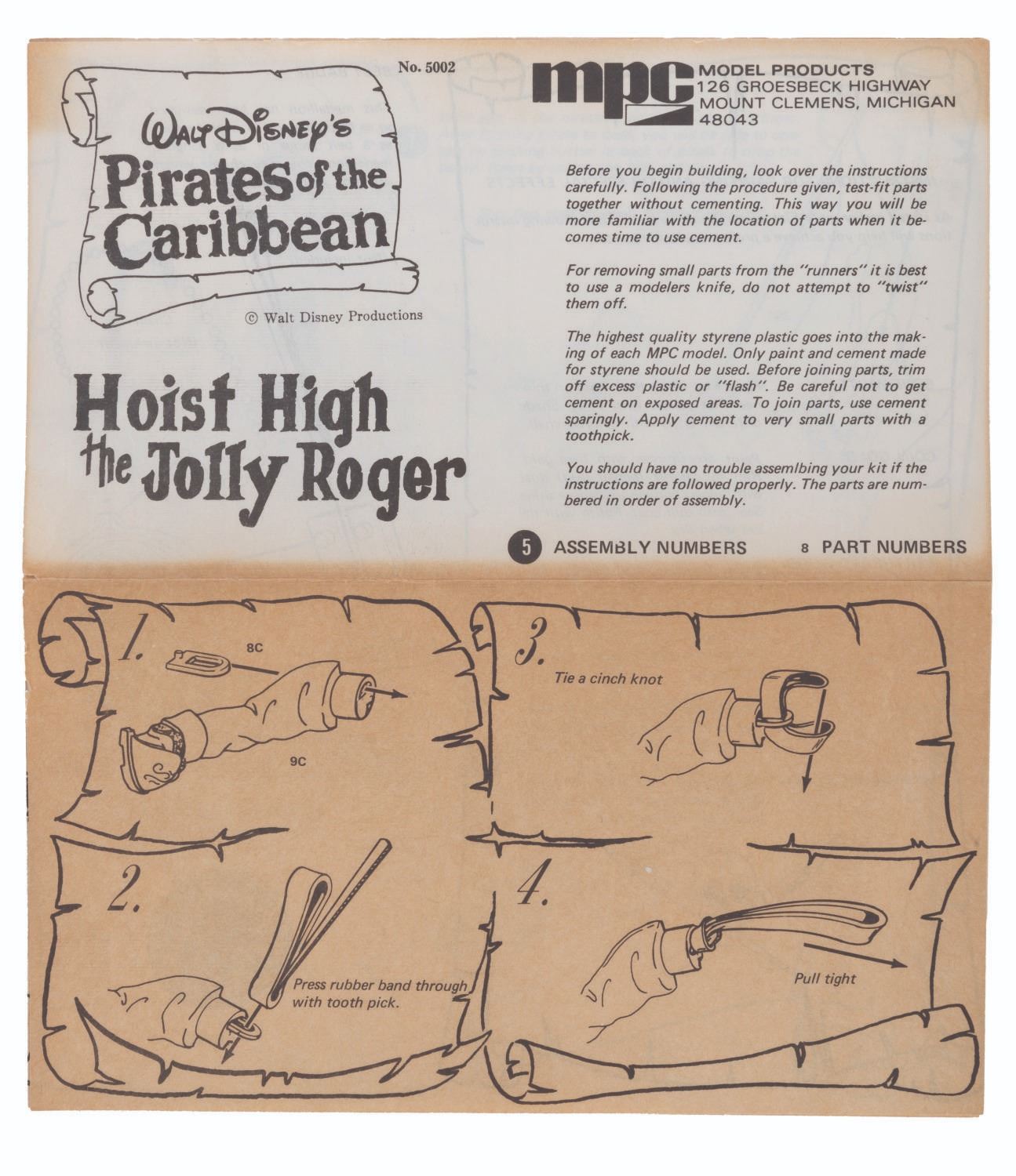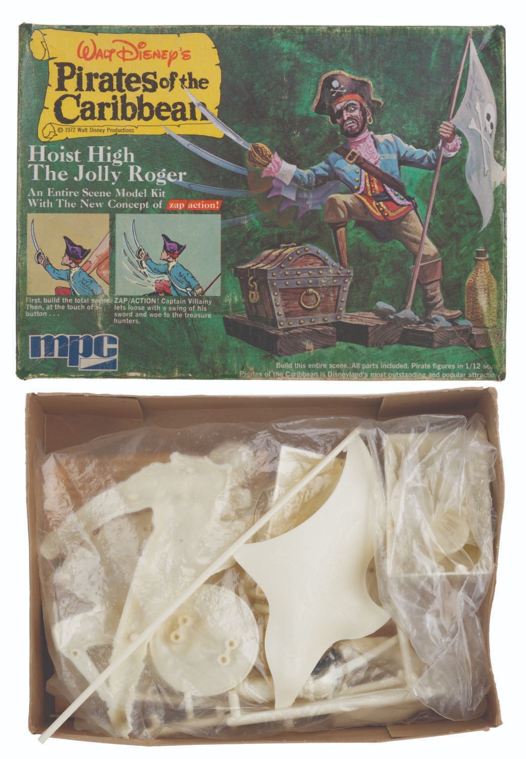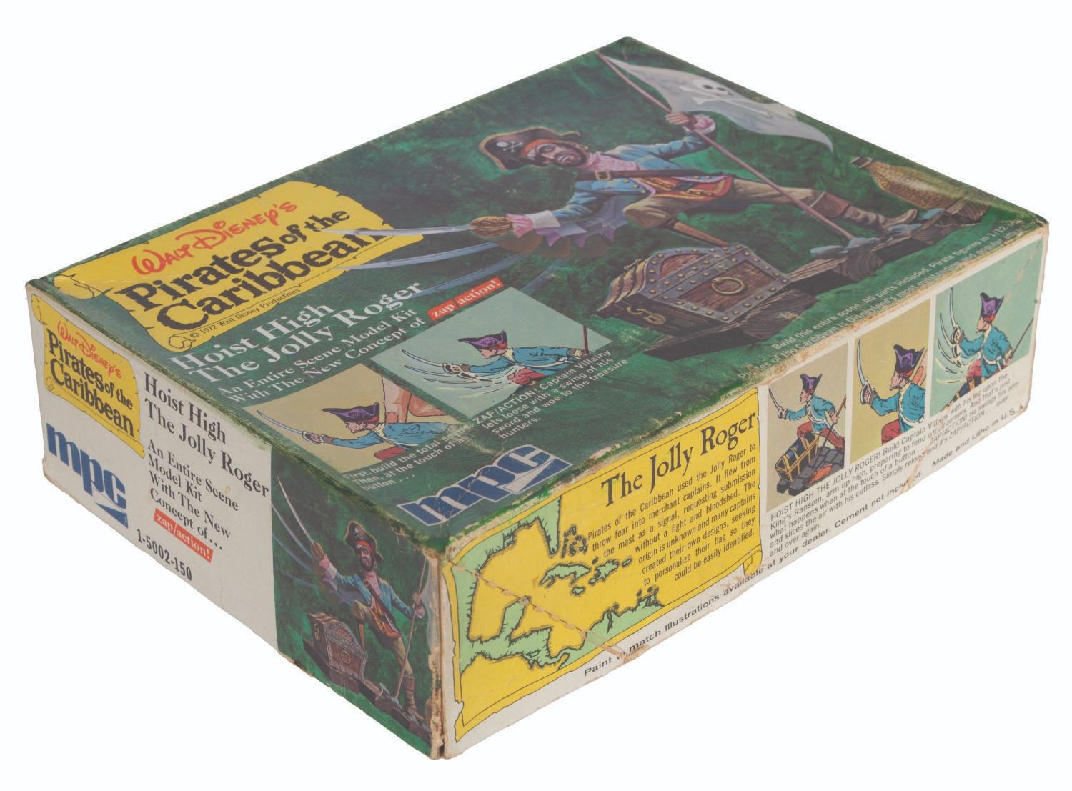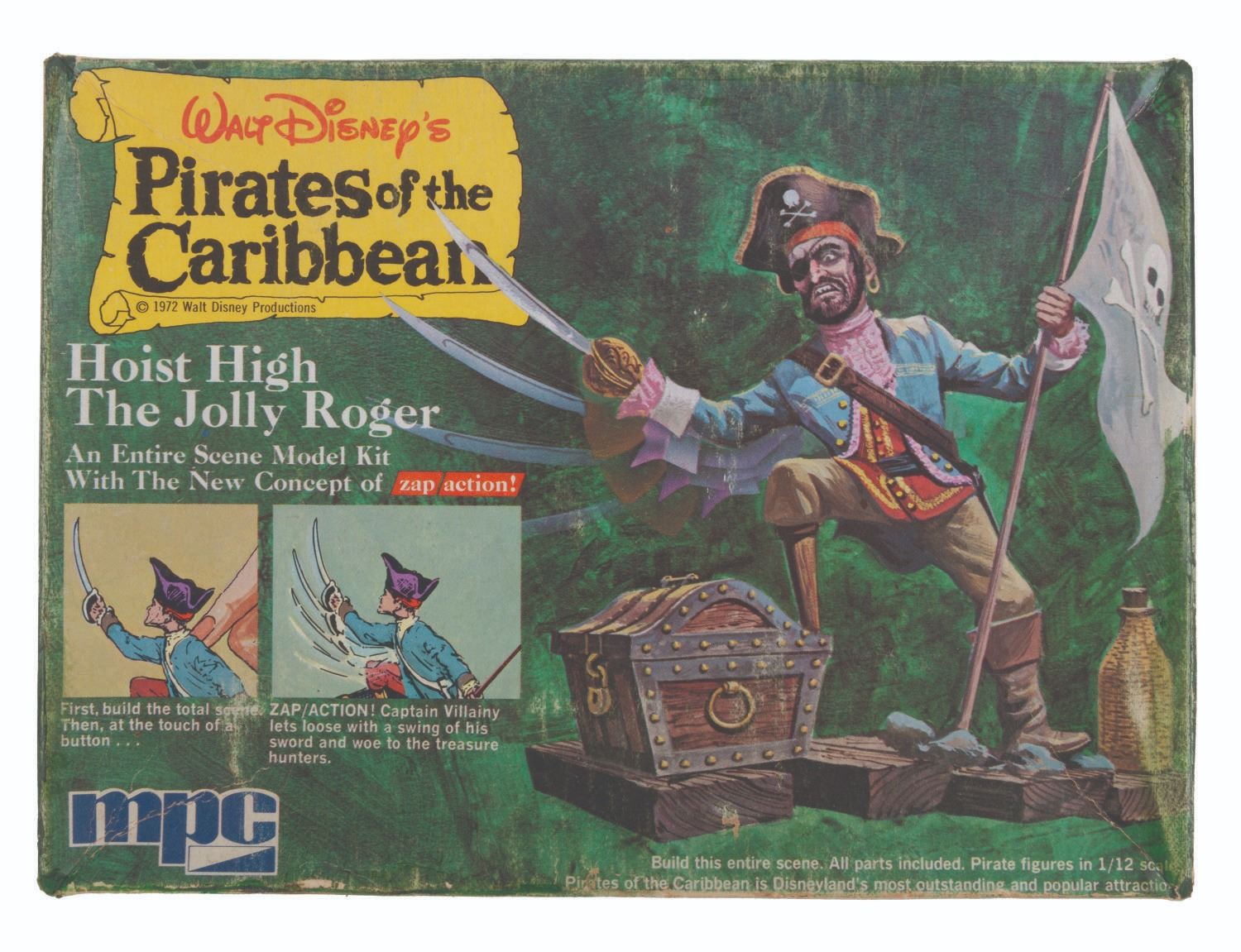 (MPC, 1972) A Walt Disney’s Pirates of the Caribbean: Hoist High The Jolly Roger model kit by MPC. This 1/12 scale model scene is complete in the original box with instructions, fact sheet, and parts separated from flash. Measuring 8.25" x 6" and 2.5" deep, the box displays in good condition with edge wear, light warping, and small creases from handling. The model is in fine condition with rubber bands aged and requiring replacing, and the instruction sheet showing wear and heavy discoloration on one folded side.