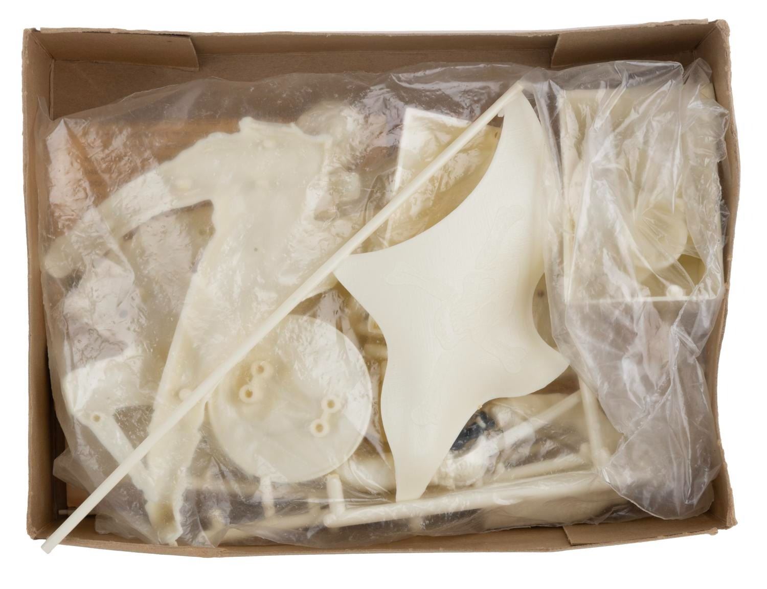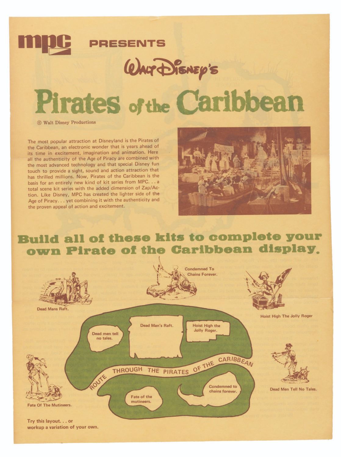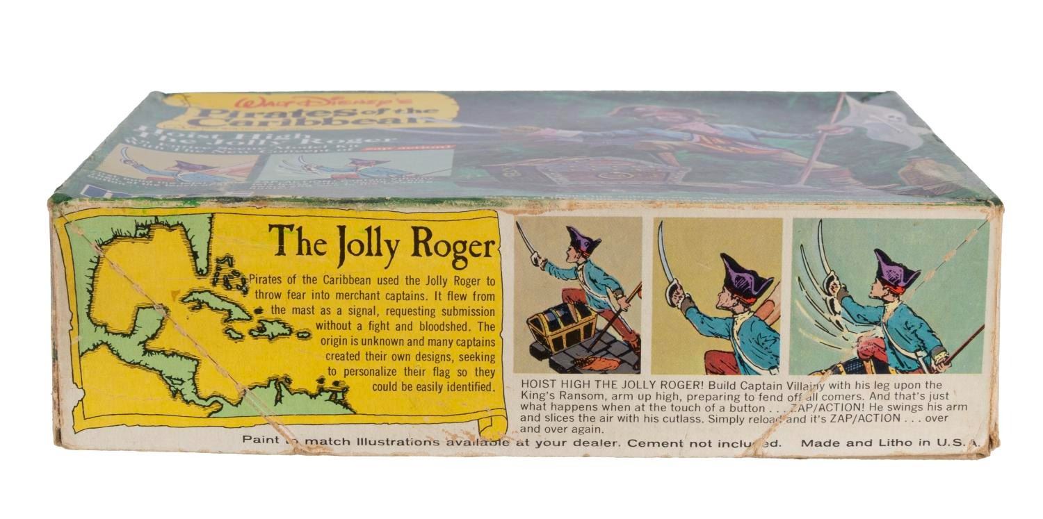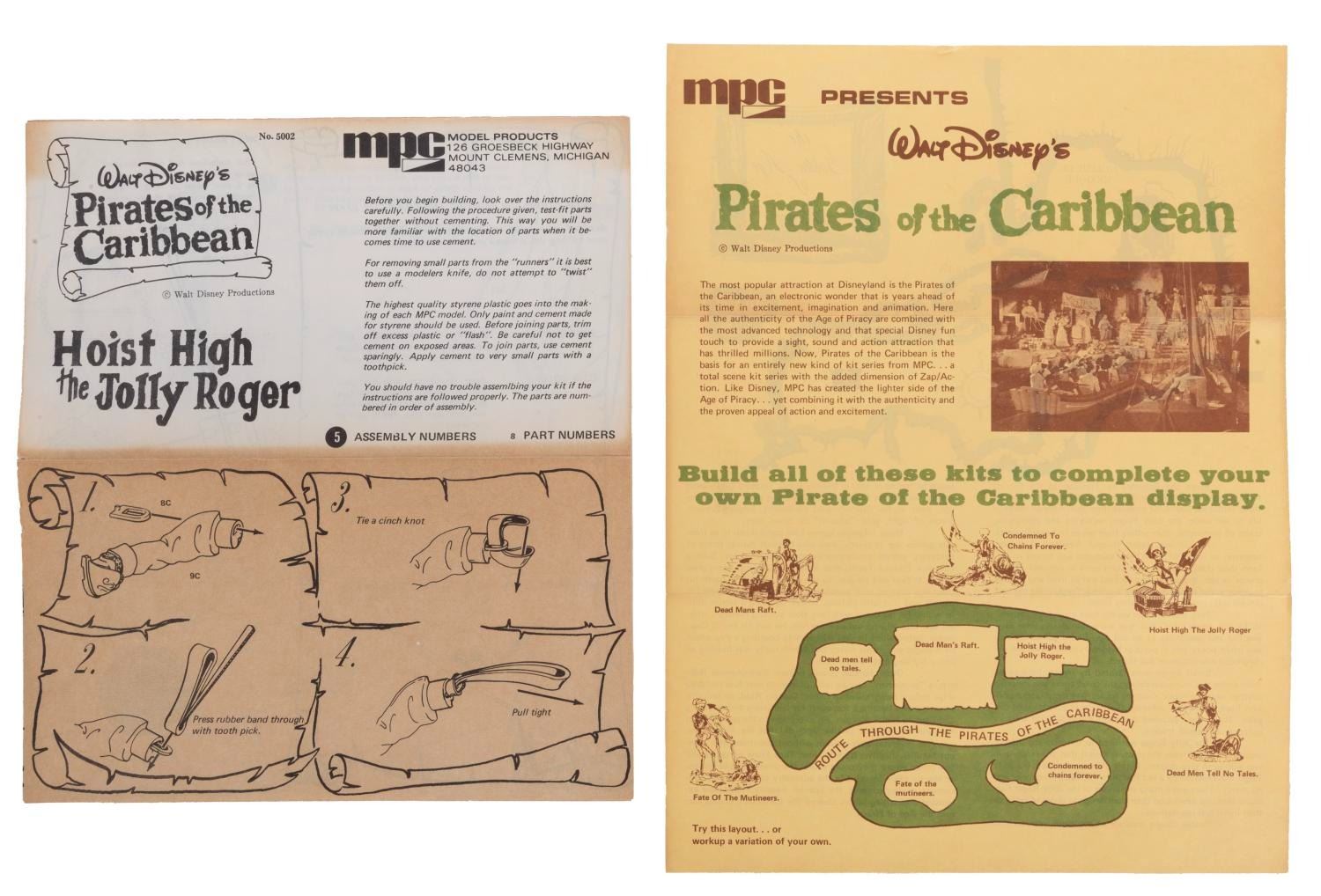 (MPC, 1972) A Walt Disney’s Pirates of the Caribbean: Hoist High The Jolly Roger model kit by MPC. This 1/12 scale model scene is complete in the original box with instructions, fact sheet, and parts separated from flash. Measuring 8.25" x 6" and 2.5" deep, the box displays in good condition with edge wear, light warping, and small creases from handling. The model is in fine condition with rubber bands aged and requiring replacing, and the instruction sheet showing wear and heavy discoloration on one folded side.