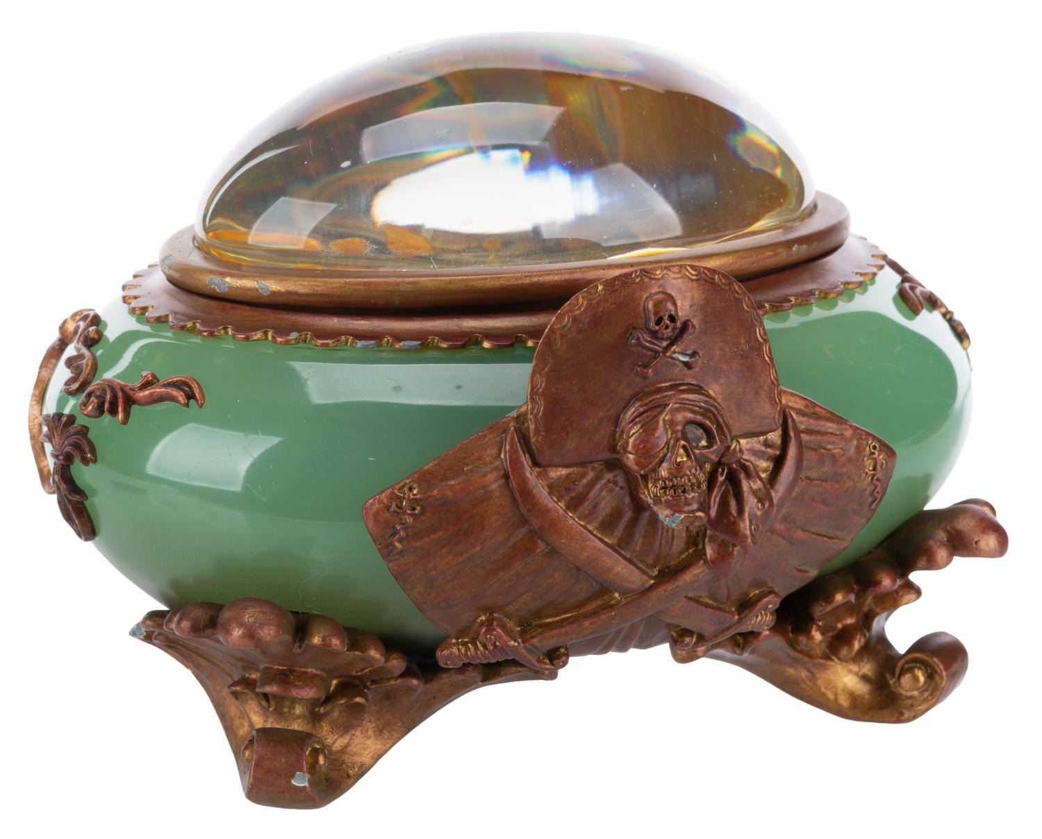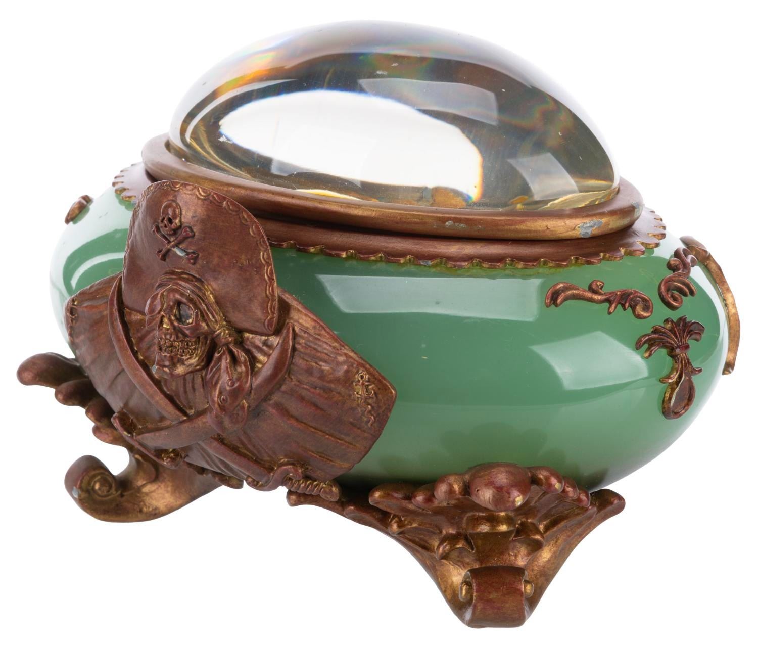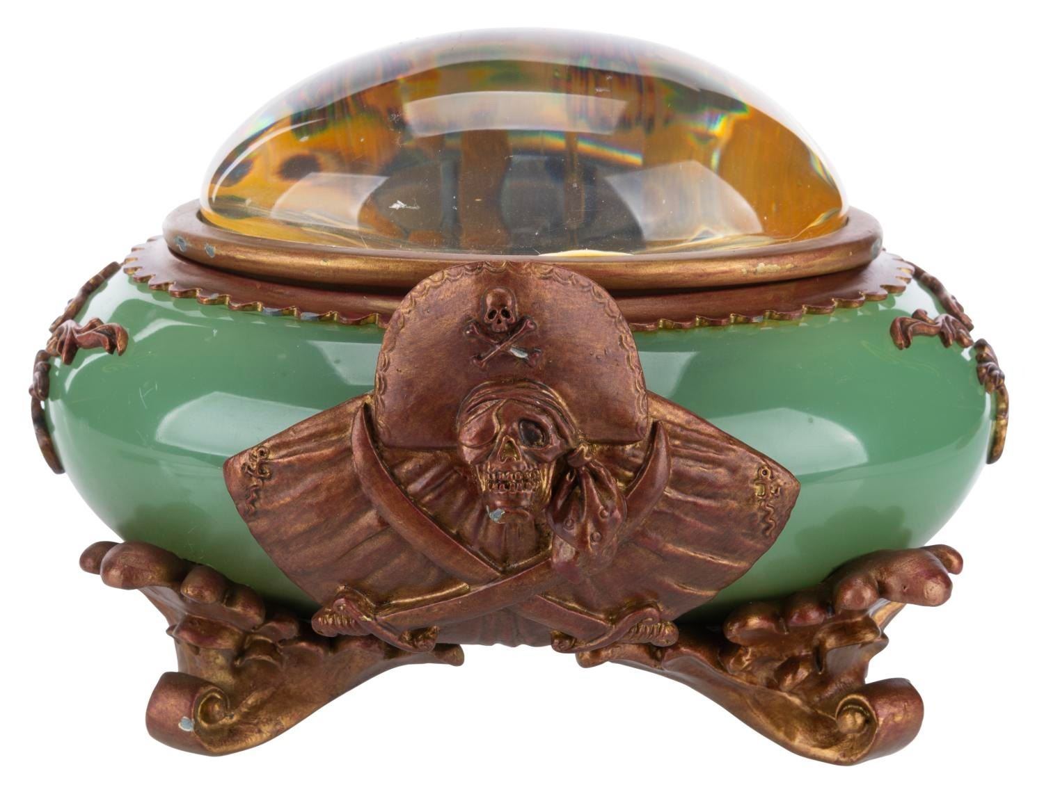 (Disneyland, 2005) A Pirates of the Caribbean jewelry box with a removable lid, released in a limited edition of 1000. Inside the dome lid is a recreation of Marc Davis' "Portrait of Things to Come," which Guests see during the attraction. Measuring 5.75” x 7” x 4.5” tall, the jewelry box displays in good condition with scratches, chips, wear, and scuffs throughout.