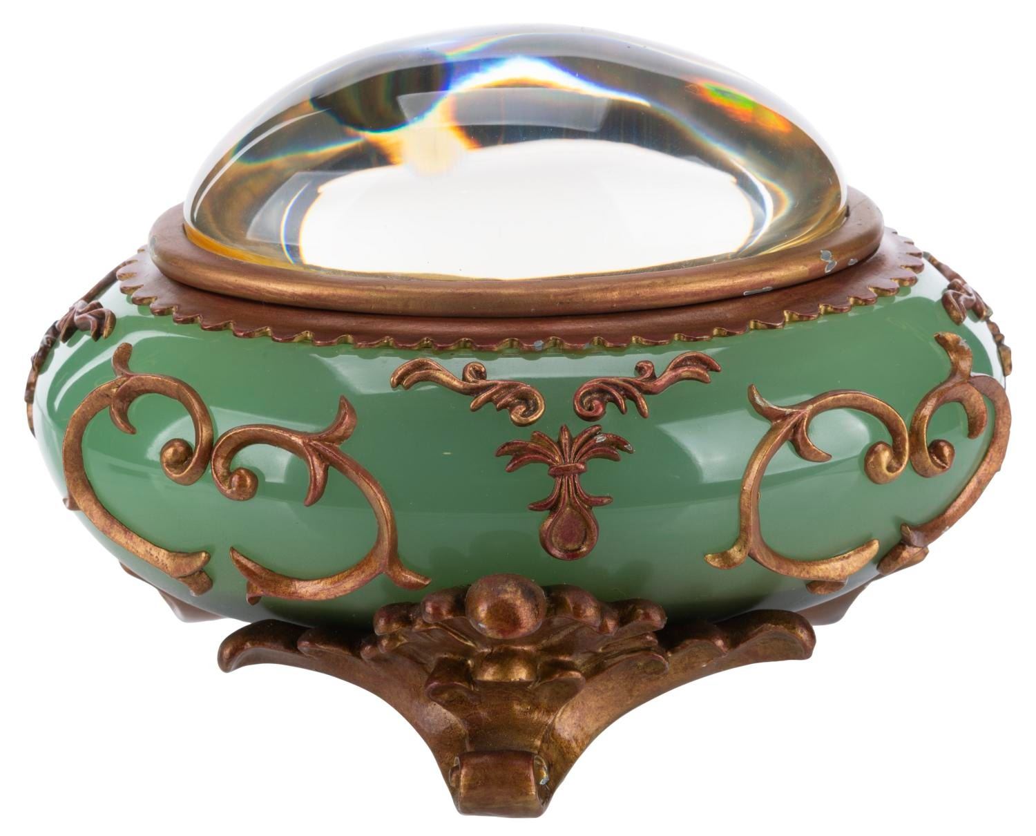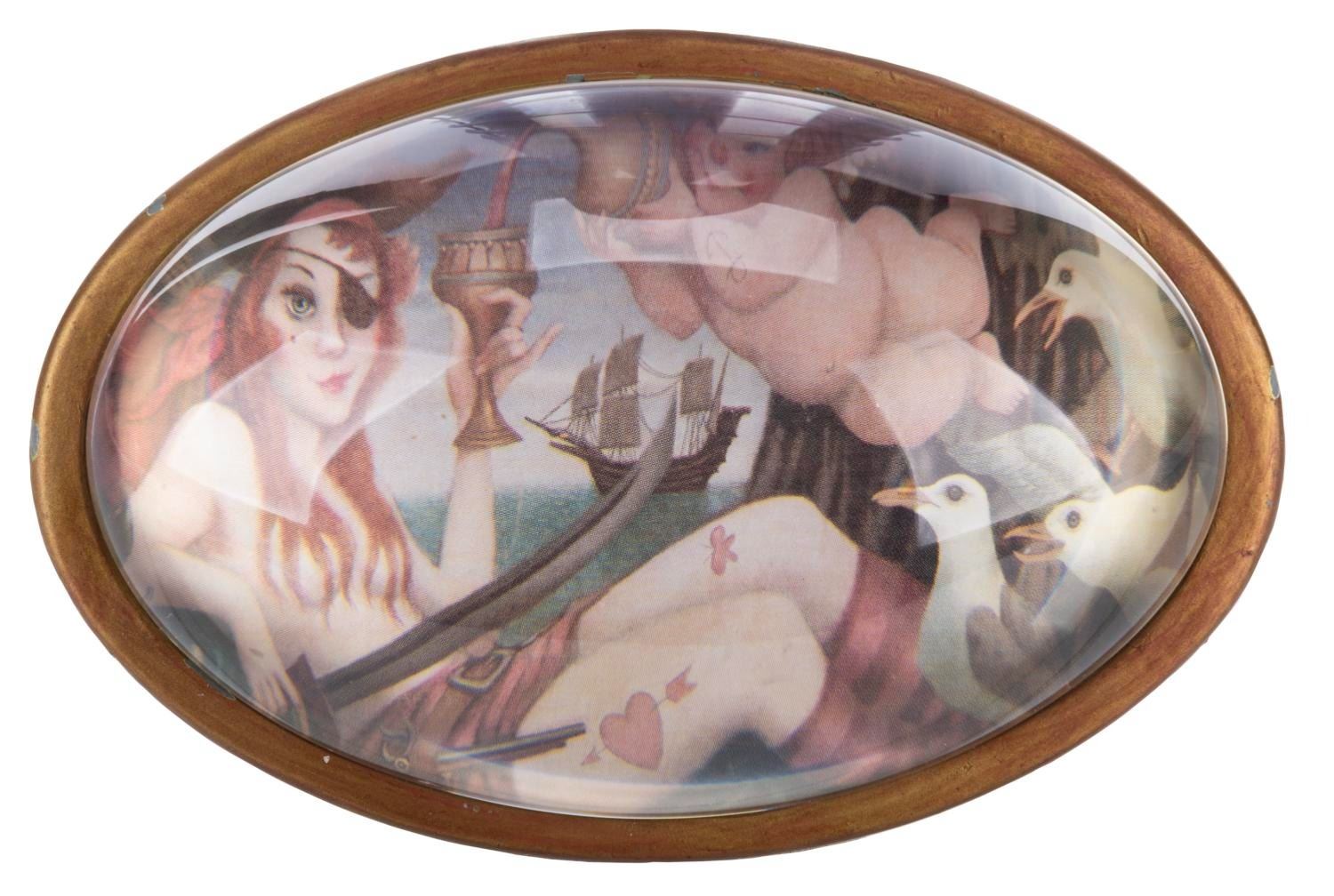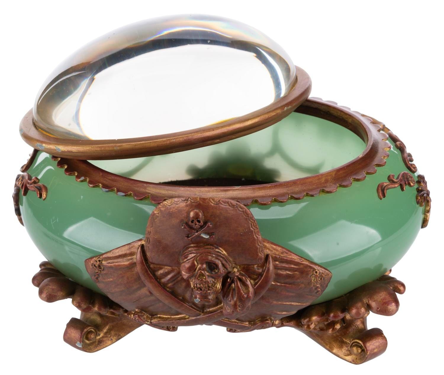 (Disneyland, 2005) A Pirates of the Caribbean jewelry box with a removable lid, released in a limited edition of 1000. Inside the dome lid is a recreation of Marc Davis' "Portrait of Things to Come," which Guests see during the attraction. Measuring 5.75” x 7” x 4.5” tall, the jewelry box displays in good condition with scratches, chips, wear, and scuffs throughout.