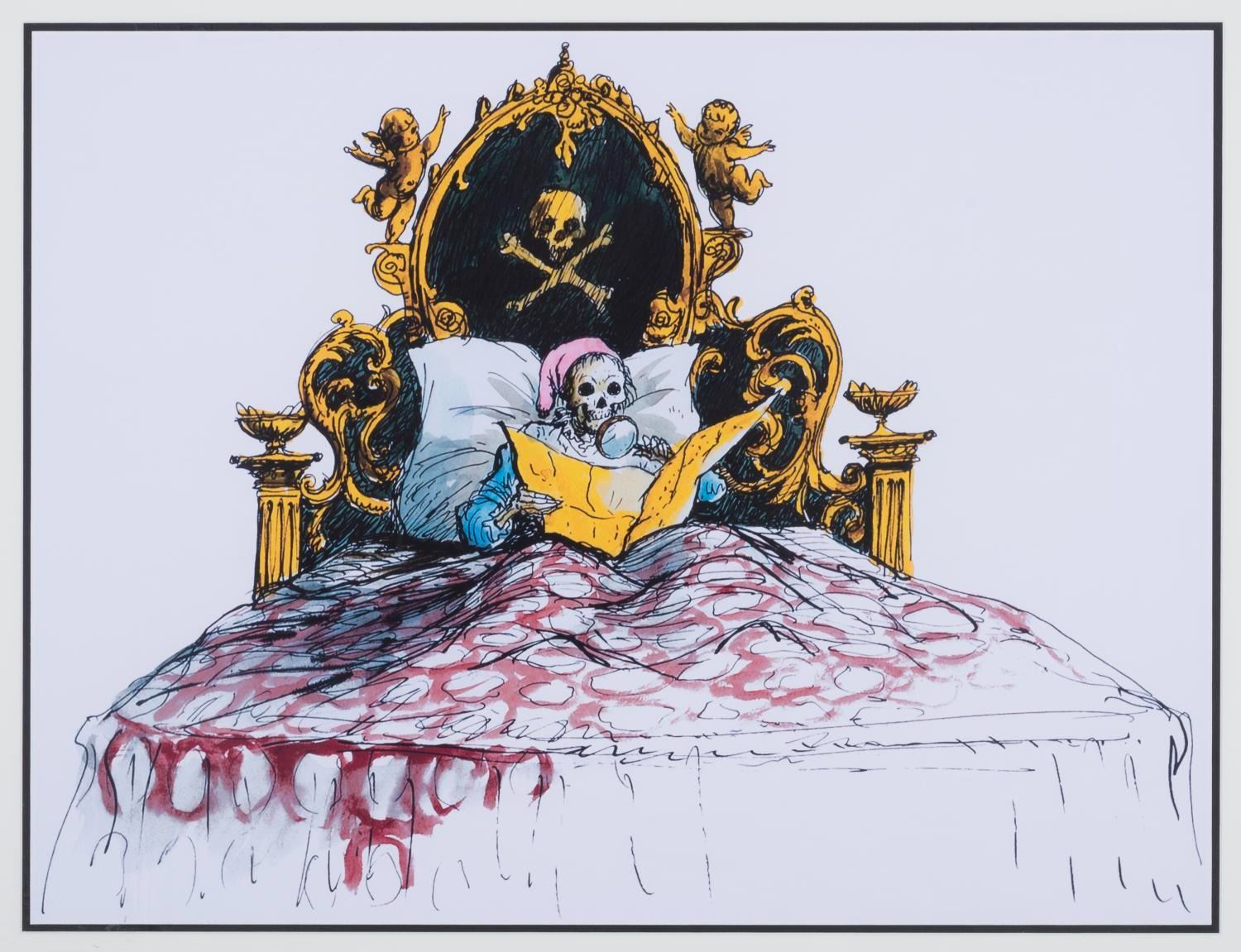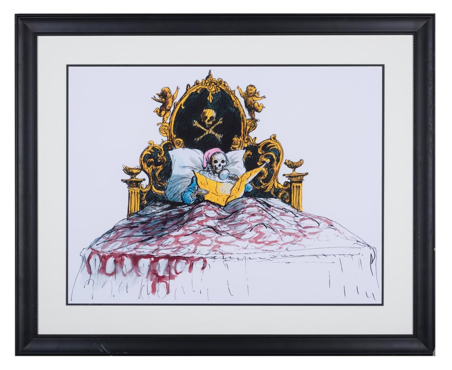 (Disneyland, 2000s) A Pirates of the Caribbean print featuring development art of a skeleton pirate. The image measures 27.5"x21" within a 39"x31.5" frame and is in very good condition, exhibiting some wear and a few chips to its frame.