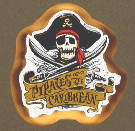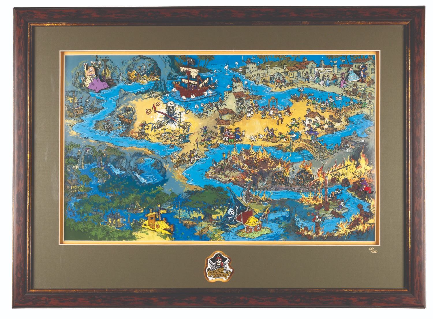 (Disneyland, 2003) A Pirates of the Caribbean Map pin set. This reproduction of Sam McKim's classic Pirates map is accented with 9 cloisonne pins highlighting key scenes and was released in a limited edition of only 150 pieces. The map has a visible size of 19.75" x 11.75" with pins measuring from 1.5" x 1.5" to 3" x 3". The entire piece measures 19" x 26" and is in fine condition.