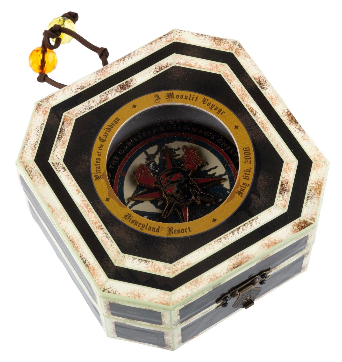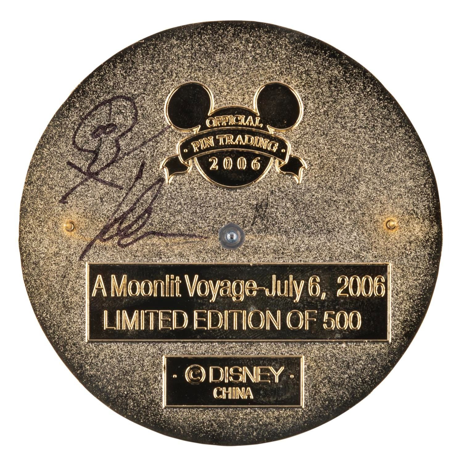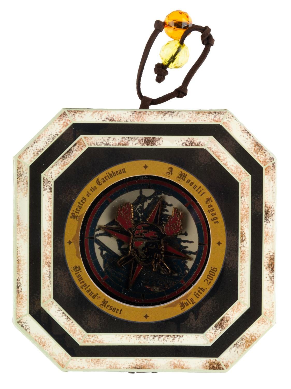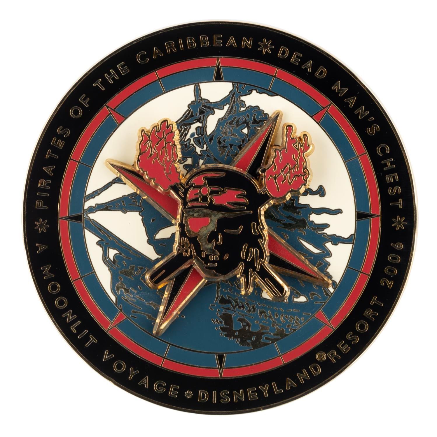(Disneyland, 2006) A jumbo pin commemorating the Pirates of the Caribbean Moonlit Voyage, signed by artist Jeff Granito. The compass-themed pin was created in a limited edition of 500 for a special event at Disneyland, has a spinner feature, and comes with its original window box. Measuring 3" in diameter, this pin is in fine condition.
